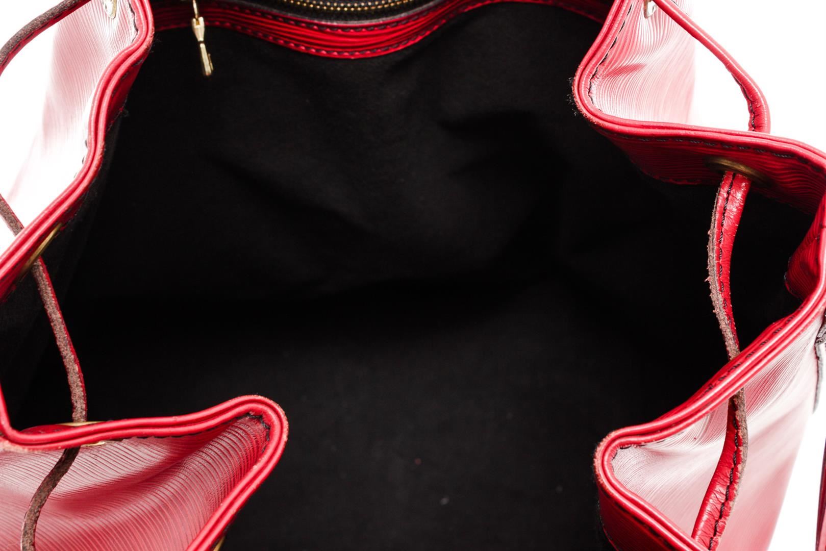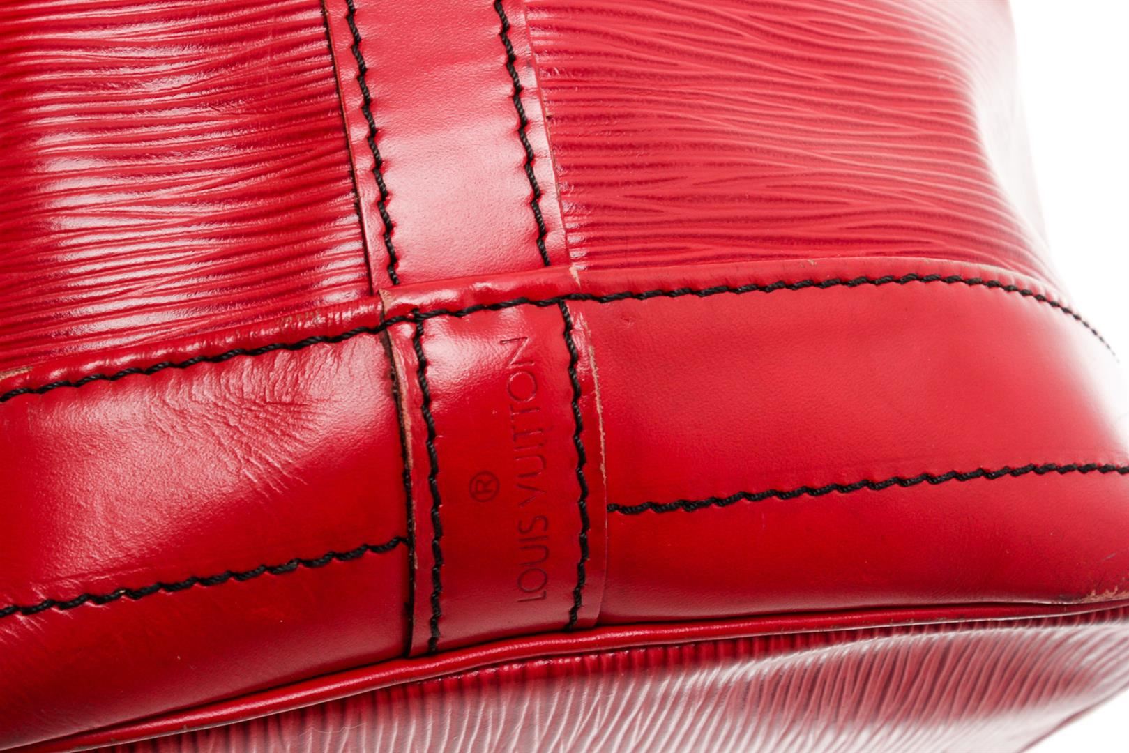 Red Epi leather Louis Vuitton Noe GM with brass hardware, single adjustable shoulder strap, tonal leather trim, embossed logo at exterior side, Alcantara lining and drawstring closure at top.
