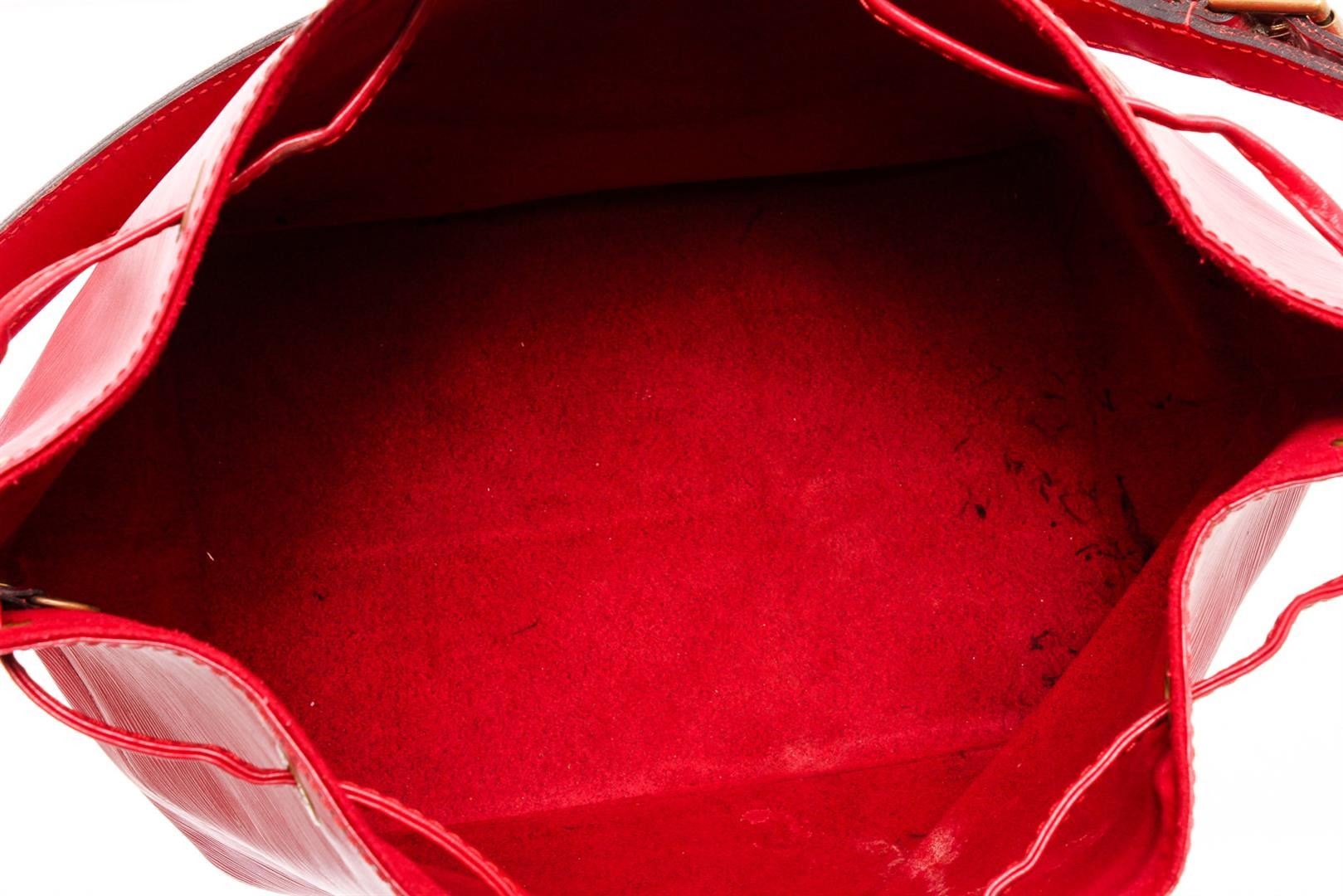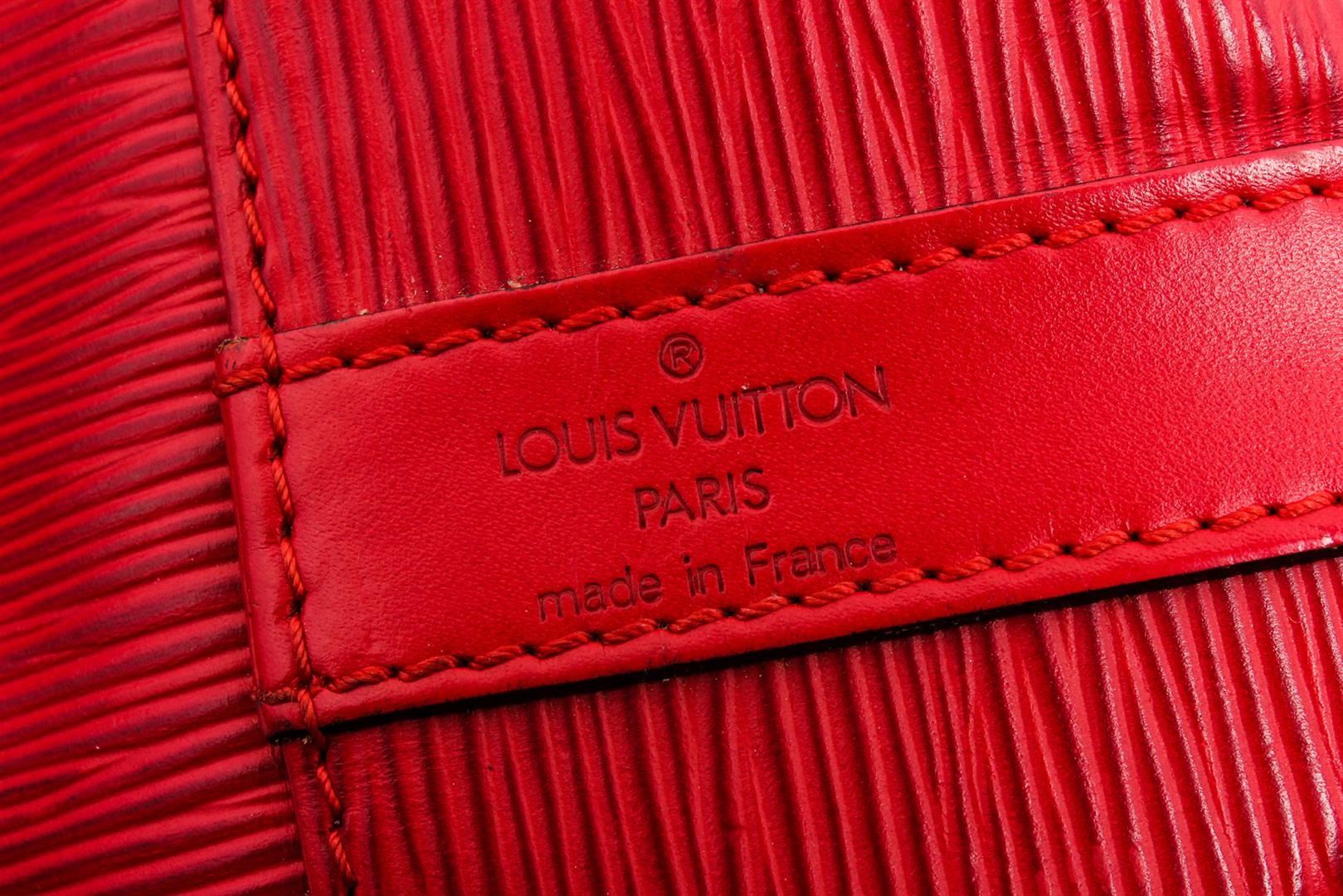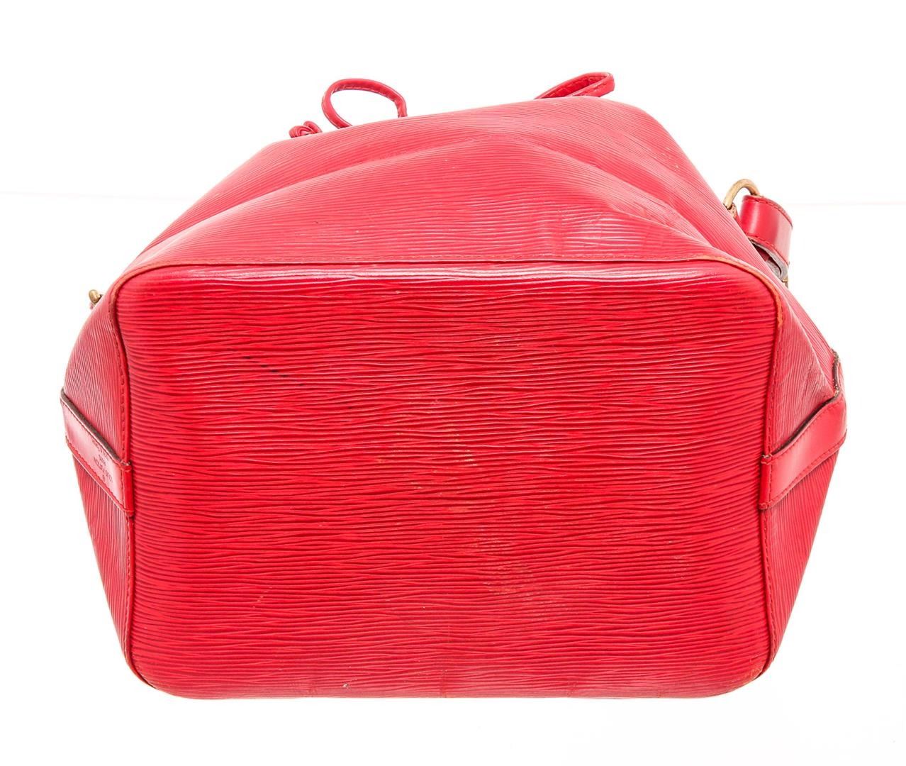 Red Epi leather Louis Vuitton Noe GM with brass hardware, single adjustable shoulder strap, tonal leather trim, embossed logo at exterior side, Alcantara lining and drawstring closure at top.