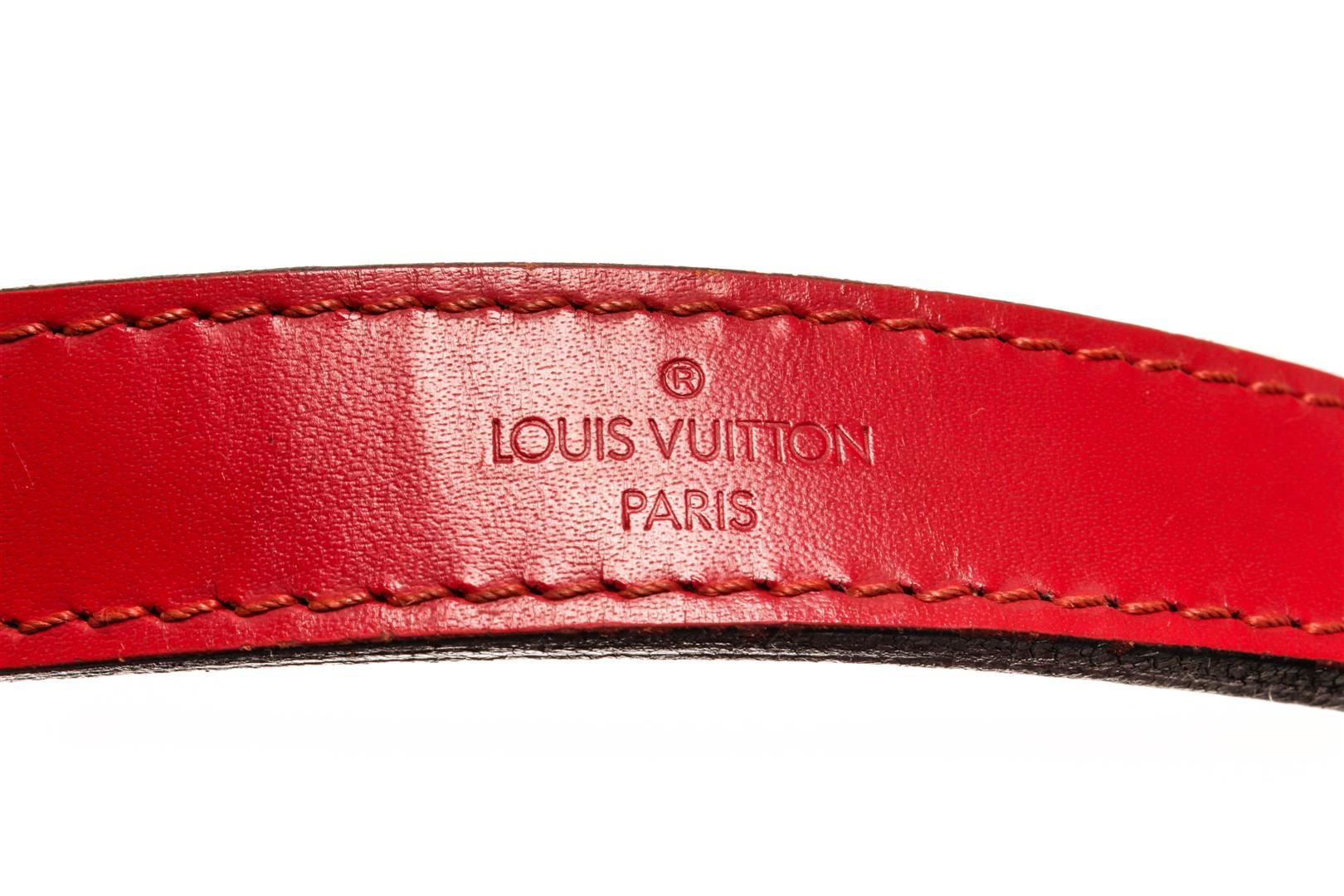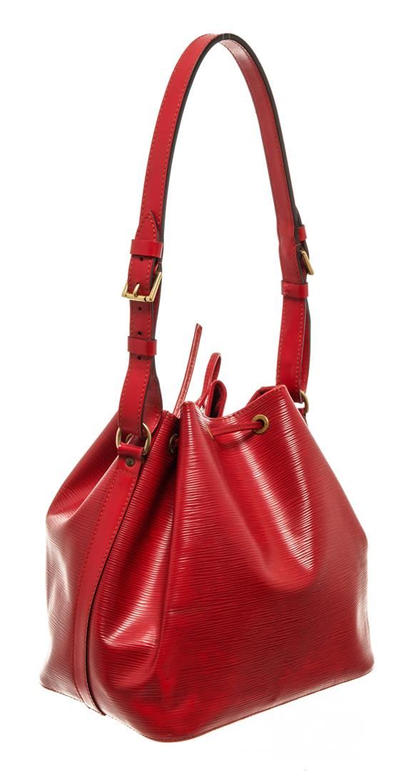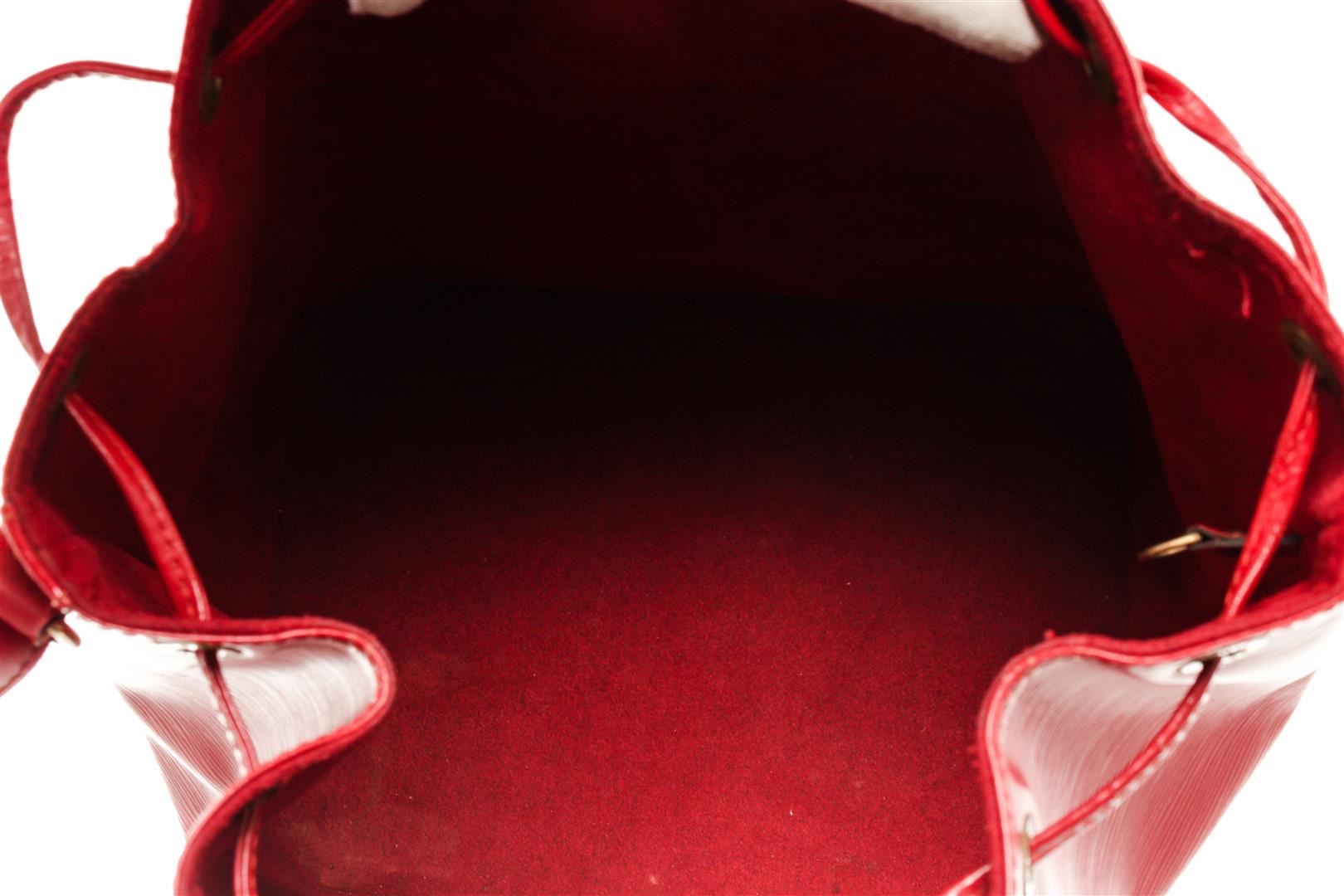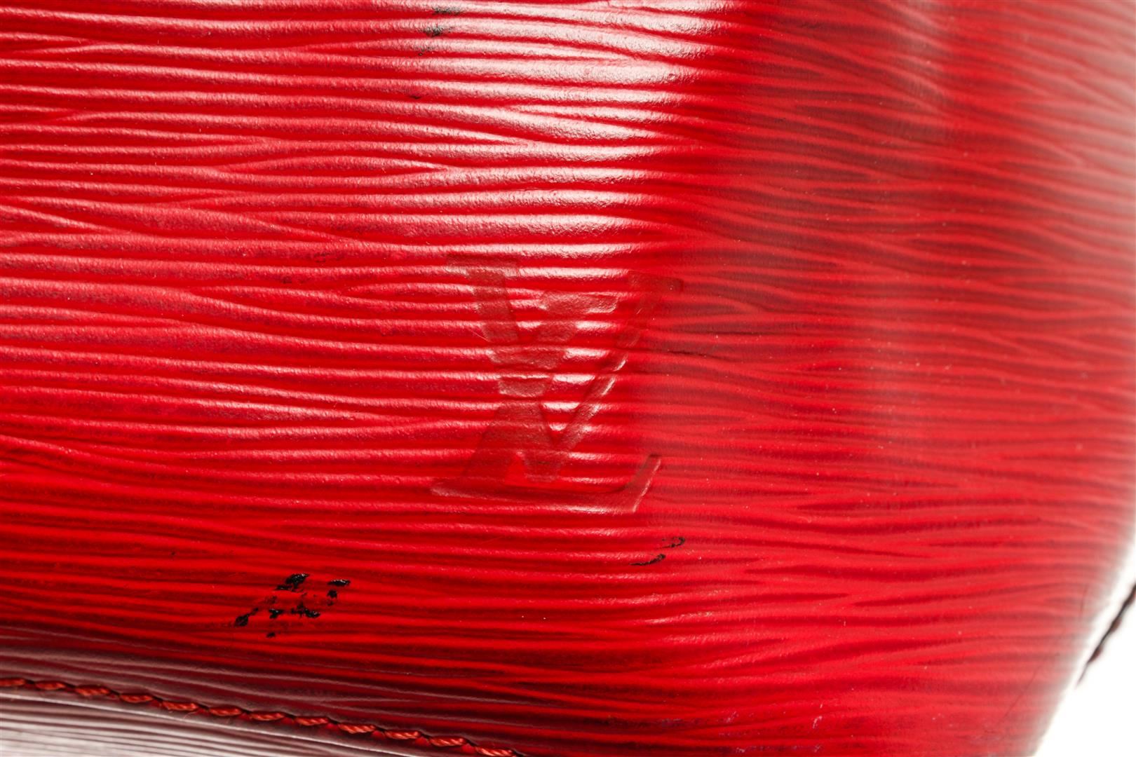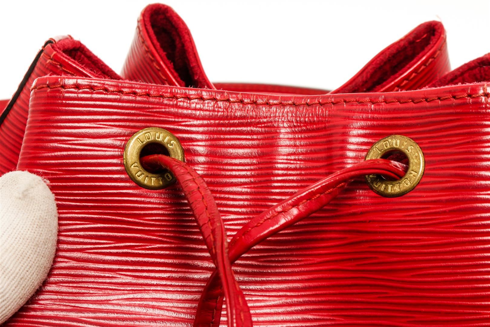 One Louis Vuitton Red Epi Leather Noe GM Shoulder Bag. Item is sold AS-IS. All available information is listed in the description and shown in the photo. louis vuitton bucket bag, rouge epi leather, brass hardware, single adjustable shoulder strap, alcantara lining, drawstring closure at top Height: 13.5", Width: 10.5", Depth: 7.25" / 34.29 x 26.67 x 18.41 CM