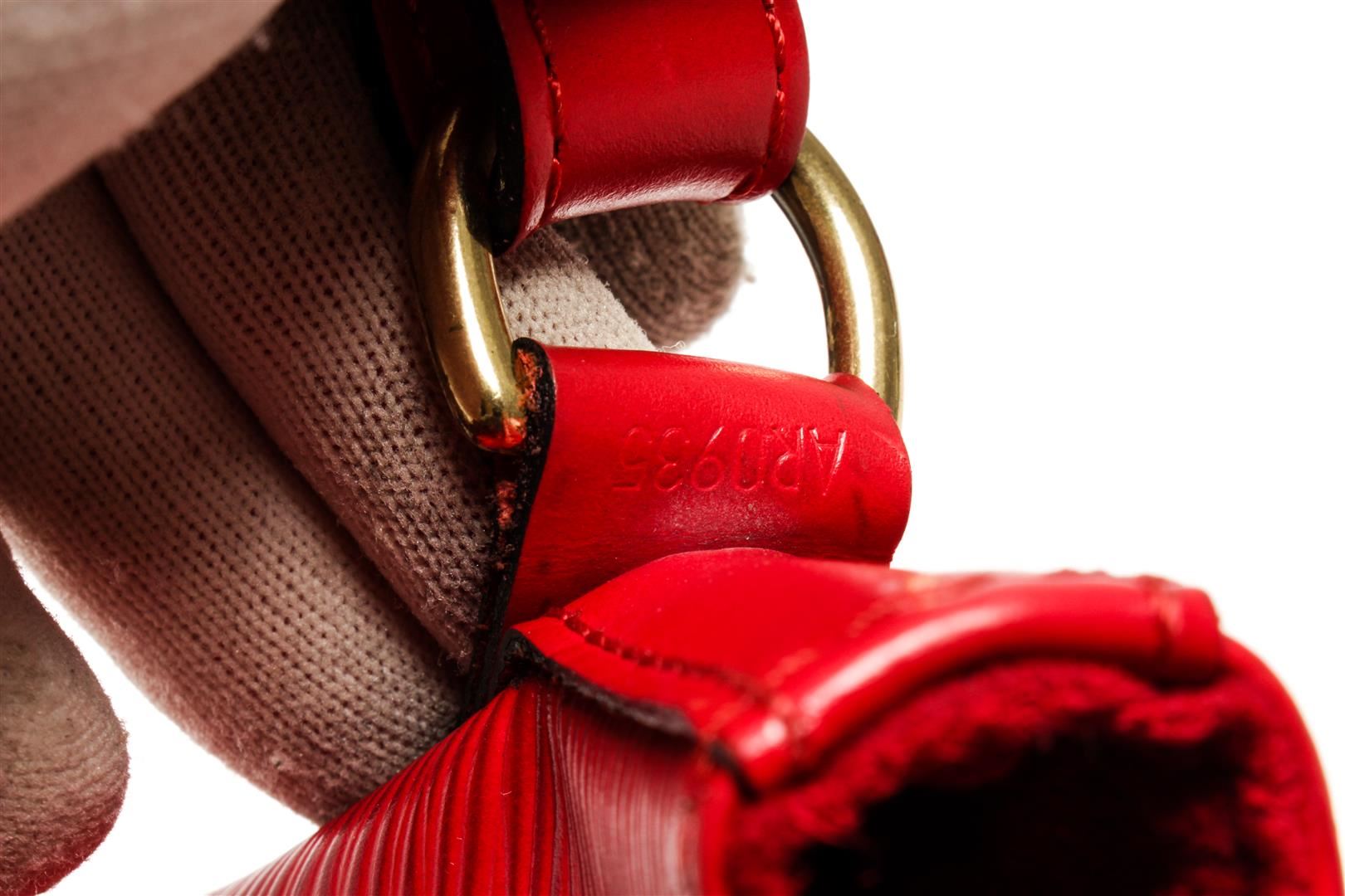 One Louis Vuitton Red Epi Leather Noe PM Bag. Item is sold AS-IS. All available information is listed in the description and shown in the photo. Louis Vuitton Red Epi Leather Petit Noe Bag with gold-tone hardware, red leather trim, red suede lining, single adjustable leather shoulder strap, and drawstring closure. .