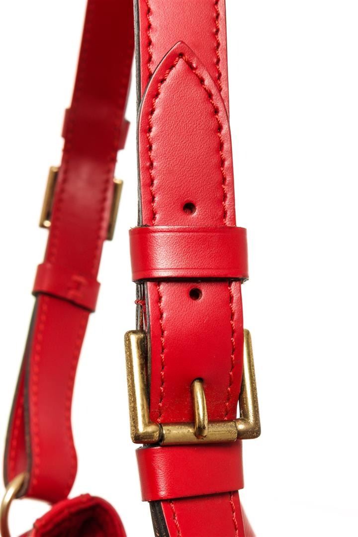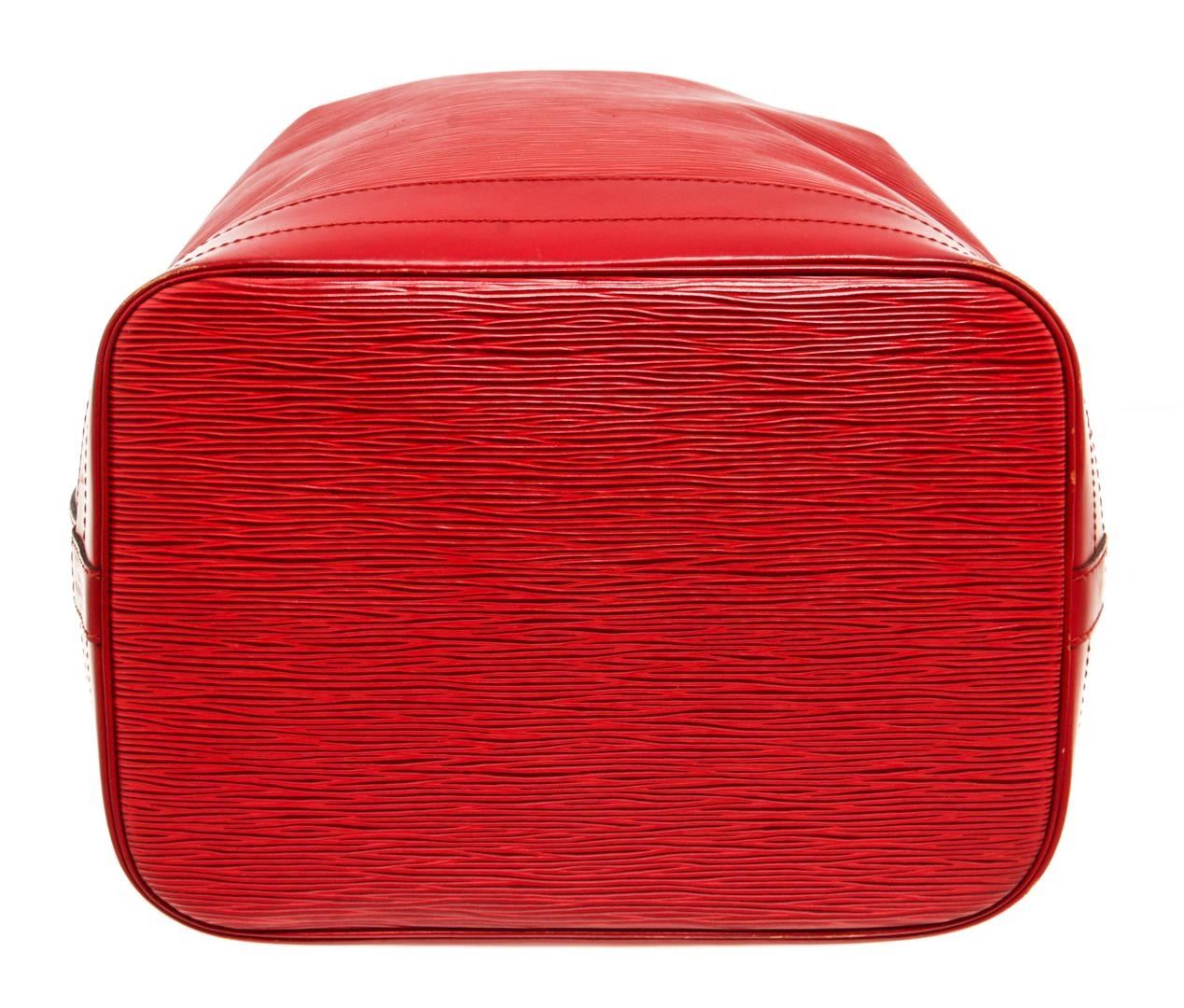 One Louis Vuitton Red Epi Leather Noe PM Bag. Item is sold AS-IS. All available information is listed in the description and shown in the photo. Louis Vuitton Red Epi Leather Petit Noe Bag with gold-tone hardware, red leather trim, red suede lining, single adjustable leather shoulder strap, and drawstring closure. .