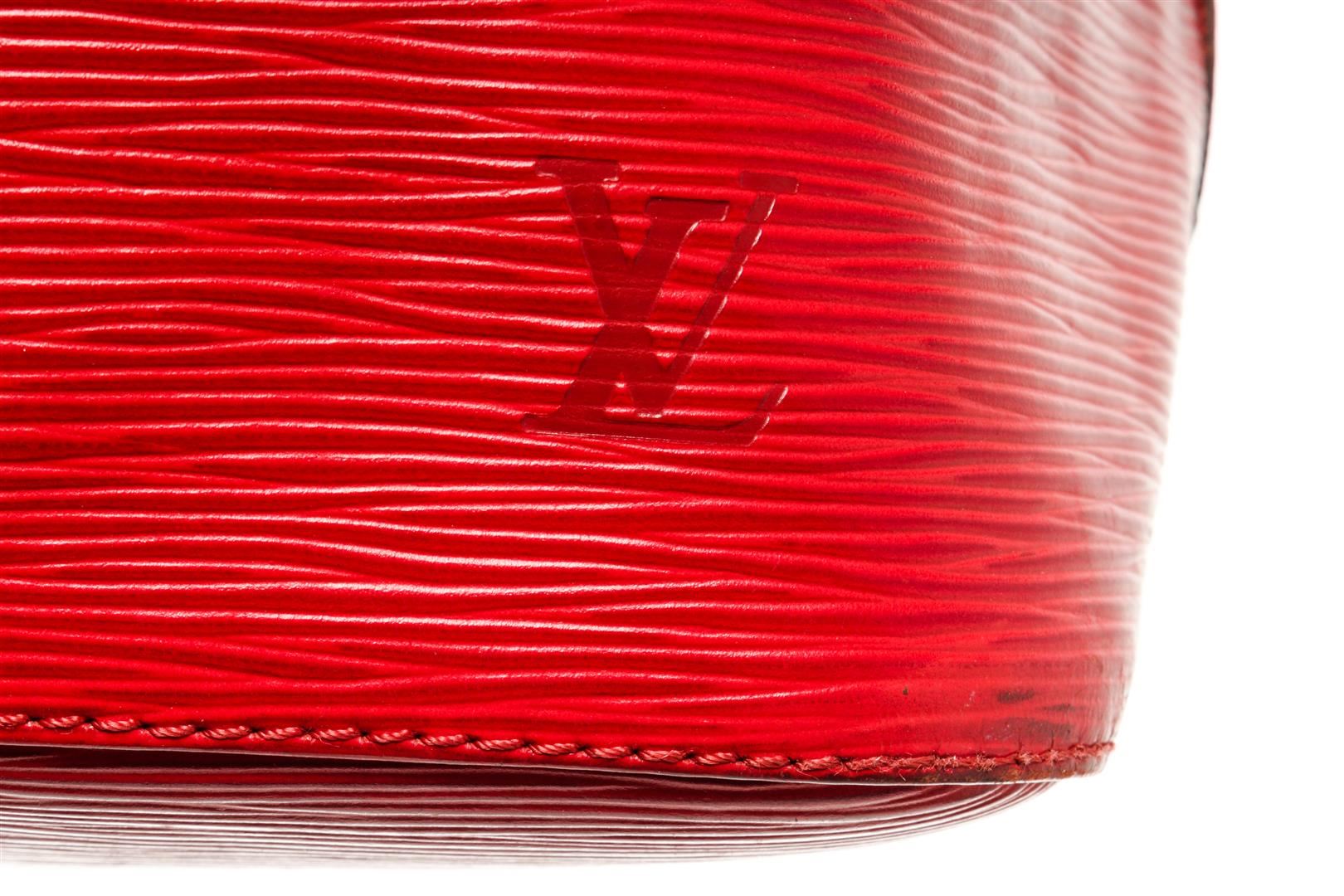 One Louis Vuitton Red Epi Leather Noe PM Bag. Item is sold AS-IS. All available information is listed in the description and shown in the photo. Louis Vuitton Red Epi Leather Petit Noe Bag with gold-tone hardware, red leather trim, red suede lining, single adjustable leather shoulder strap, and drawstring closure. .
