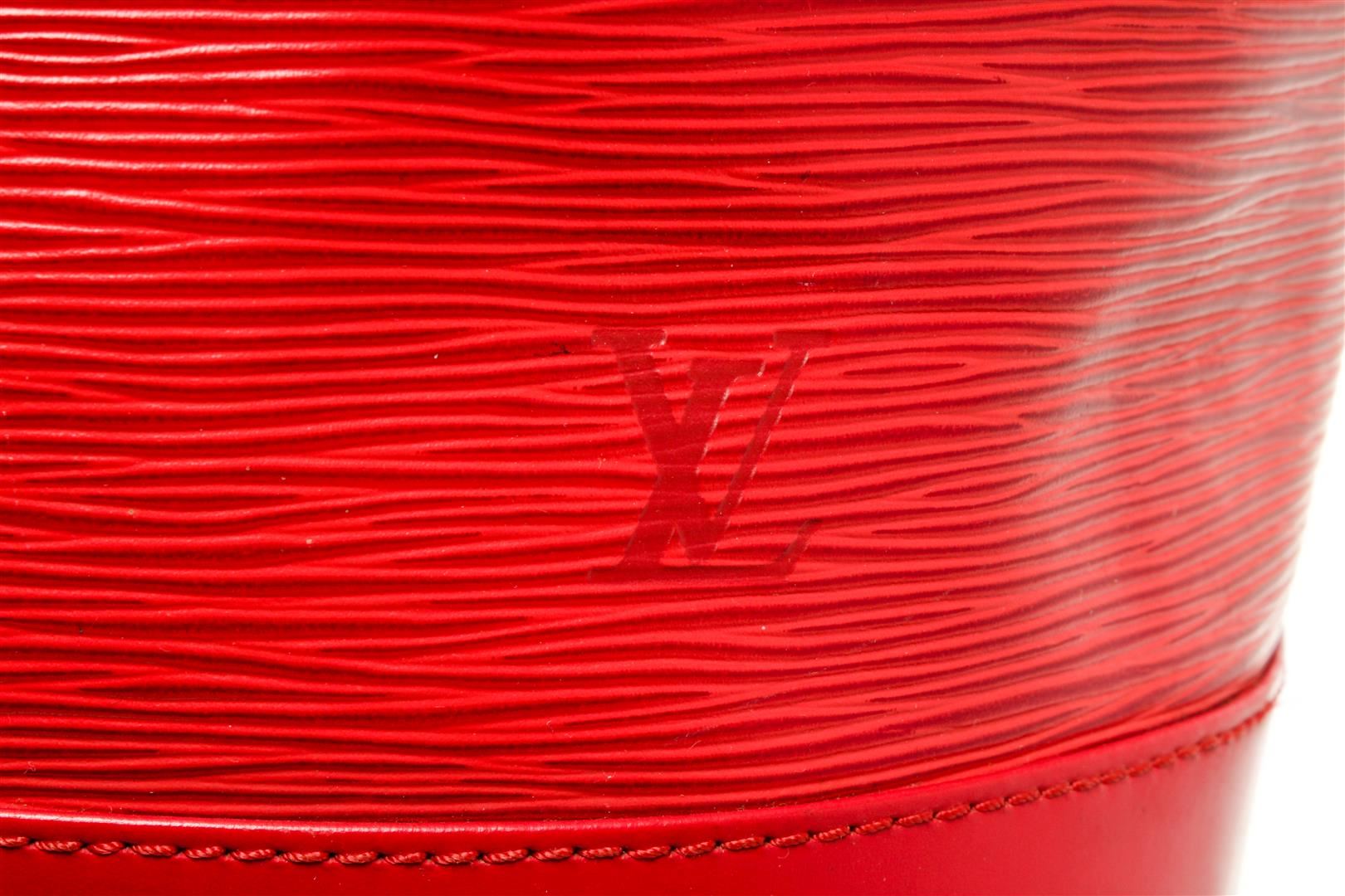 One Louis Vuitton Red Epi Leather Noe PM Bag. Item is sold AS-IS. All available information is listed in the description and shown in the photo. Louis Vuitton Red Epi Leather Petit Noe Bag with gold-tone hardware, red leather trim, red suede lining, single adjustable leather shoulder strap, and drawstring closure. .