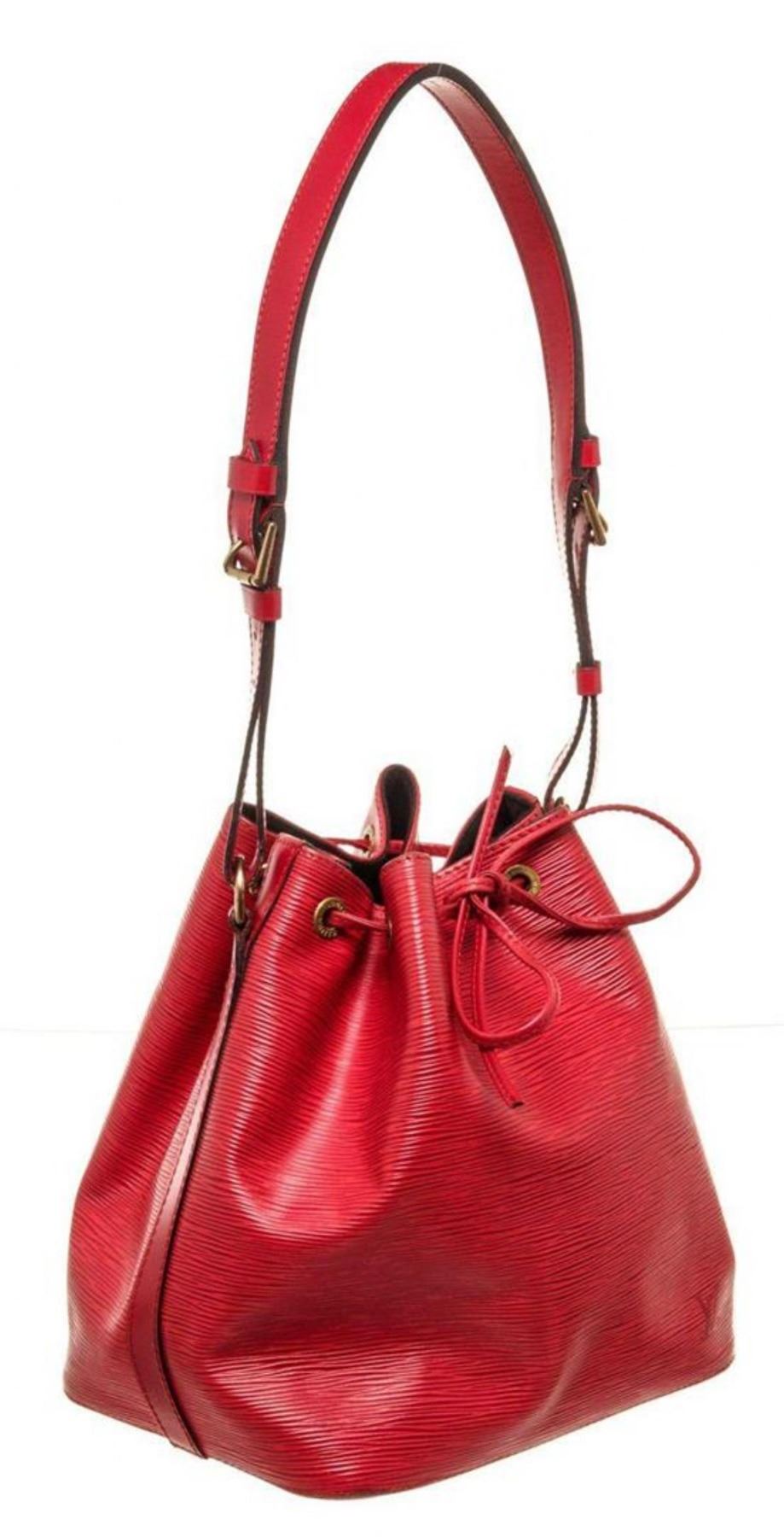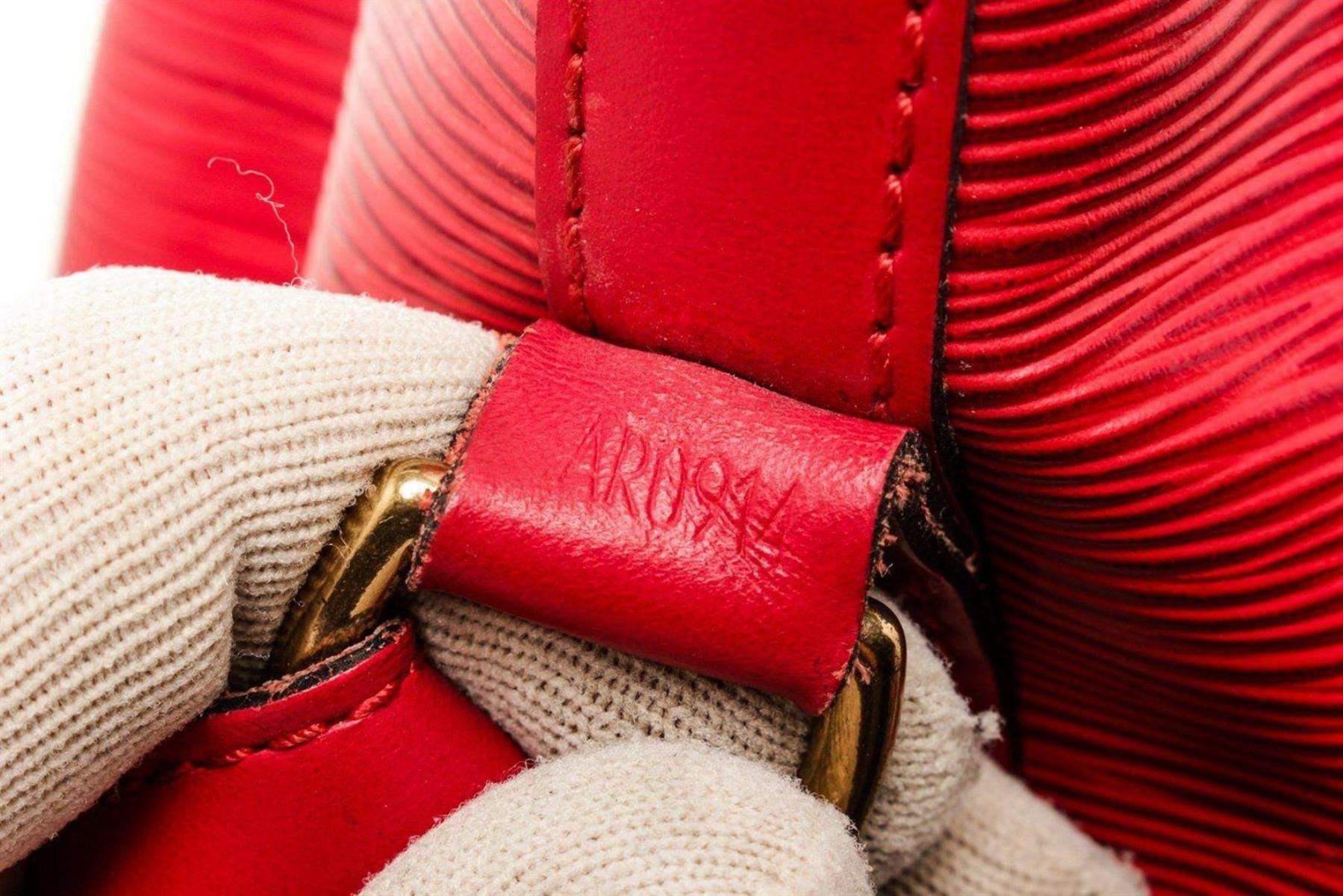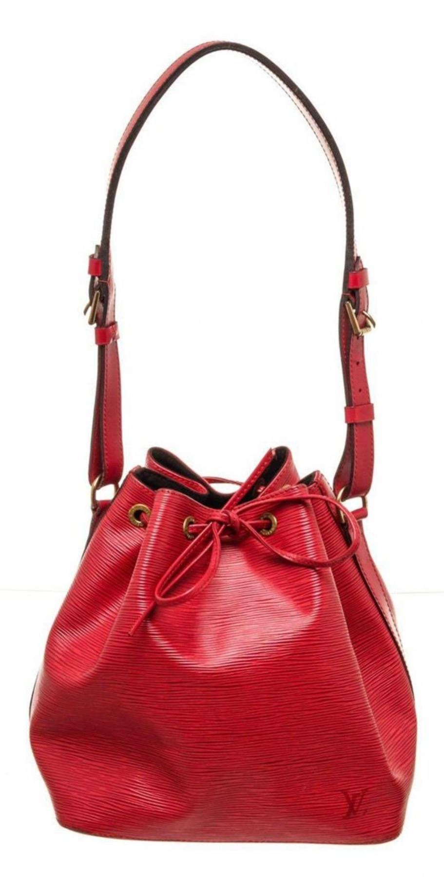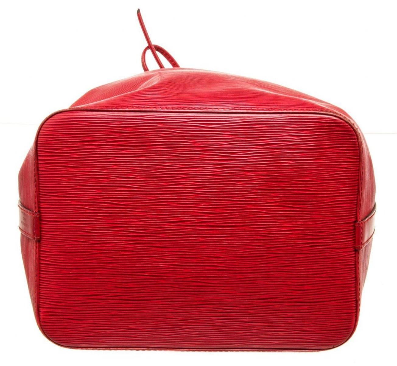 Louis Vuitton Red Epi Leather Noe PM Bucket Bag with epi leather, silver-tone hardware, tan vachetta leather trim, leather shoulder strap, and drawstring closure.