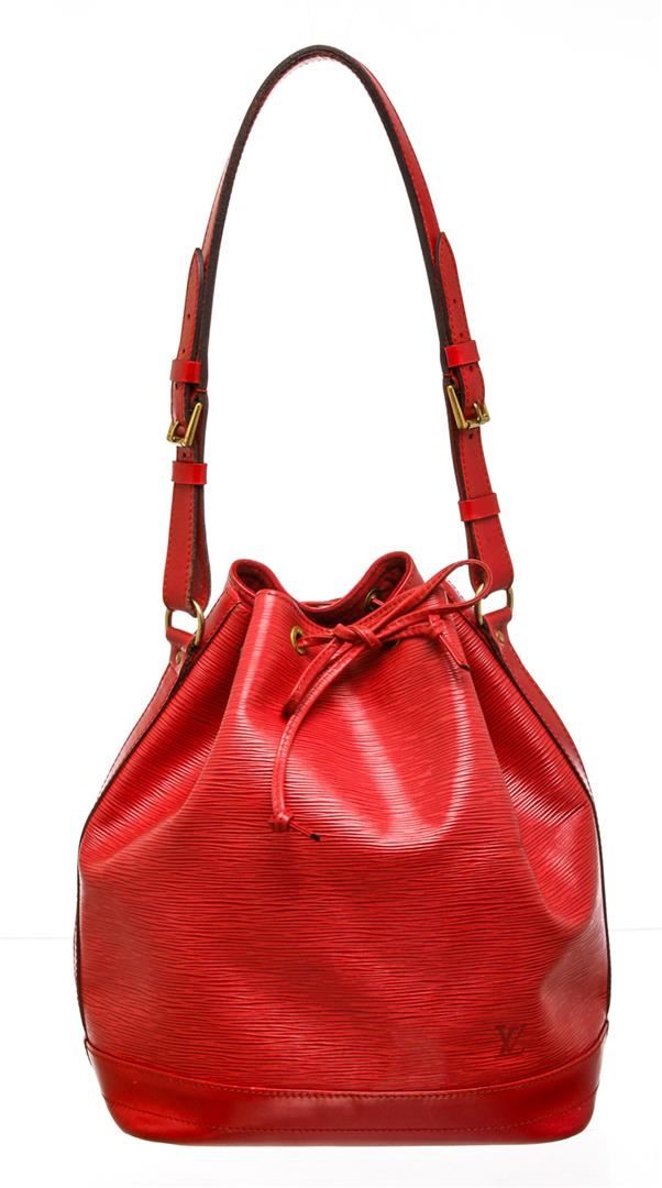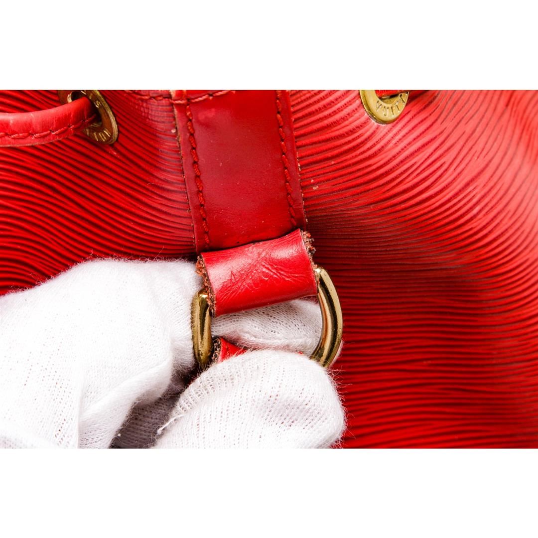Epi leather Louis Vuitton Noe PM with brass hardware, adjustable flat shoulder strap, tonal Alcantara lining and drawstring closure at top.
