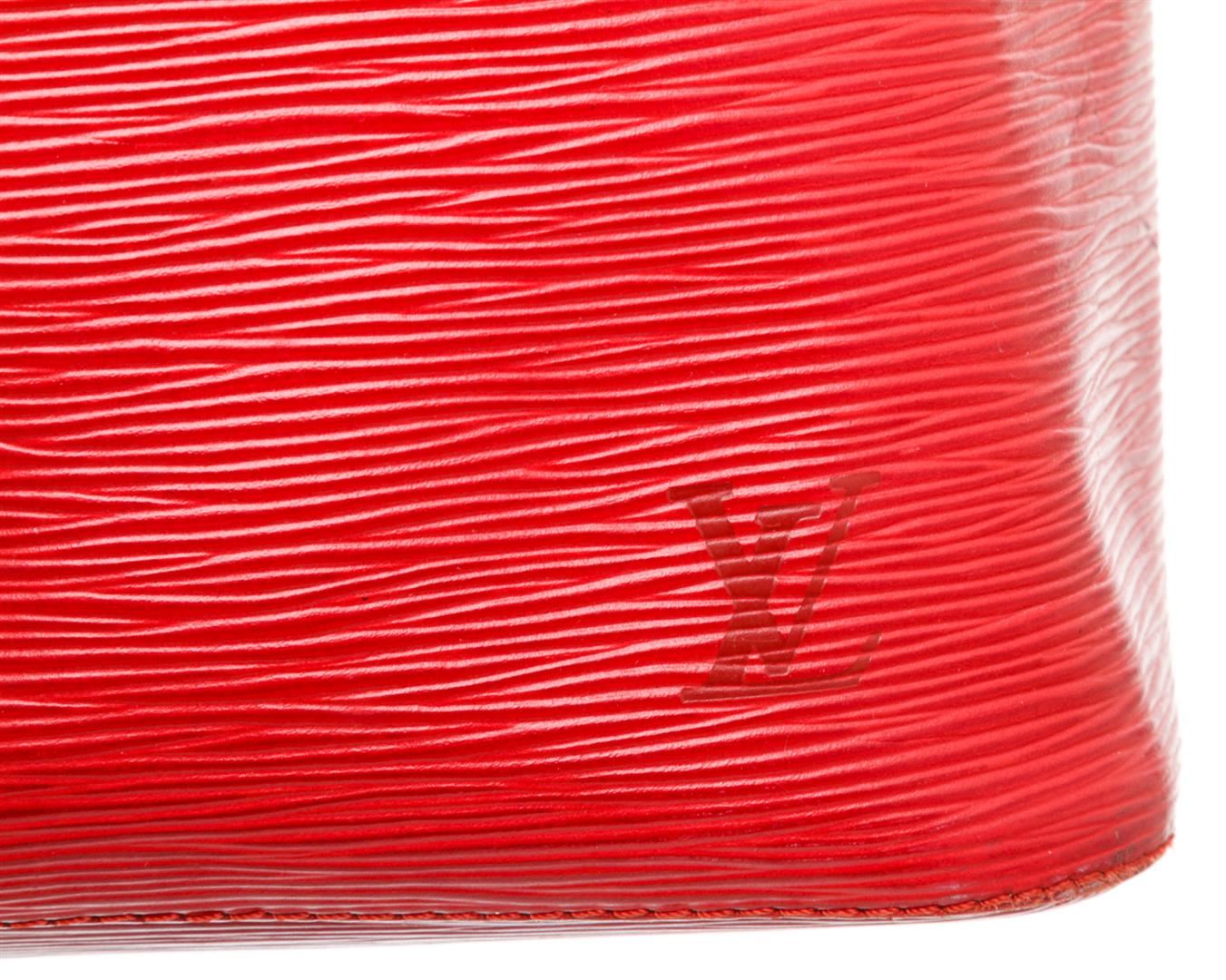 Red Epi leather Louis Vuitton Noe PM with brass hardware, adjustable flat shoulder strap, tonal Alcantara lining and drawstring closure at top. Authentic.