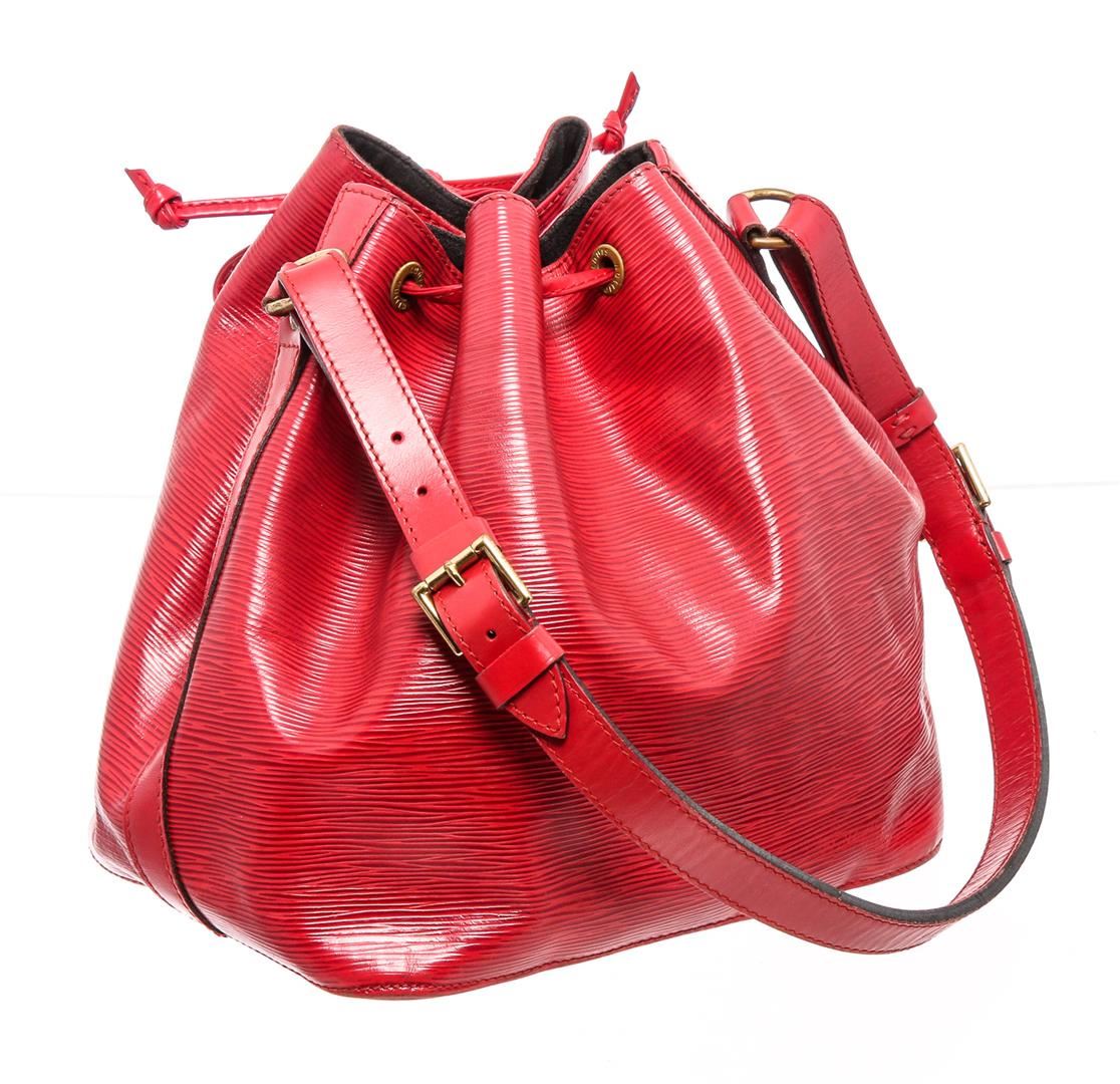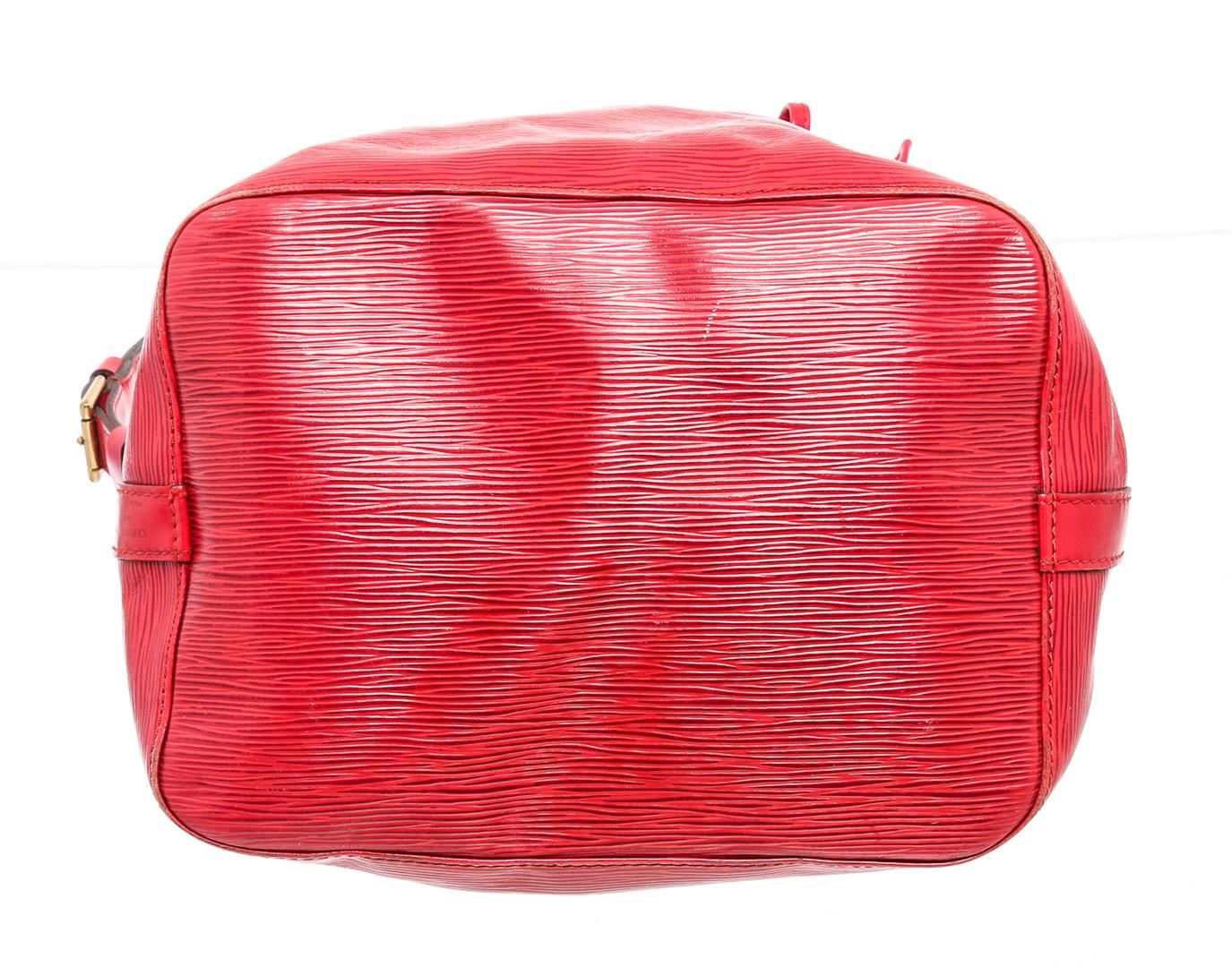 Red Epi leather Louis Vuitton Noe PM with brass hardware, adjustable flat shoulder strap, tonal Alcantara lining and drawstring closure at top.