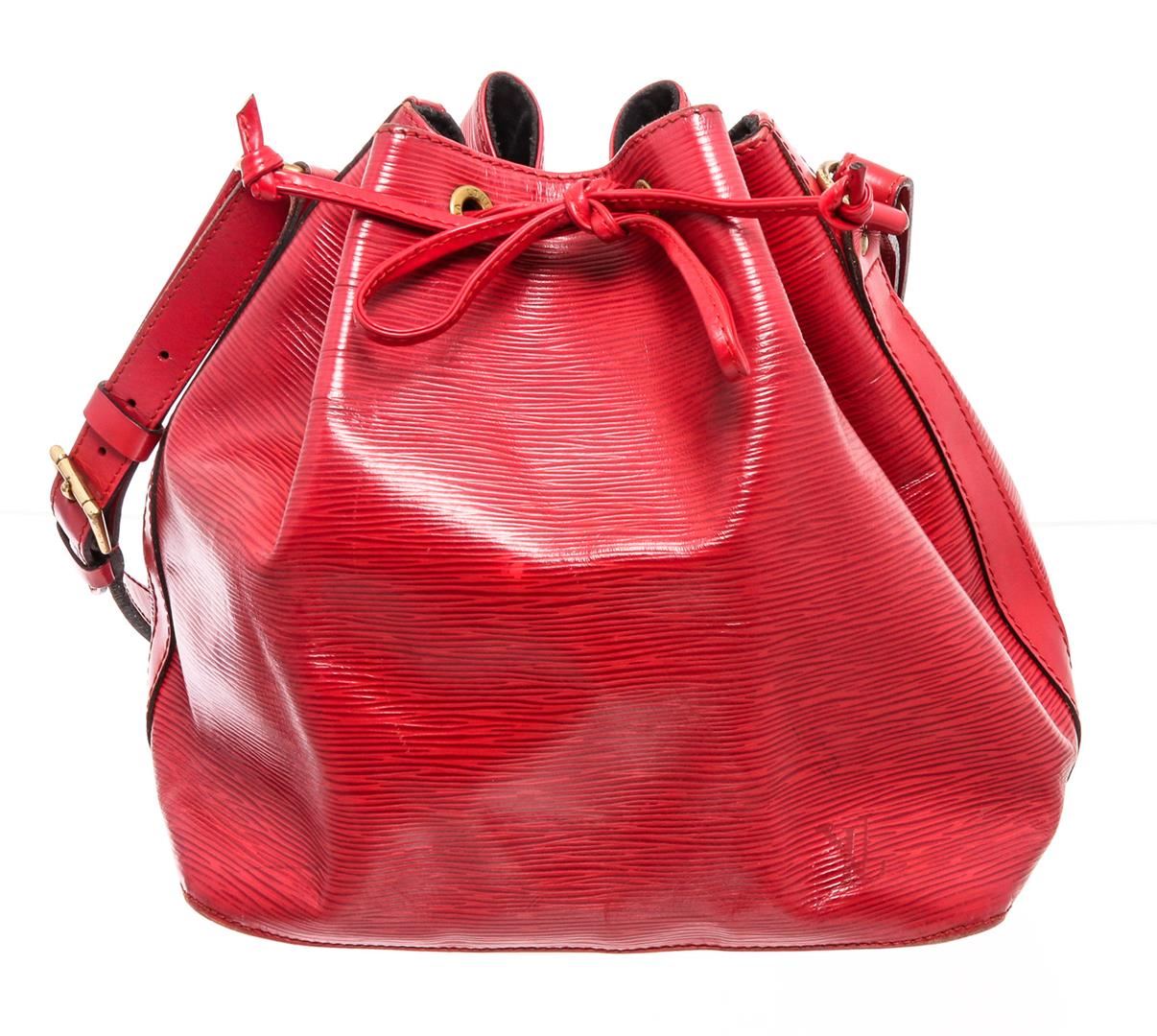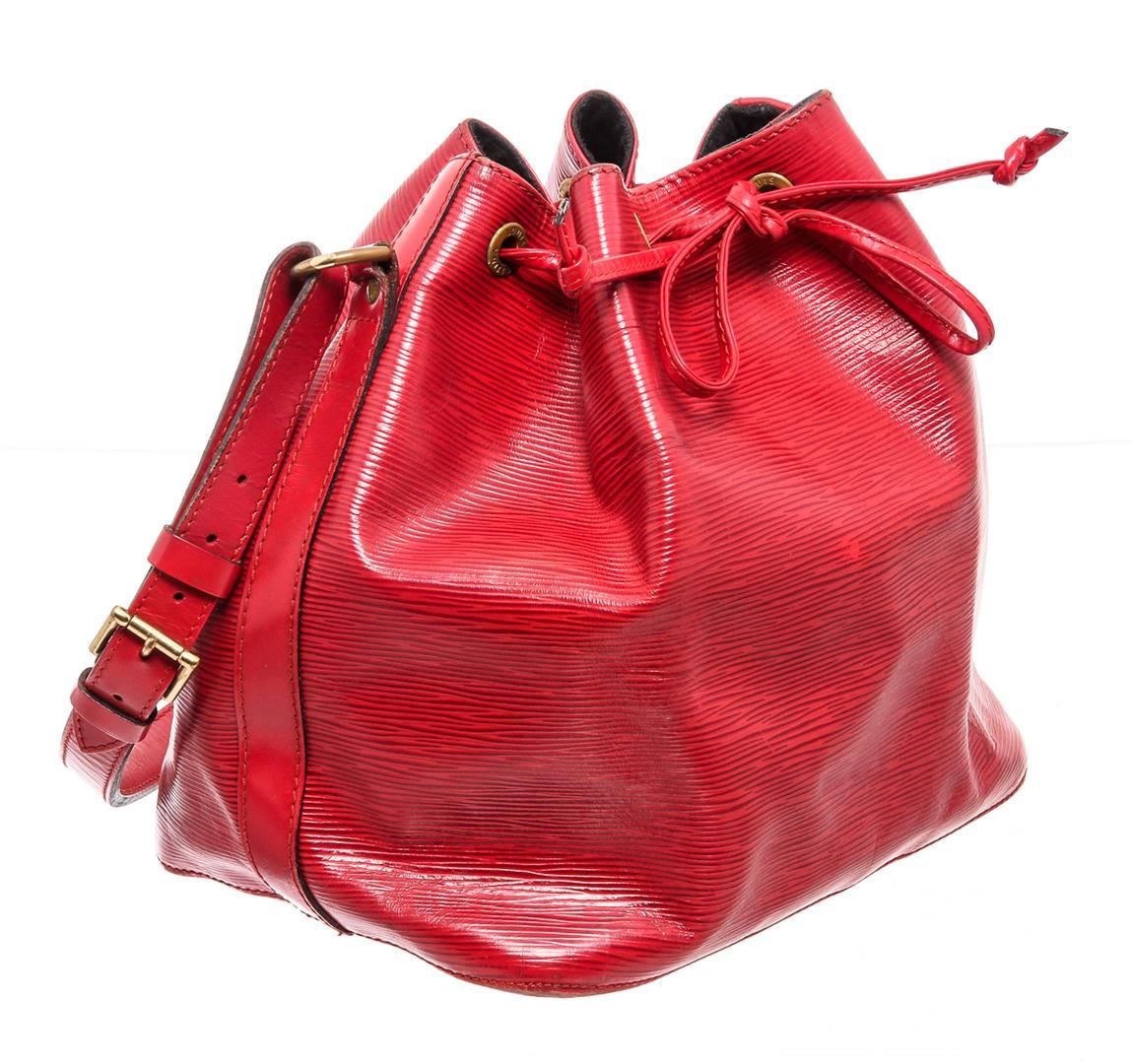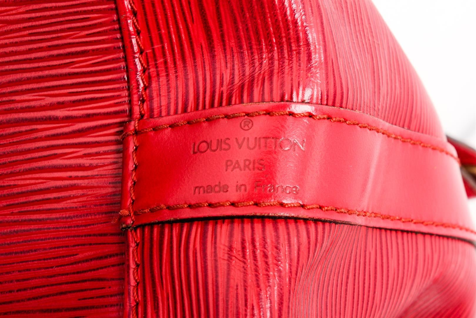 Red Epi leather Louis Vuitton Noe PM with brass hardware, adjustable flat shoulder strap, tonal Alcantara lining and drawstring closure at top.