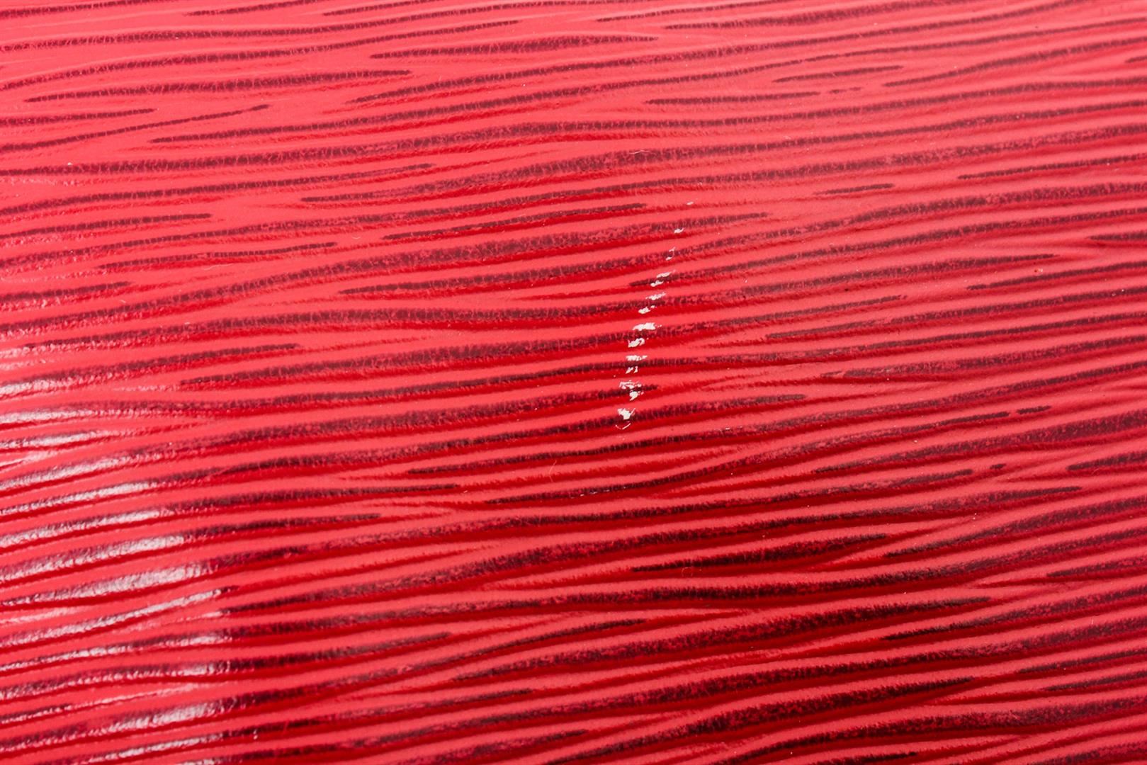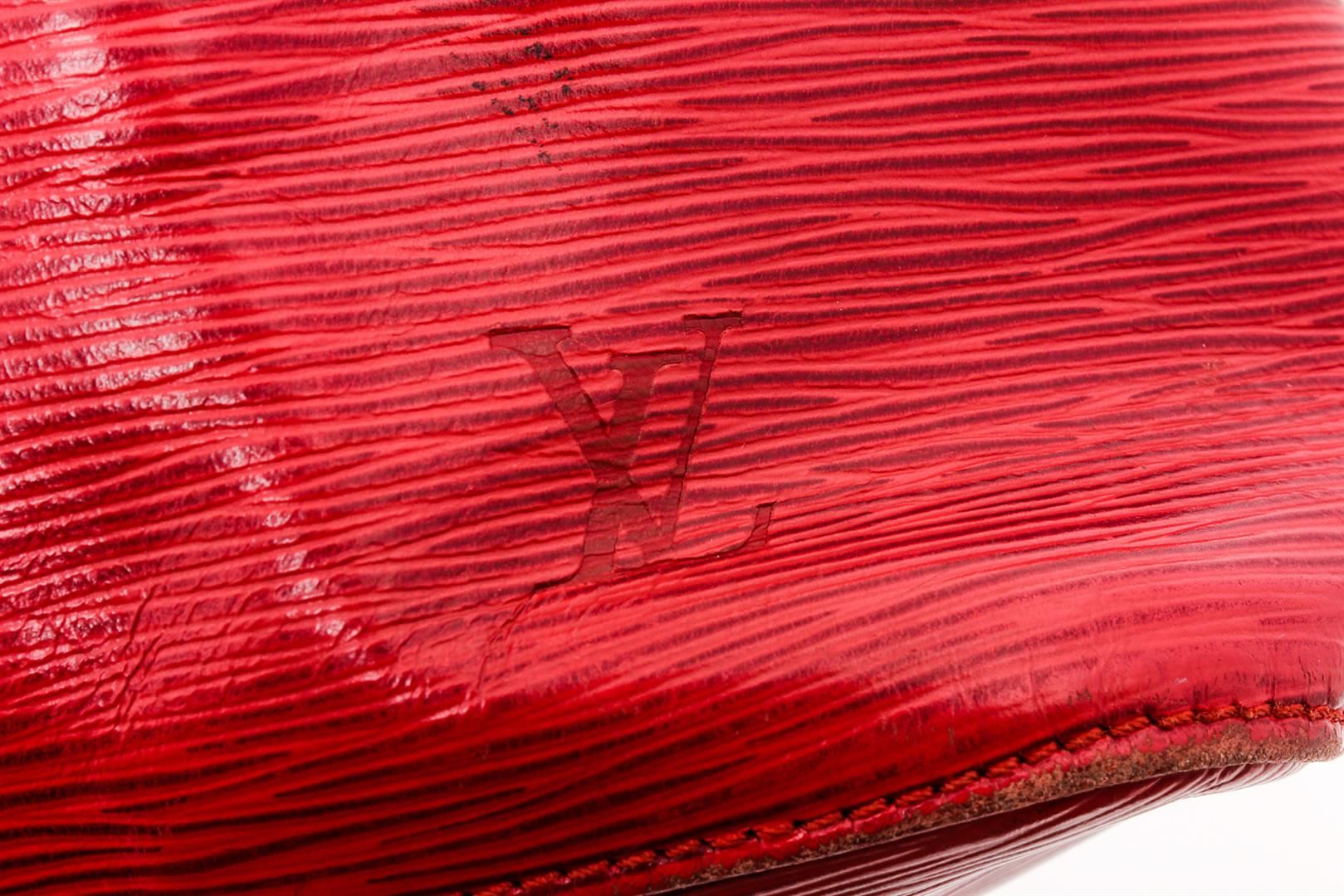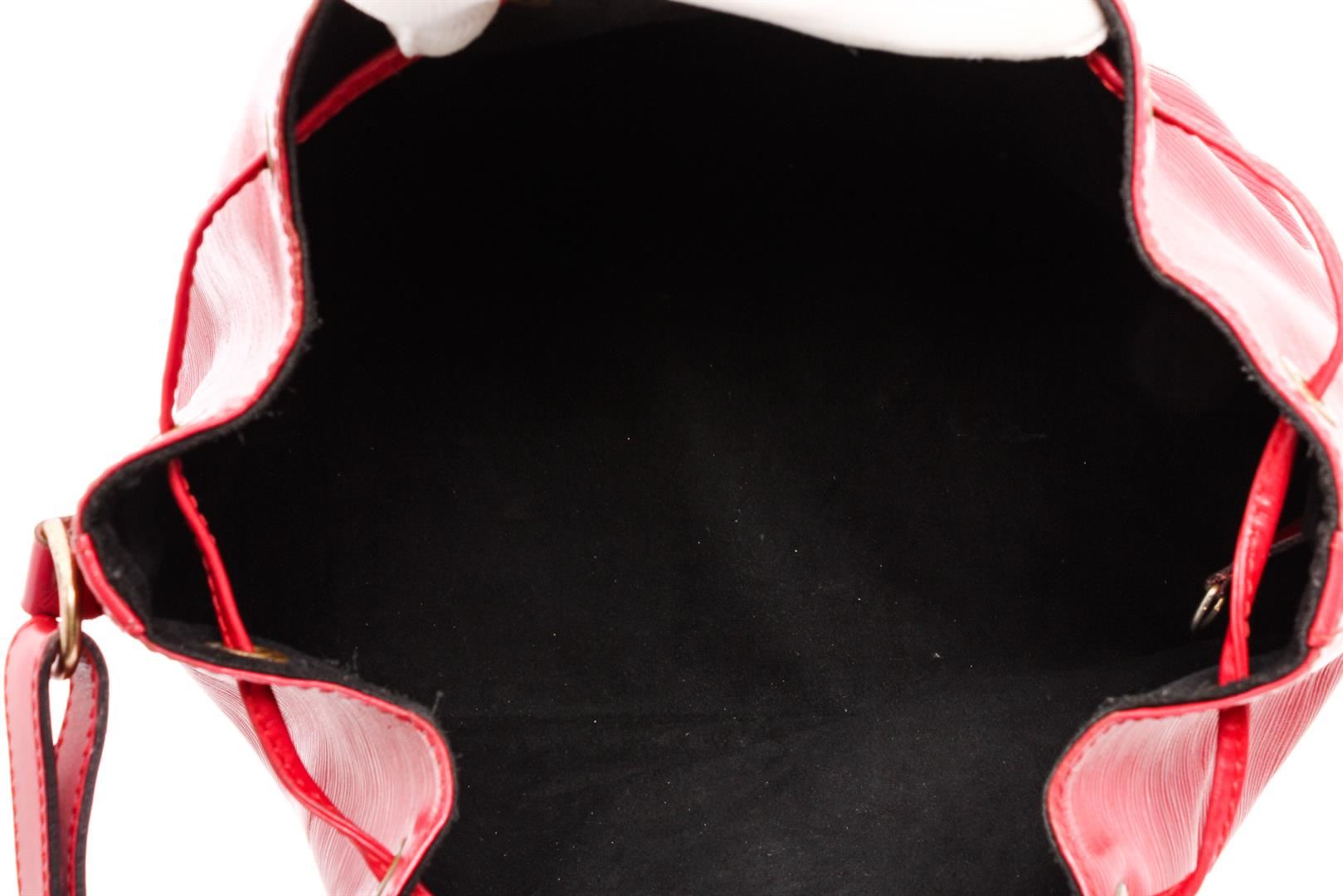 Red Epi leather Louis Vuitton Noe PM with brass hardware, adjustable flat shoulder strap, tonal Alcantara lining and drawstring closure at top.
