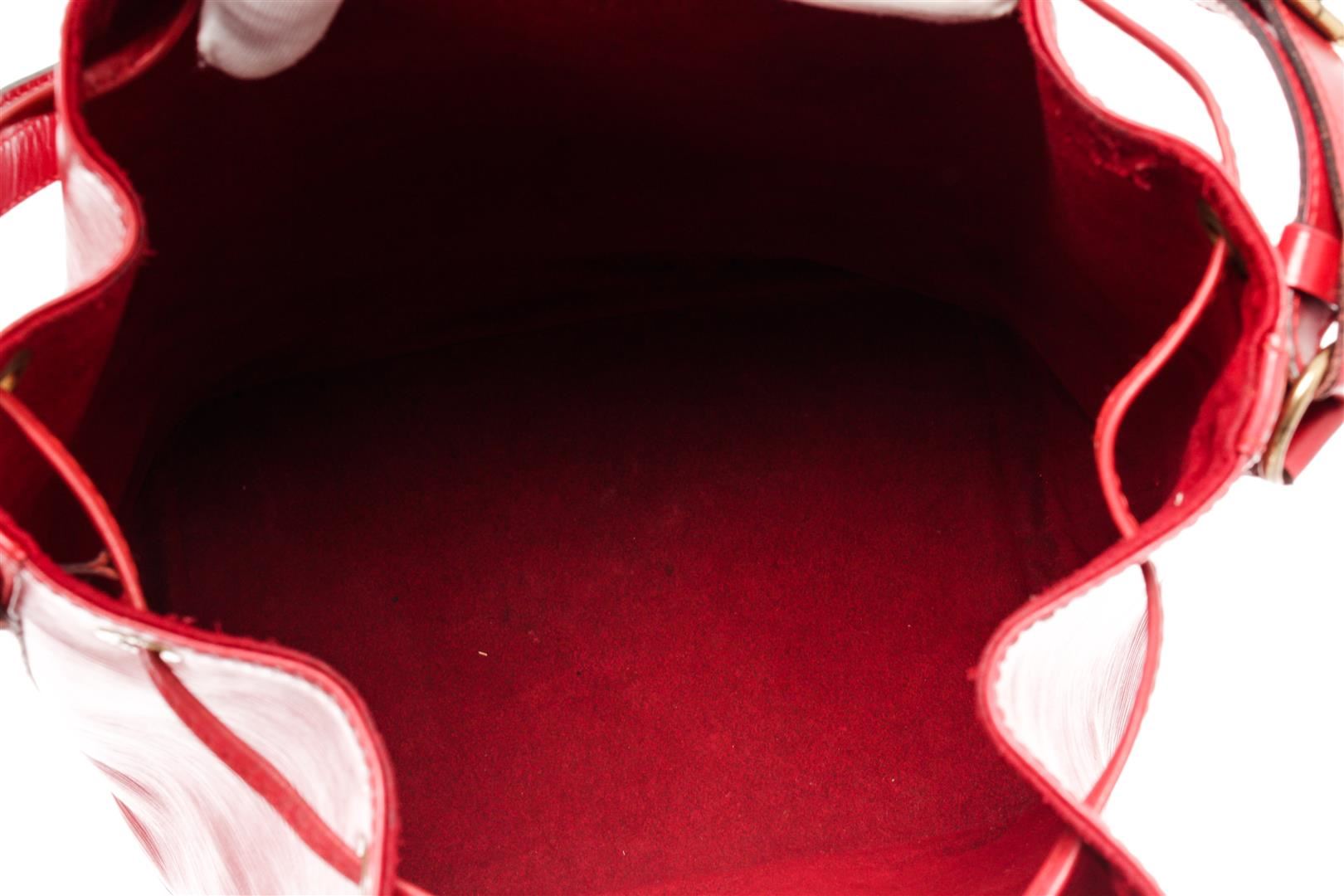 Louis Vuitton Red Epi Leather Noe Shoulder Bag. All available information is listed in the description and shown in the photos. Louis Vuitton Red Epi Leather Noe Shoulder Bag with red epi leather, printed, gold-tone hardware, single adjustable shoulder strap, alcantara lining, drawstring closure at top. Height: 13.5" Width: 10.5" Depth: 7.25" Shoulder Strap Drop: 9" / Height: 34.29 cm Width: 26.67 cm Depth: 18.41 cm Shoulder Strap Drop: 22.86 cm