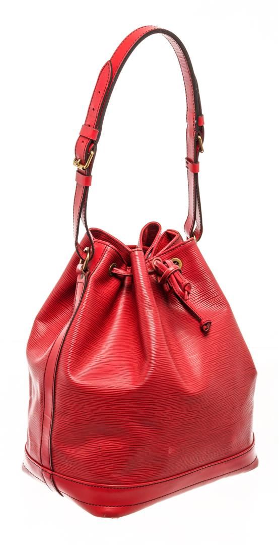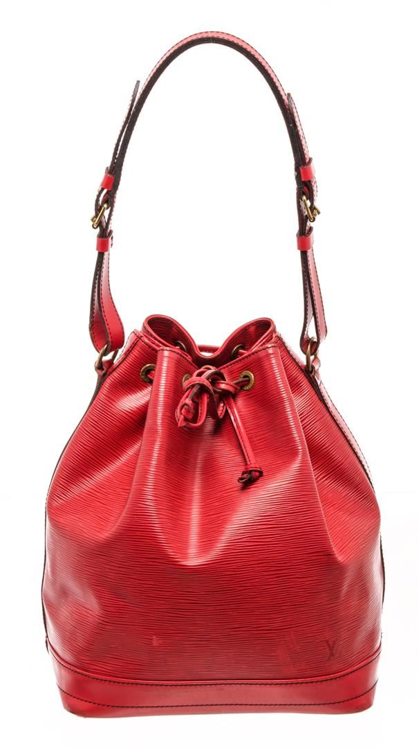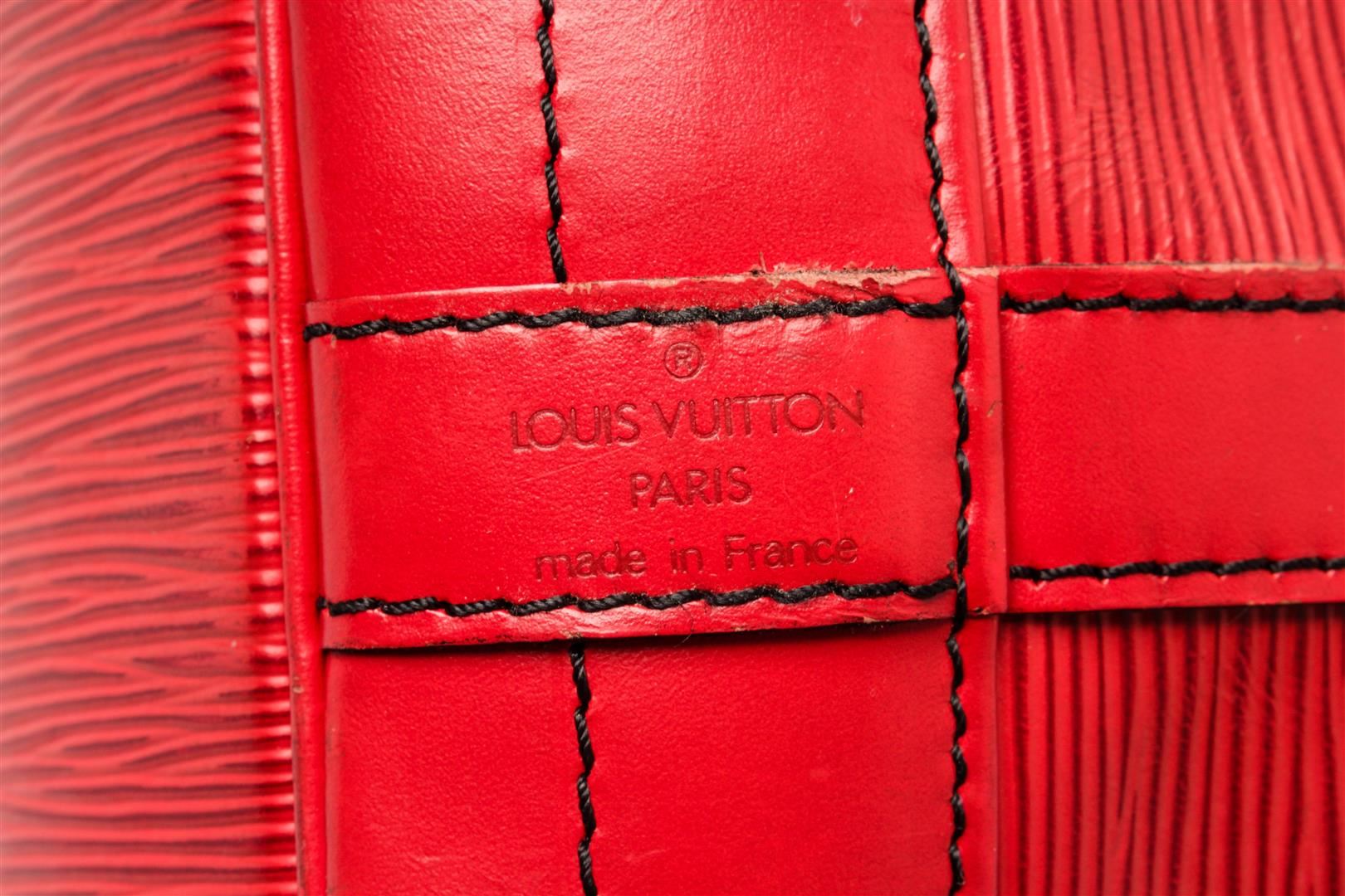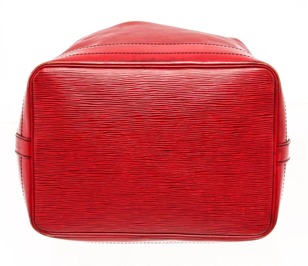 Louis Vuitton Red Epi Leather Noe Shoulder Bag. All available information is listed in the description and shown in the photos. Louis Vuitton Red Epi Leather Noe Shoulder Bag with red epi leather, printed, gold-tone hardware, single adjustable shoulder strap, alcantara lining, drawstring closure at top. Height: 13.5" Width: 10.5" Depth: 7.25" Shoulder Strap Drop: 9" / Height: 34.29 cm Width: 26.67 cm Depth: 18.41 cm Shoulder Strap Drop: 22.86 cm
