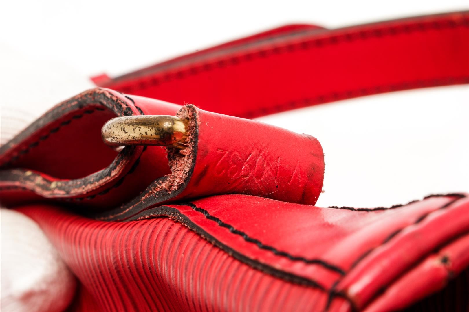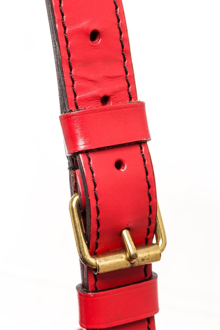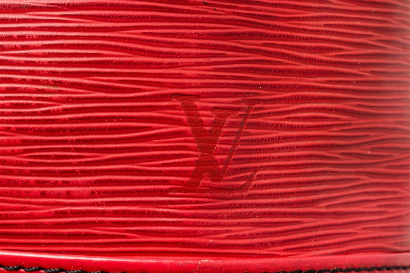 Louis Vuitton Red Epi Leather Noe Shoulder Bag. All available information is listed in the description and shown in the photos. Louis Vuitton Red Epi Leather Noe Shoulder Bag with red epi leather, printed, gold-tone hardware, single adjustable shoulder strap, alcantara lining, drawstring closure at top. Height: 13.5" Width: 10.5" Depth: 7.25" Shoulder Strap Drop: 9" / Height: 34.29 cm Width: 26.67 cm Depth: 18.41 cm Shoulder Strap Drop: 22.86 cm