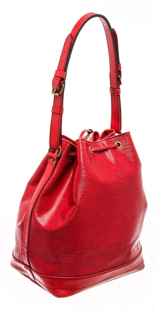 Louis Vuitton Red Epi Leather Noe Shoulder Bag. All available information is listed in the description and shown in the photos. Louis Vuitton Red Epi Leather Noe Shoulder Bag with red epi leather, printed, gold-tone hardware, single adjustable shoulder strap, alcantara lining, drawstring closure at top. Height: 13.5" Width: 10.5" Depth: 7.25" Shoulder Strap Drop: 8.5" / Height: 34.29 cm Width: 26.67 cm Depth: 18.41 cm Shoulder Strap Drop: 21.59 cm