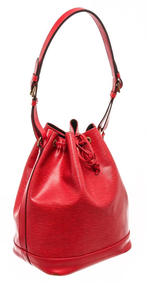 Louis Vuitton Red Epi Leather Noe Shoulder Bag. All available information is listed in the description and shown in the photos. Louis Vuitton Red Epi Leather Noe Shoulder Bag with red epi leather, printed, gold-tone hardware, single adjustable shoulder strap, alcantara lining, drawstring closure at top Height: 10" Width: 13.5" Depth: 7.25" Shoulder Strap Drop Min: 9" / Height: 25.4 cm Width: 34.29 cm Depth: 18.41 cm Shoulder Strap Drop Min: 22.86 cm