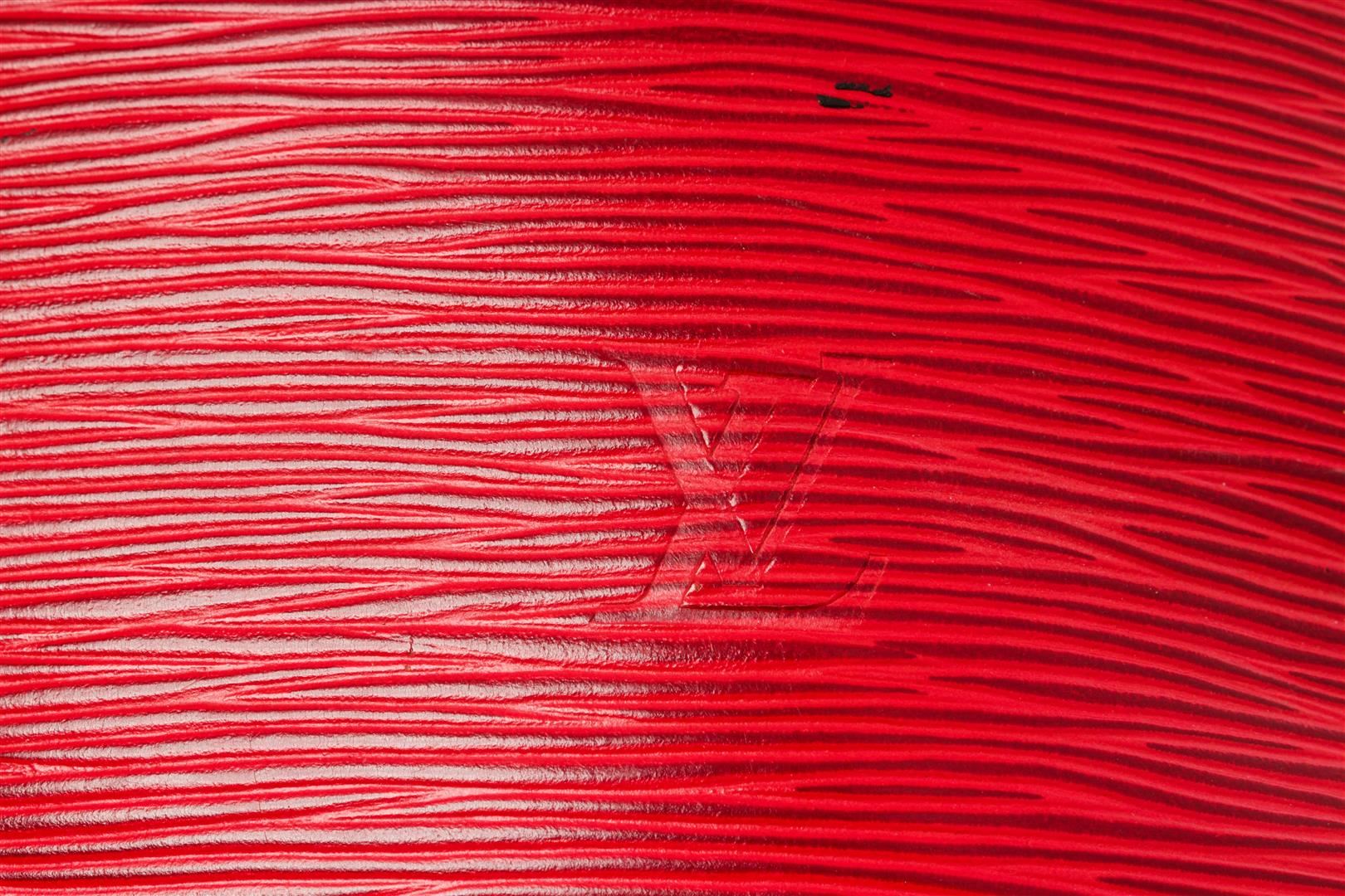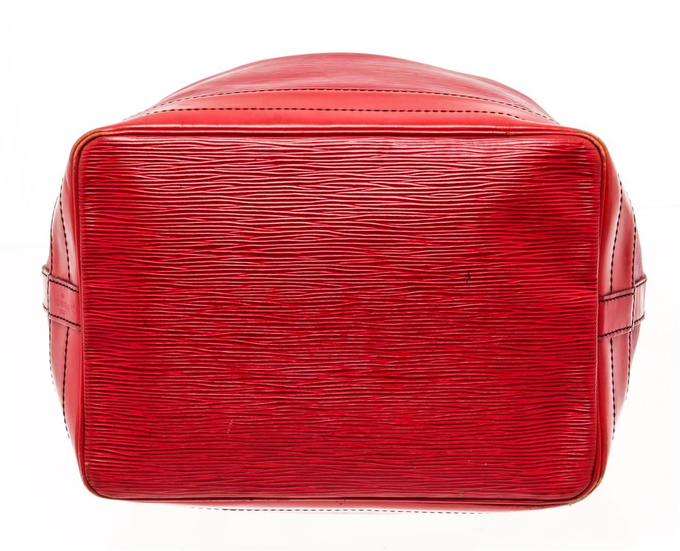 Louis Vuitton Red Epi Leather Noe Shoulder Bag. All available information is listed in the description and shown in the photos. Louis Vuitton Red Epi Leather Noe Shoulder Bag with red epi leather, printed, gold-tone hardware, single adjustable shoulder strap, alcantara lining, drawstring closure at top. Height: 13.5" Width: 10.5" Depth: 7.25" Shoulder Strap Drop: 8.5" / Height: 34.29 cm Width: 26.67 cm Depth: 18.41 cm Shoulder Strap Drop: 21.59 cm