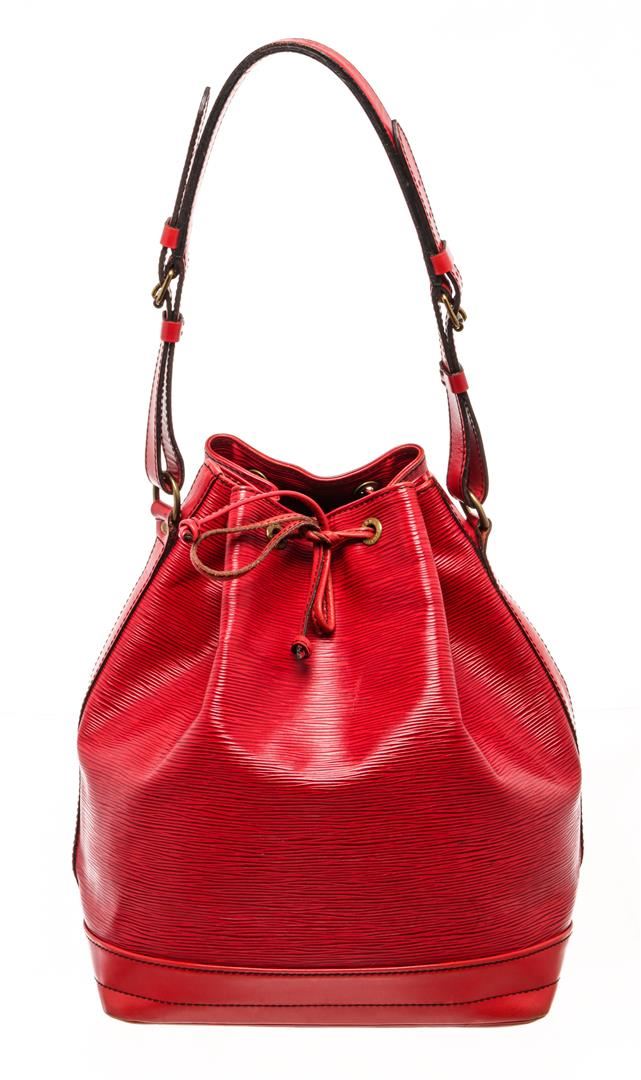Louis Vuitton Red Epi Leather Noe Shoulder Bag. All available information is listed in the description and shown in the photos. Louis Vuitton Red Epi Leather Noe Shoulder Bag with red epi leather, printed, gold-tone hardware, single adjustable shoulder strap, alcantara lining, drawstring closure at top.        Height: 13.5" Width: 10.5" Depth: 7.25" Shoulder Strap Drop: 8.5" / Height: 34.29 cm Width: 26.67 cm Depth: 18.41 cm Shoulder Strap Drop: 21.59 cm