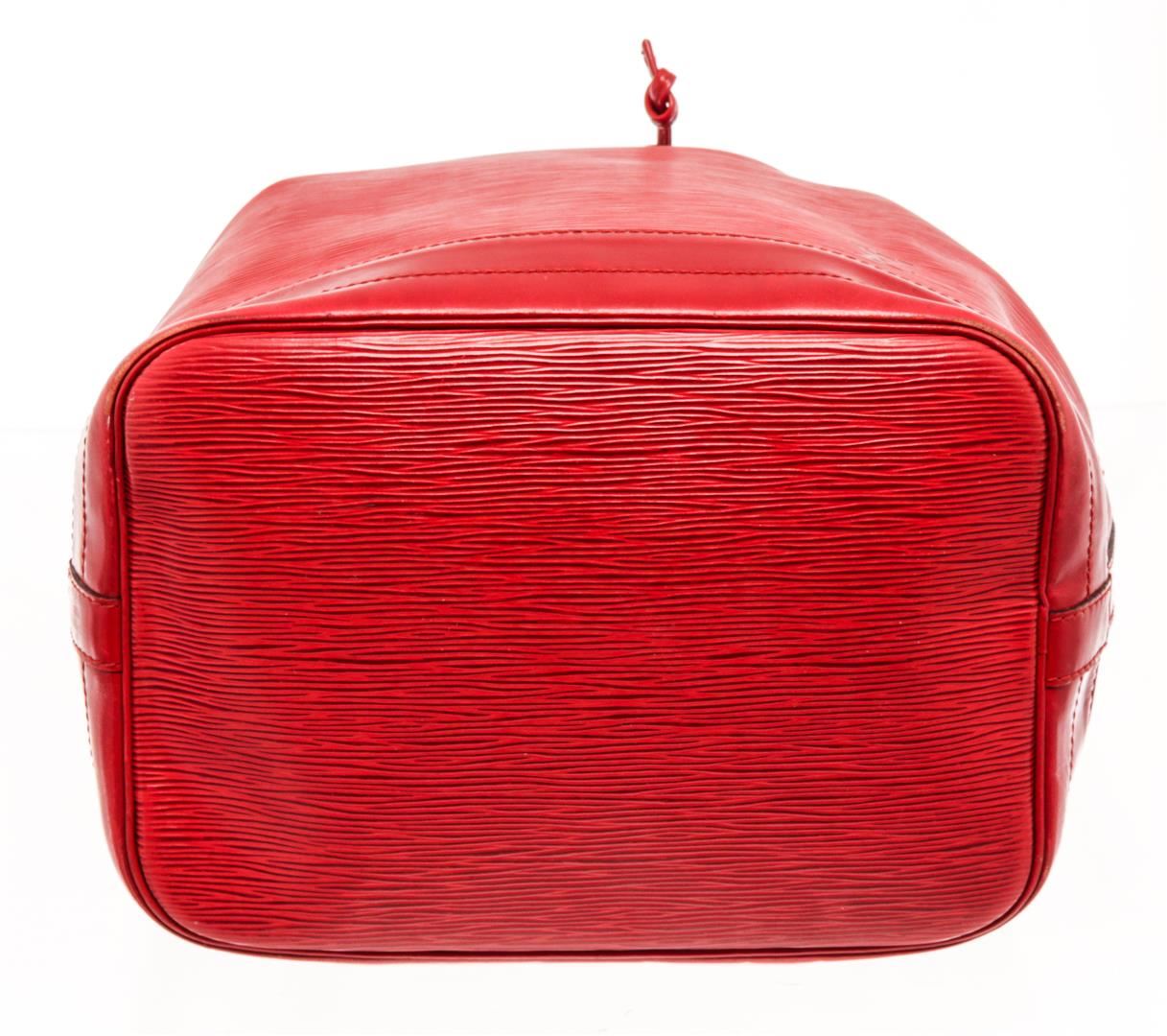 Louis Vuitton Red Epi Leather Noe Shoulder Bag. All available information is listed in the description and shown in the photos. Louis Vuitton Red Epi Leather Noe Shoulder Bag with red epi leather, printed, gold-tone hardware, single adjustable shoulder strap, alcantara lining, drawstring closure at top. Height: 13.5" Width: 10.5" Depth: 7.25" Shoulder Strap Drop: 9" / Height: 34.29 cm Width: 26.67 cm Depth: 18.41 cm Shoulder Strap Drop: 22.86 cm