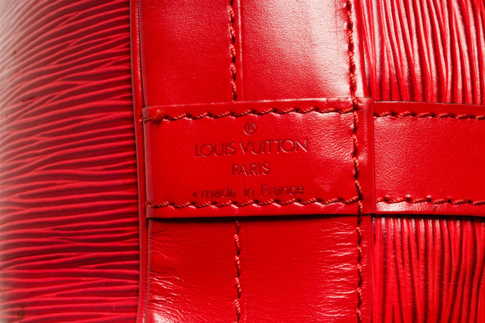 One Louis Vuitton Red Epi Leather Noe Shoulder Bag. Item is sold AS-IS. All available information is listed in the description and shown in the photo. louis vuitton red epi leather petit noe shoulder bag (HxWxD): 34.5cm x 26.5cm x 18.5cm / 13.58'' x 10.43'' x 7.28''
