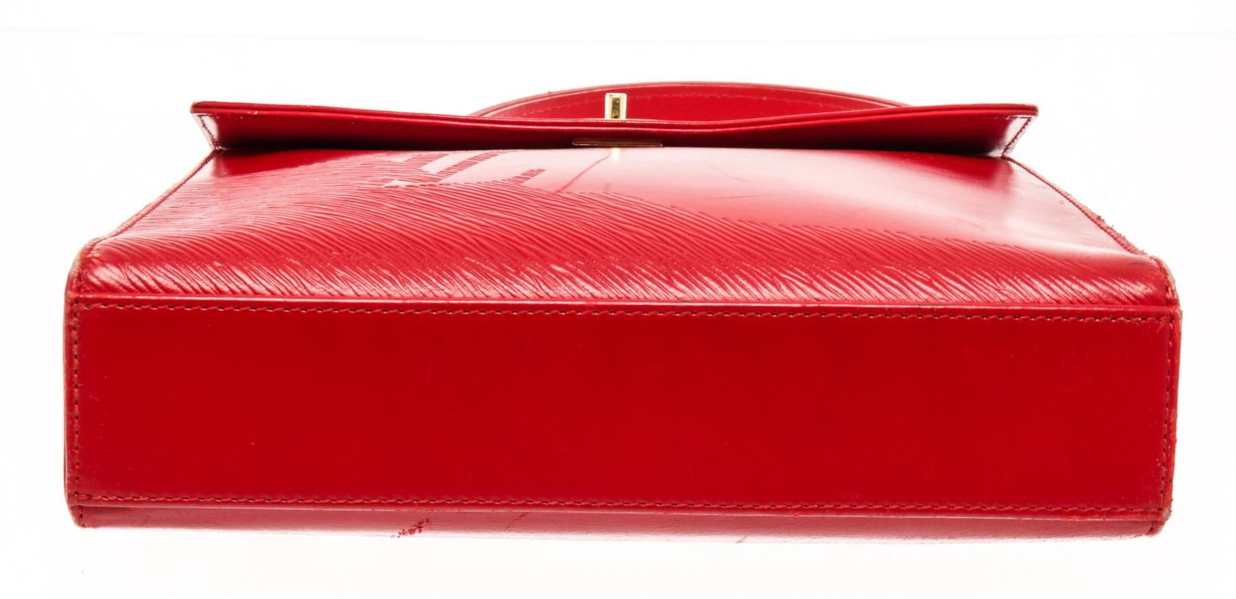 One Louis Vuitton Red Epi Leather Opera Sparta Shoulder Bag. Item is sold AS-IS. All available information is listed in the description and shown in the photo. Louis Vuitton Red Epi Leather Opera Sparta Shoulder Bag with top handle, gold tone hardware, red epi leather with logo on front, leather lining, interior zipper pocket, turn lock closure.