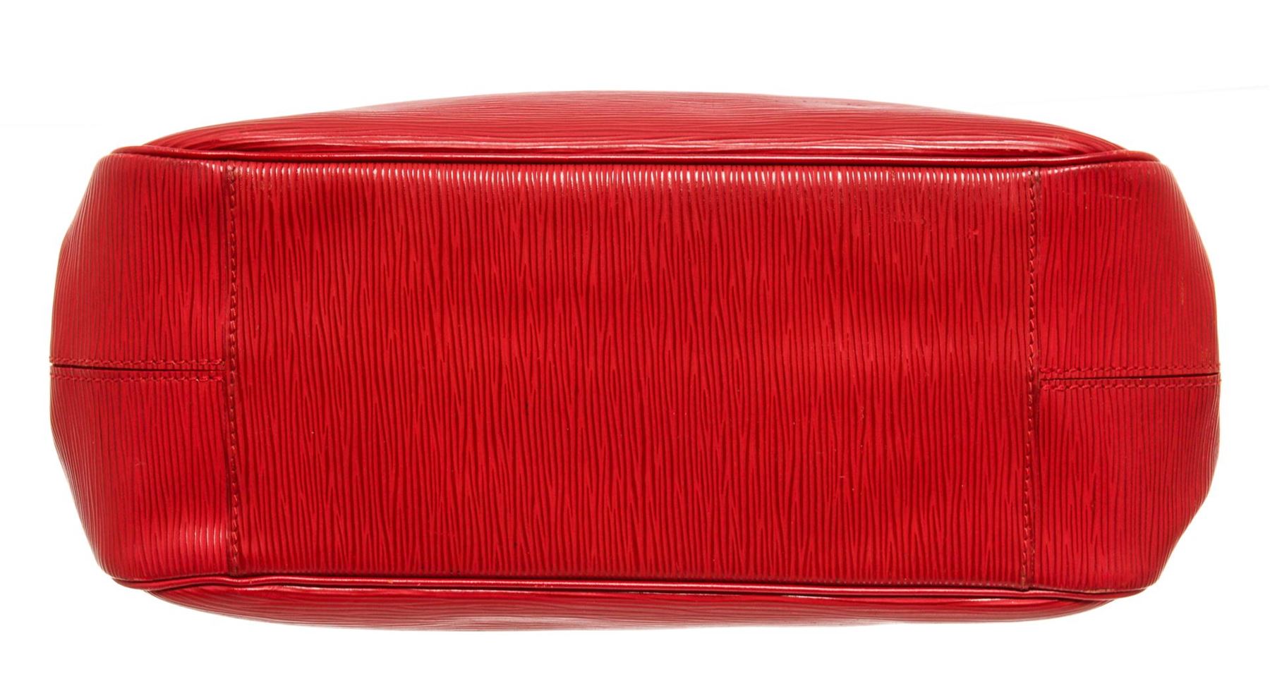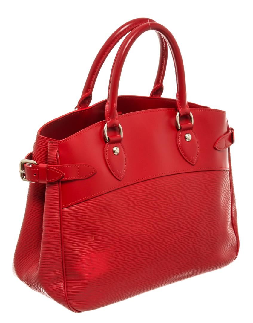 One Louis Vuitton Red Epi Leather Passy Handbag. Item is sold AS-IS. All available information is listed in the description and shown in the photo. Louis Vuitton Red Epi Leather Passy with top handle, silver tone hardware, red leather trim, interior zipper pocket, two slip pockets, fabric lining, dual rolled leather top handles, and snap closure. .