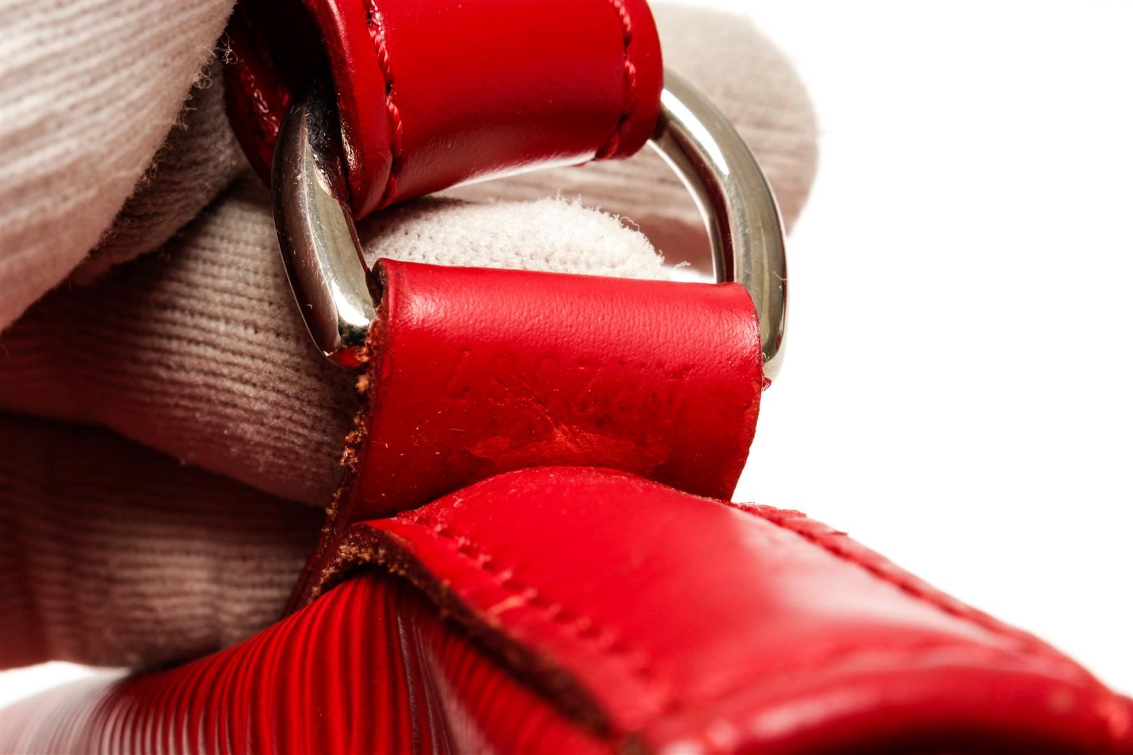 One Louis Vuitton Red Epi Leather Petit Noe Bag. Item is sold AS-IS. All available information is listed in the description and shown in the photo. Louis Vuitton Red Epi Leather Petit Noe Bag with silver-tone hardware, red leather trim, red suede lining, single adjustable leather shoulder strap, and drawstring closure. .