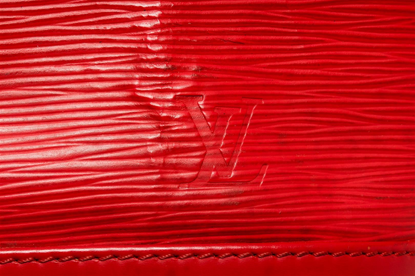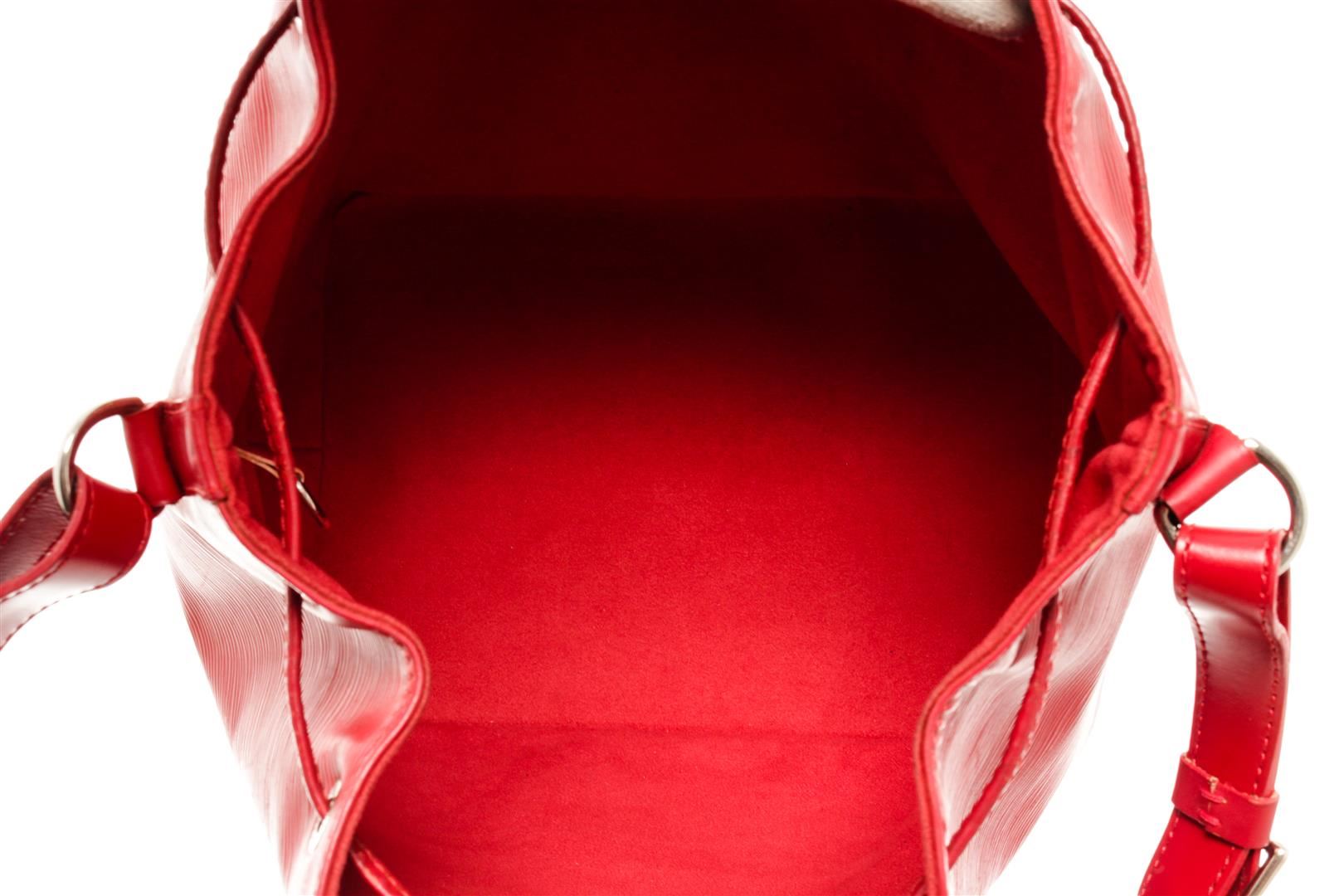 One Louis Vuitton Red Epi Leather Petit Noe Bag. Item is sold AS-IS. All available information is listed in the description and shown in the photo. Louis Vuitton Red Epi Leather Petit Noe Bag with silver-tone hardware, red leather trim, red suede lining, single adjustable leather shoulder strap, and drawstring closure. .