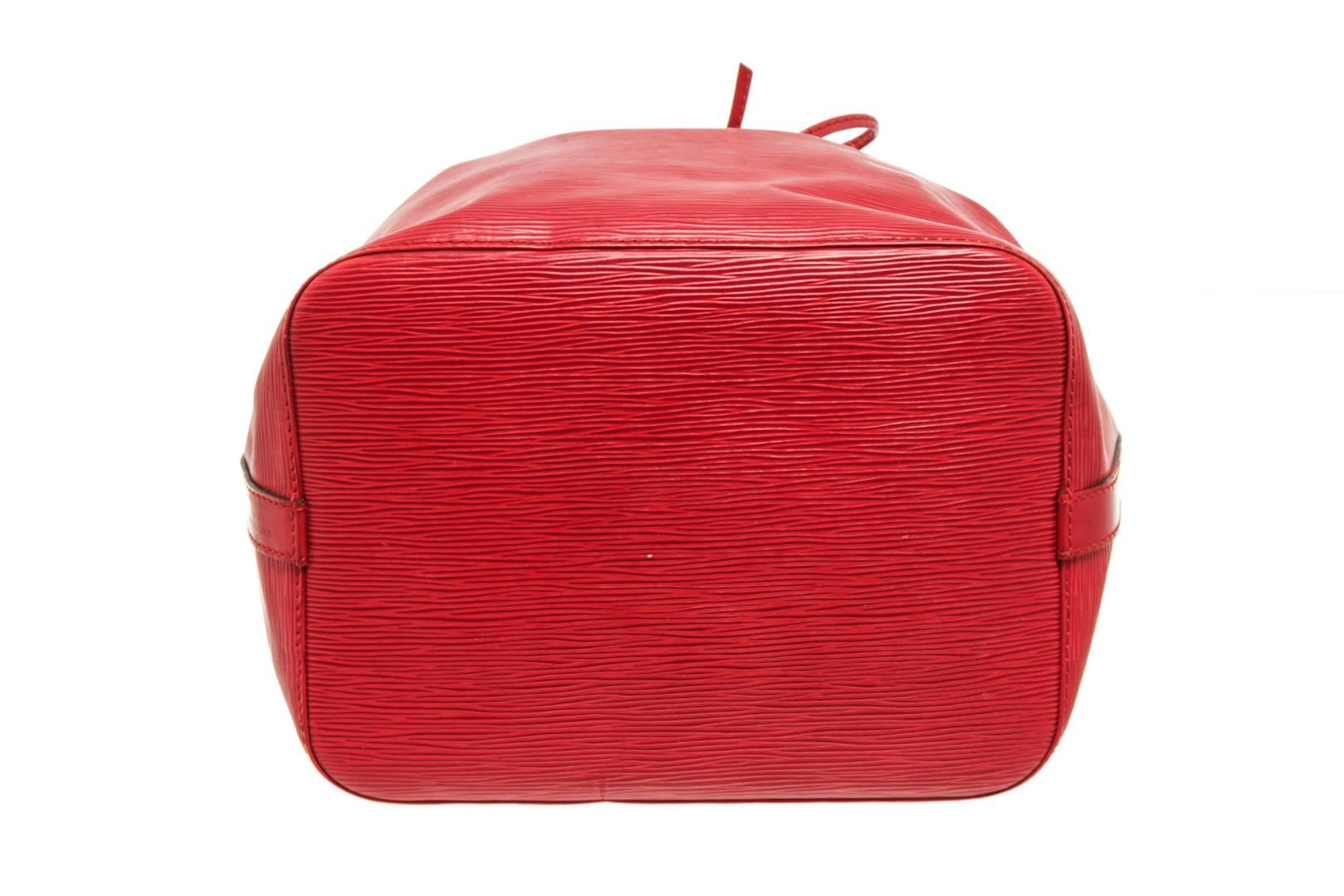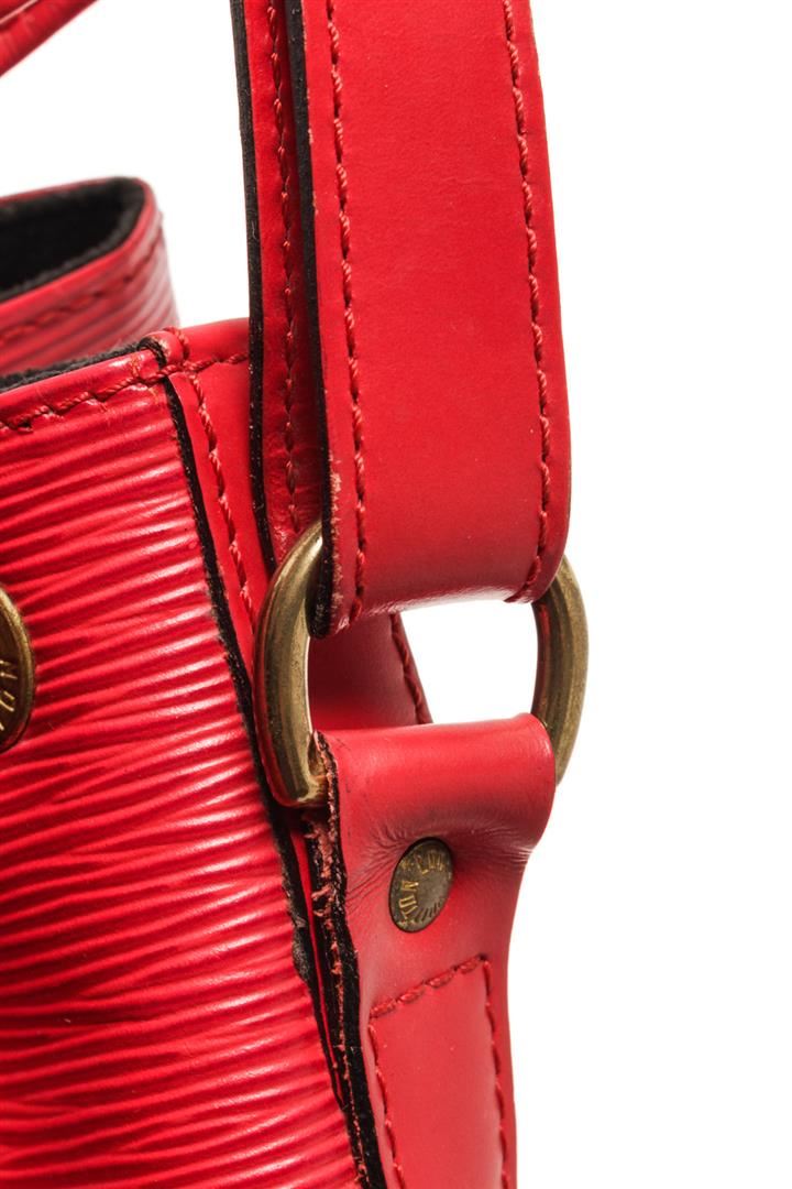 Louis Vuitton Red Epi Leather Petit Noe Bucket Bag. All available information is listed in the description and shown in the photos. louis vuitton red epi leather petit noe bucket bag with the petit noe features an epi leather body, an adjustable shoulder strap, and a drawstring closure. Height: 10.6" Width: 9.4" Depth: 5.9", Handle Drop: / 26.92 x 23.87 x 18.03 Cm