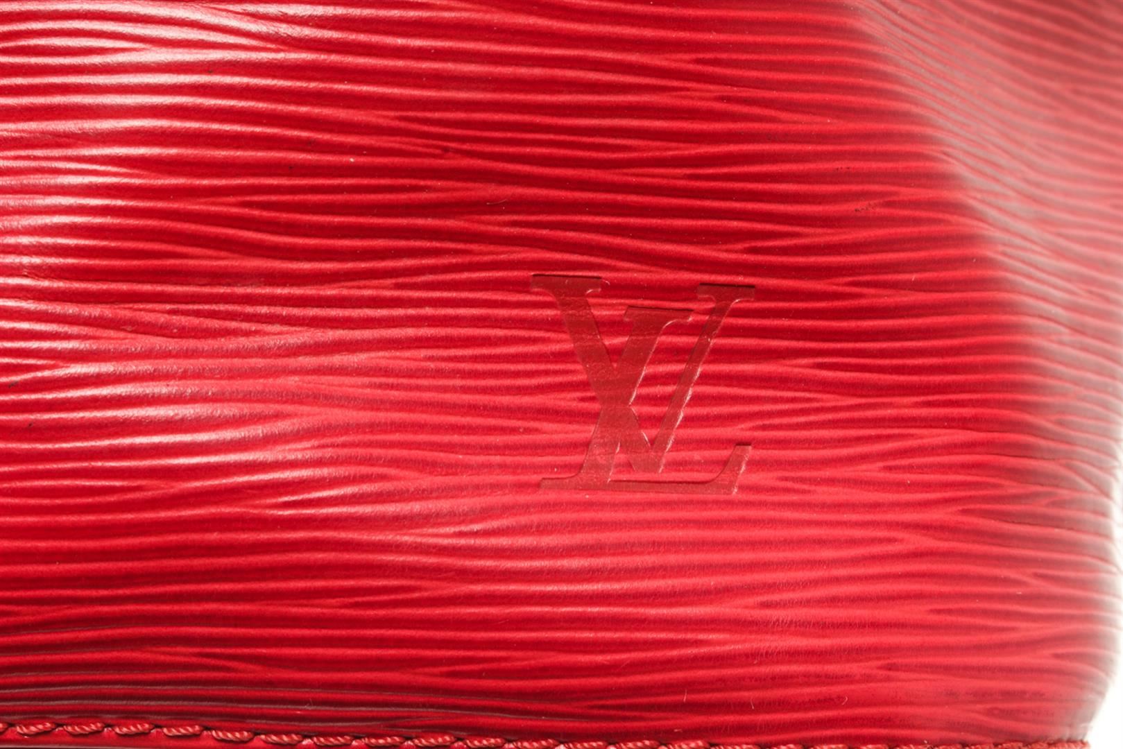 Louis Vuitton Red Epi Leather Petit Noe Bucket Bag. All available information is listed in the description and shown in the photos. louis vuitton red epi leather petit noe bucket bag with the petit noe features an epi leather body, an adjustable shoulder strap, and a drawstring closure. Height: 10.6" Width: 9.4" Depth: 5.9", Handle Drop: / 26.92 x 23.87 x 18.03 Cm