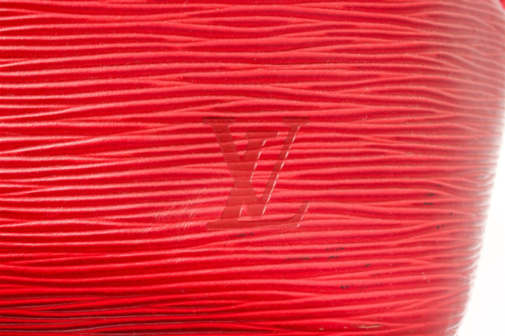 Louis Vuitton Red Epi Leather Petit Noe Bucket Bag. All available information is listed in the description and shown in the photos. Louis Vuitton Red Epi Leather Petit Noe Bucket Bag with vintage, red epi leather, colorblock pattern, brass hardware, leather trim, single adjustable shoulder strap, leather trim embellishment, alcantara lining & single interior pocket, drawstring closure at front Height: 10.5" Width: 9.5" Depth: 7" Shoulder Strap Drop: 10.5" / Height: 26.67" Width: 24.13" Depth: 17.78" Shoulder Strap Drop: 26.67"