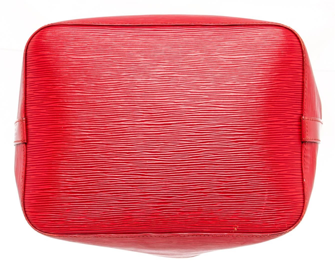 Louis Vuitton Red Epi Leather Petit Noe Bucket Bag. All available information is listed in the description and shown in the photos. Louis Vuitton Red Epi Leather Petit Noe Bucket Bag with vintage, red epi leather, colorblock pattern, brass hardware, leather trim, single adjustable shoulder strap, leather trim embellishment, alcantara lining & single interior pocket, drawstring closure at front Height: 10.5" Width: 9.5" Depth: 7" Shoulder Strap Drop: 10.5" / Height: 26.67" Width: 24.13" Depth: 17.78" Shoulder Strap Drop: 26.67"