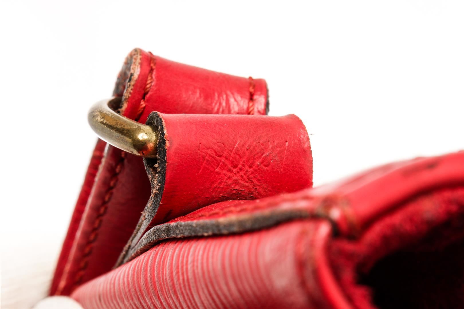 Louis Vuitton Red Epi Leather Petit Noe Shoulder Bag. All available information is listed in the description and shown in the photos. Louis Vuitton Red Epi Leather Petit Noe Shoulder Bag with red epi leather, brass hardware, single adjustable shoulder strap, alcantara lining, drawstring closure at top. Height: 10" Width: 15.5" Depth: 7" Shoulder Strap Drop: 9" / Height: 25.4" Width: 39.37" Depth: 17.78" Shoulder Strap Drop: 22.86"