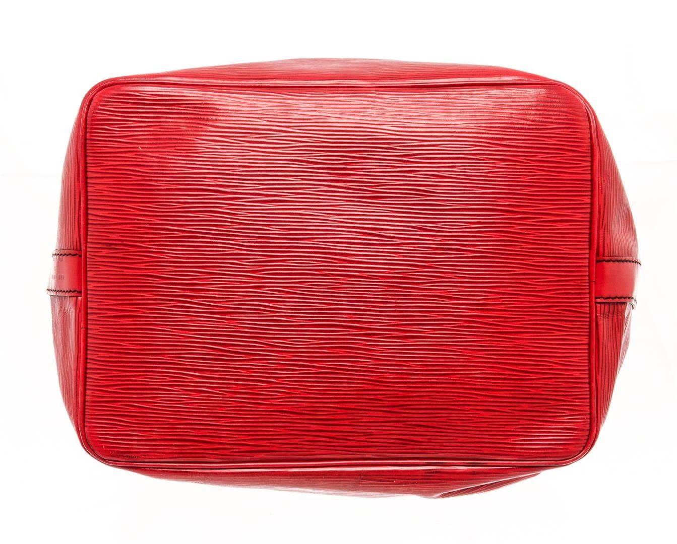 Louis Vuitton Red Epi Leather Petit Noe Shoulder Bag. All available information is listed in the description and shown in the photos. Louis Vuitton Red Epi Leather Petit Noe Shoulder Bag with red epi leather, brass hardware, single adjustable shoulder strap, alcantara lining, drawstring closure at top. Height: 10" Width: 15.5" Depth: 7" Shoulder Strap Drop: 9" / Height: 25.4" Width: 39.37" Depth: 17.78" Shoulder Strap Drop: 22.86"