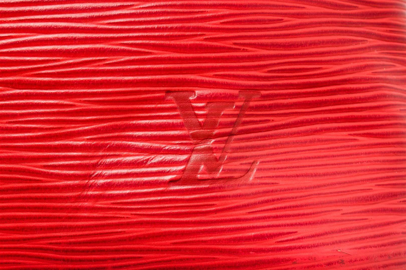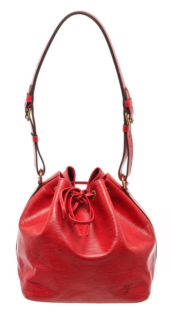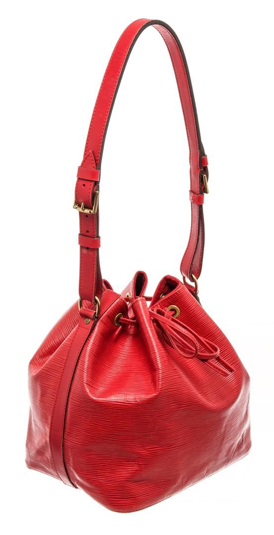Louis Vuitton Red Epi Leather Petit Noe Shoulder Bag. All available information is listed in the description and shown in the photos. Louis Vuitton Red Epi Leather Petit Noe Shoulder Bag with red epi leather, brass hardware, single adjustable shoulder strap, alcantara lining, drawstring closure at top. Height: 10" Width: 15.5" Depth: 7" Shoulder Strap Drop: 9" / Height: 25.4" Width: 39.37" Depth: 17.78" Shoulder Strap Drop: 22.86"