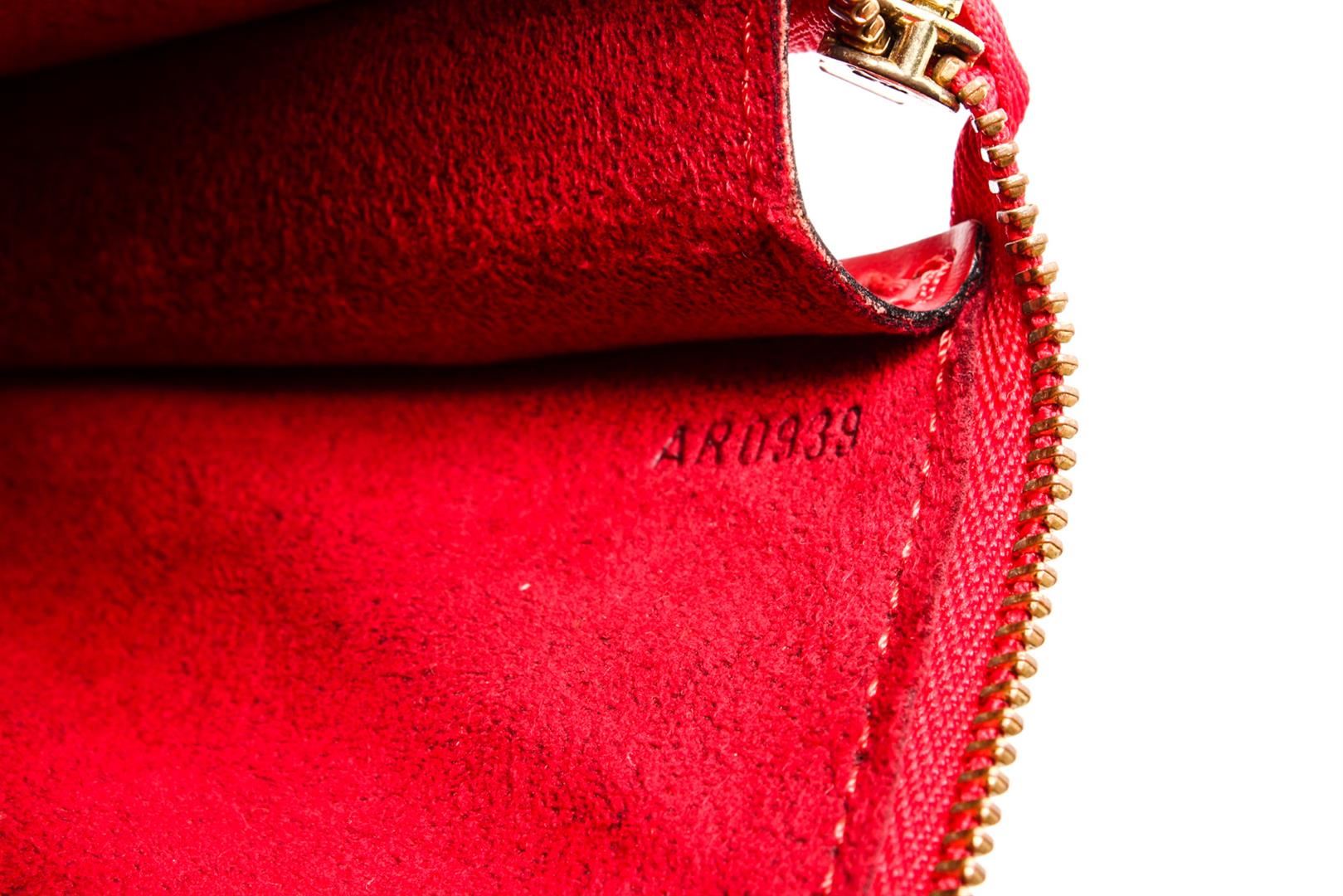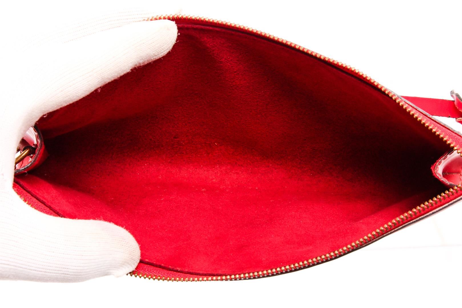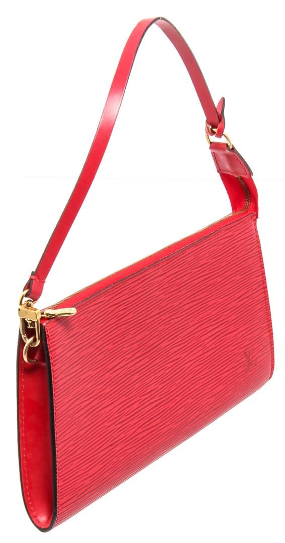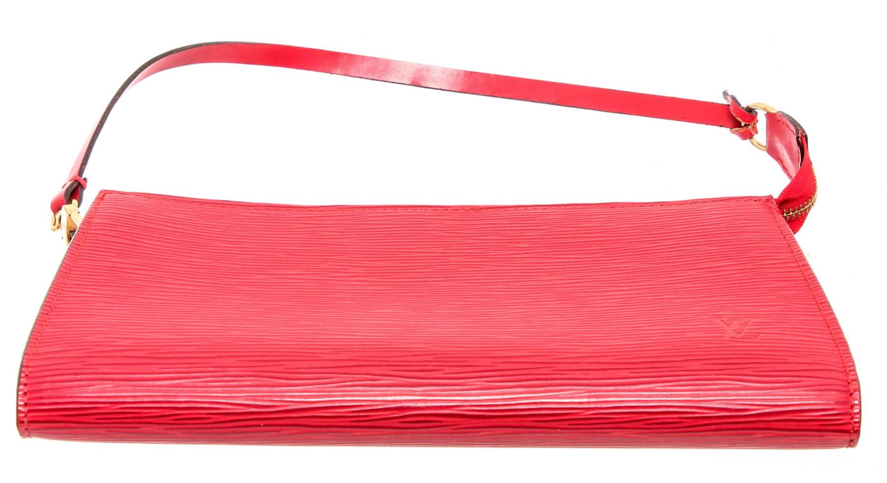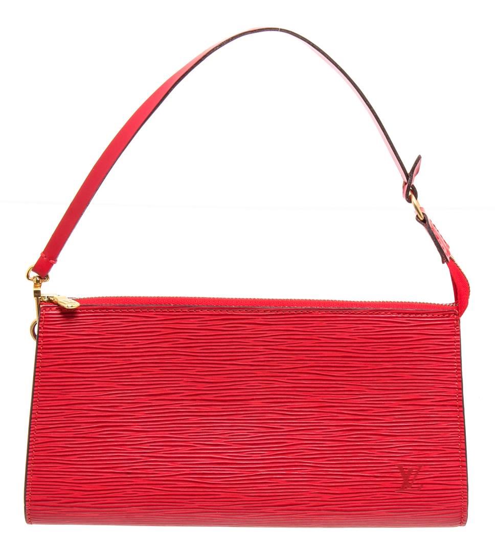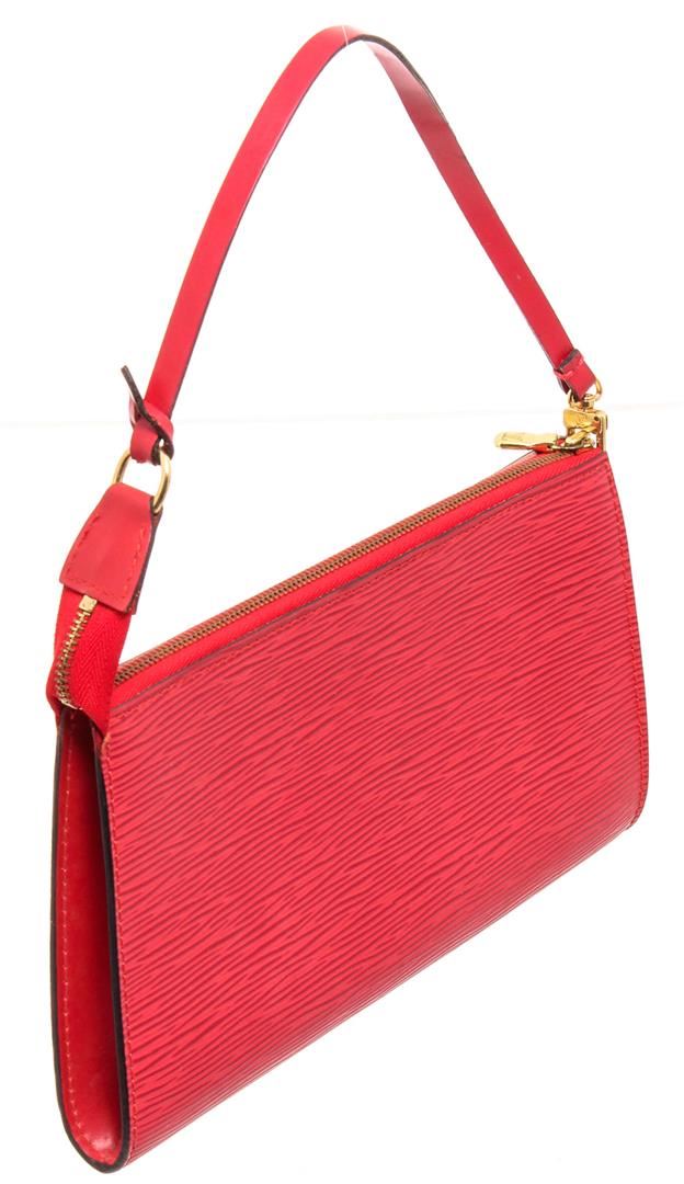 Red Epi leather Louis Vuitton Pochette Bag with brass hardware, single flat top handle, Alcantara lining and zip closure at top.