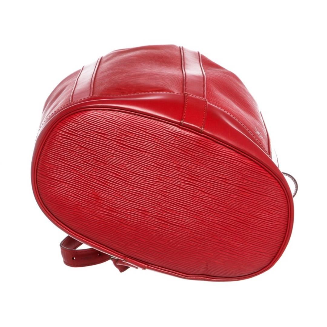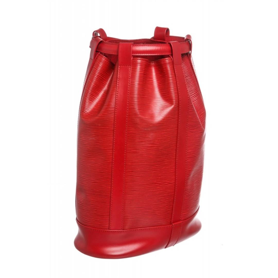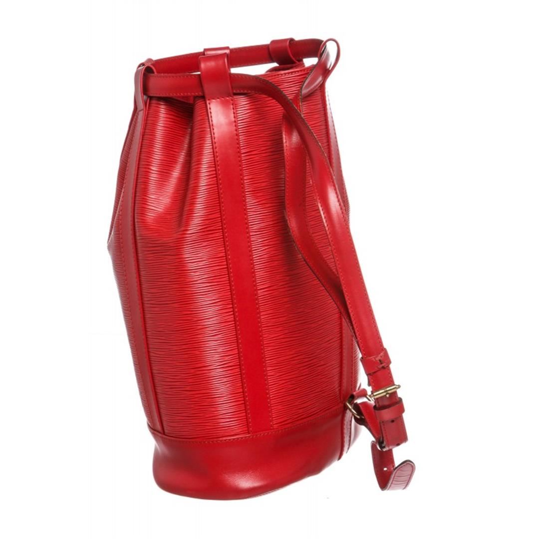 Red epi leather Louis Vuitton Randonne Backpack GM with brass hardware, black Alcantara lining, single zip pocket at interior wall and drawstring closure at top. Item is pre-owned.