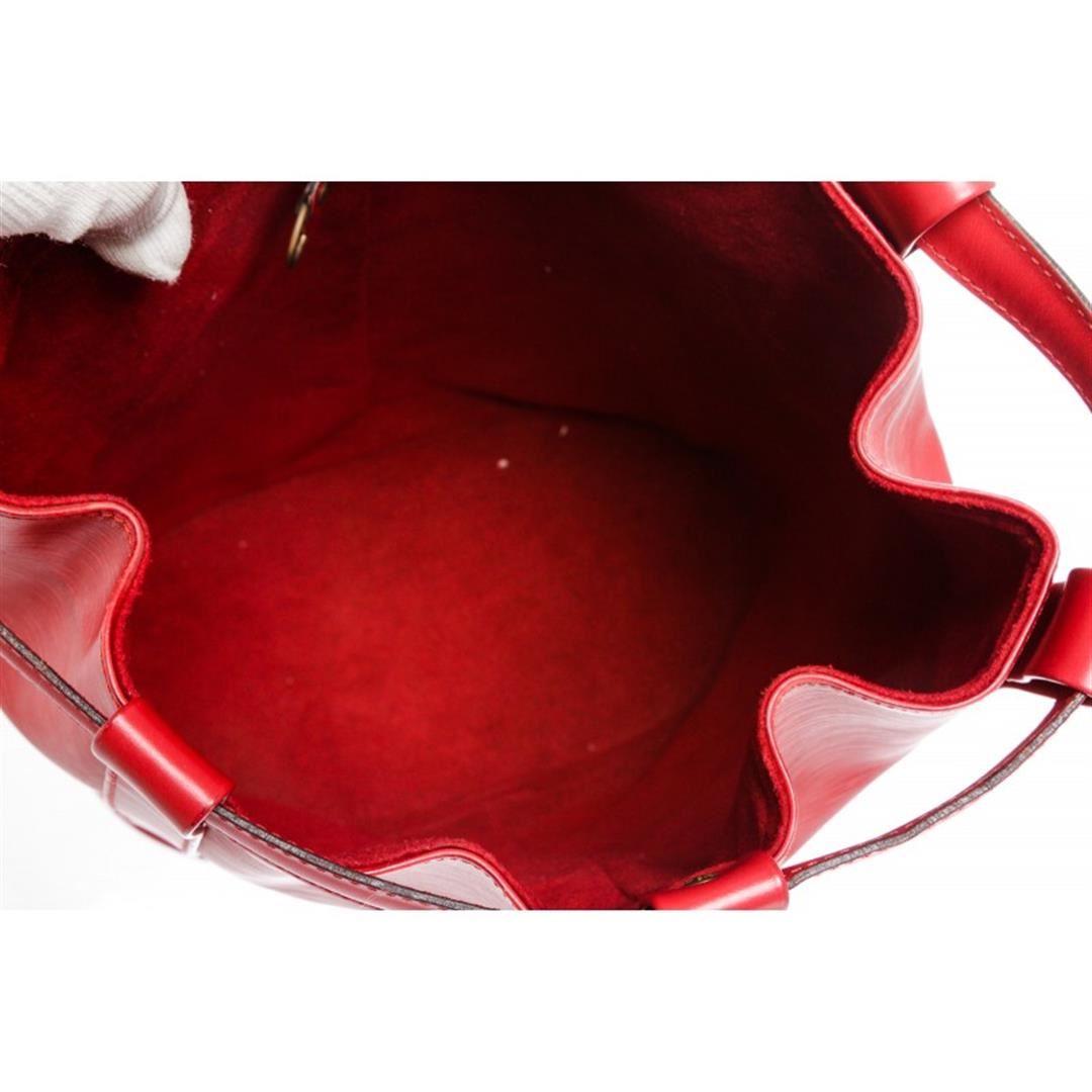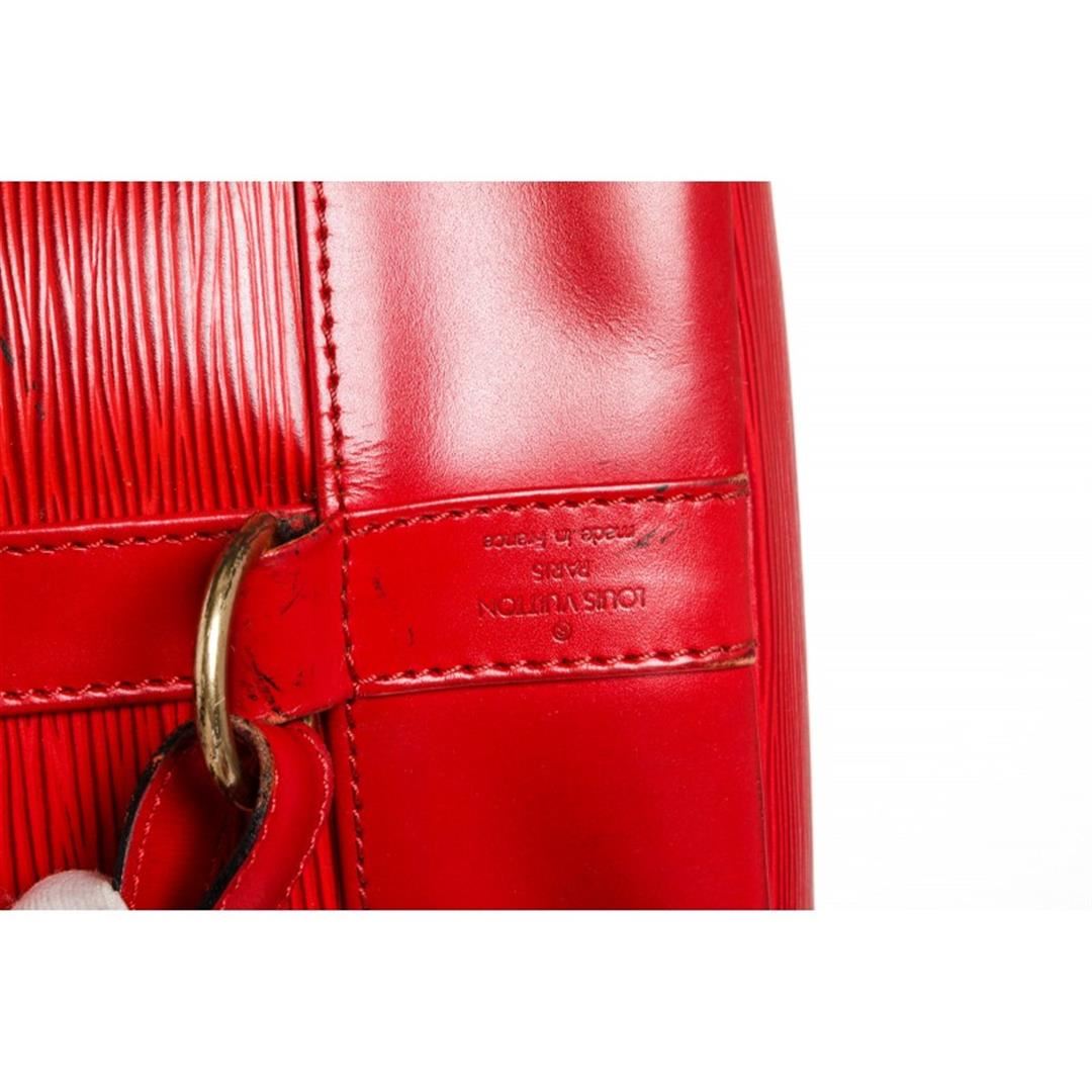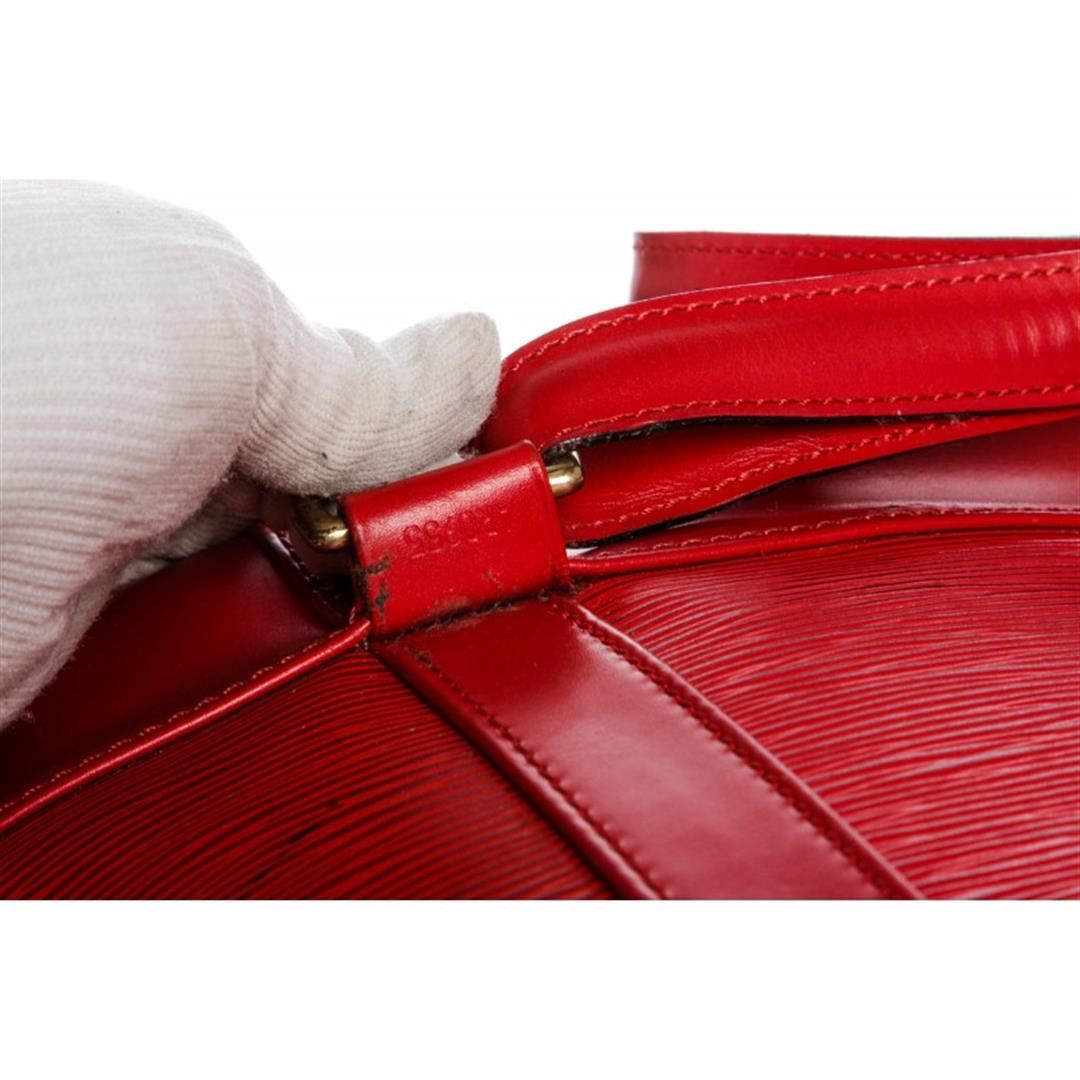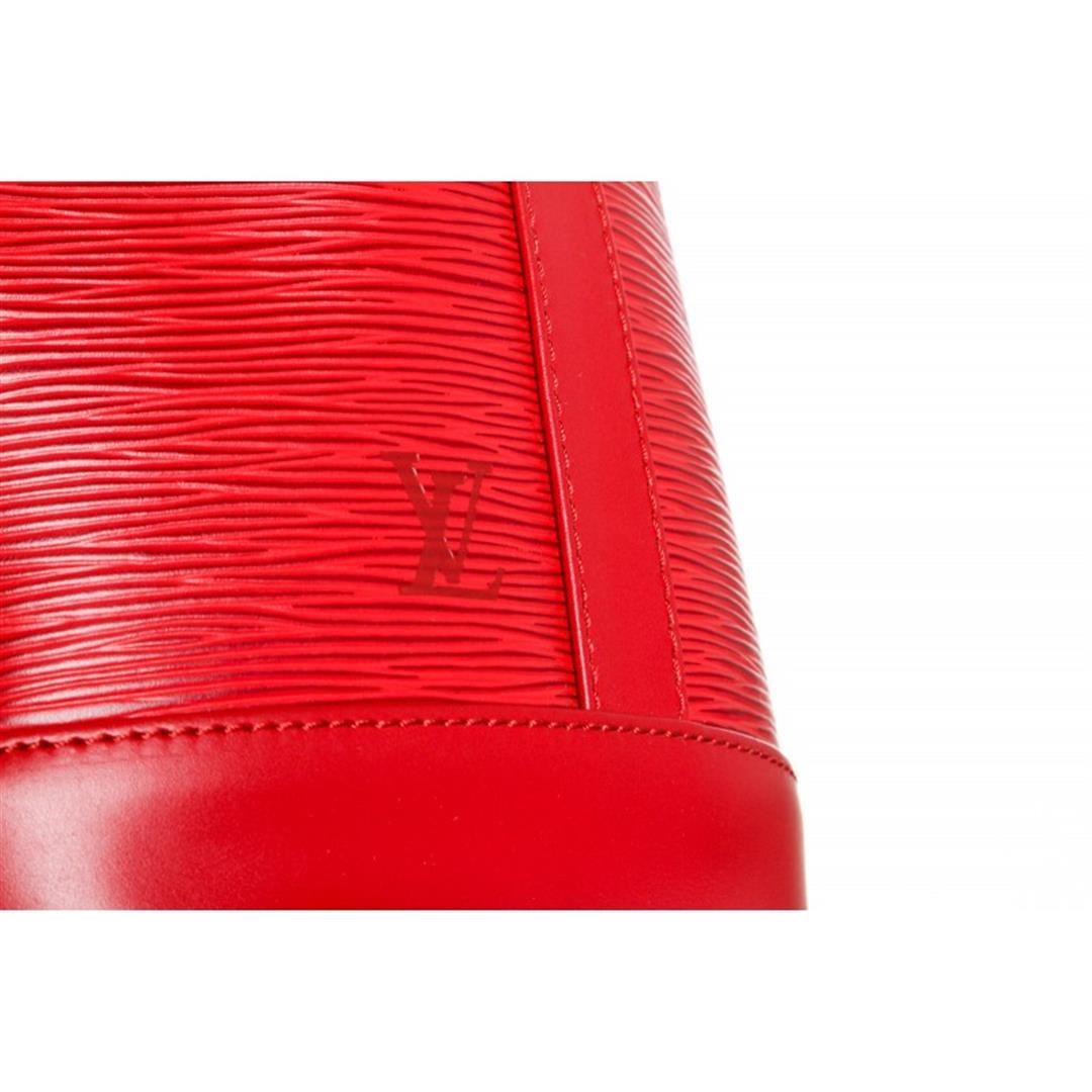Red epi leather Louis Vuitton Randonne Backpack GM with brass hardware, black Alcantara lining, single zip pocket at interior wall and drawstring closure at top. Item is pre-owned.