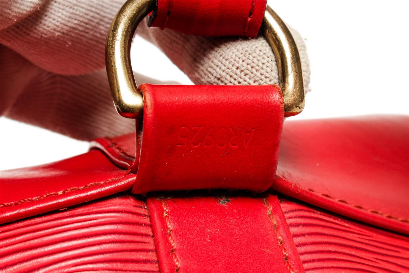 One Louis Vuitton Red Epi Leather Randonnee PM Backpack. Item is sold AS-IS. All available information is listed in the description and shown in the photo. Louis Vuitton Epi Leather Randonnee PM Backpack with gold-tone hardware, leather trim, embossed LV logo at the bottom front, black suede lining, interior zip pocket, adjustable leather strap, and drawstring closure. .