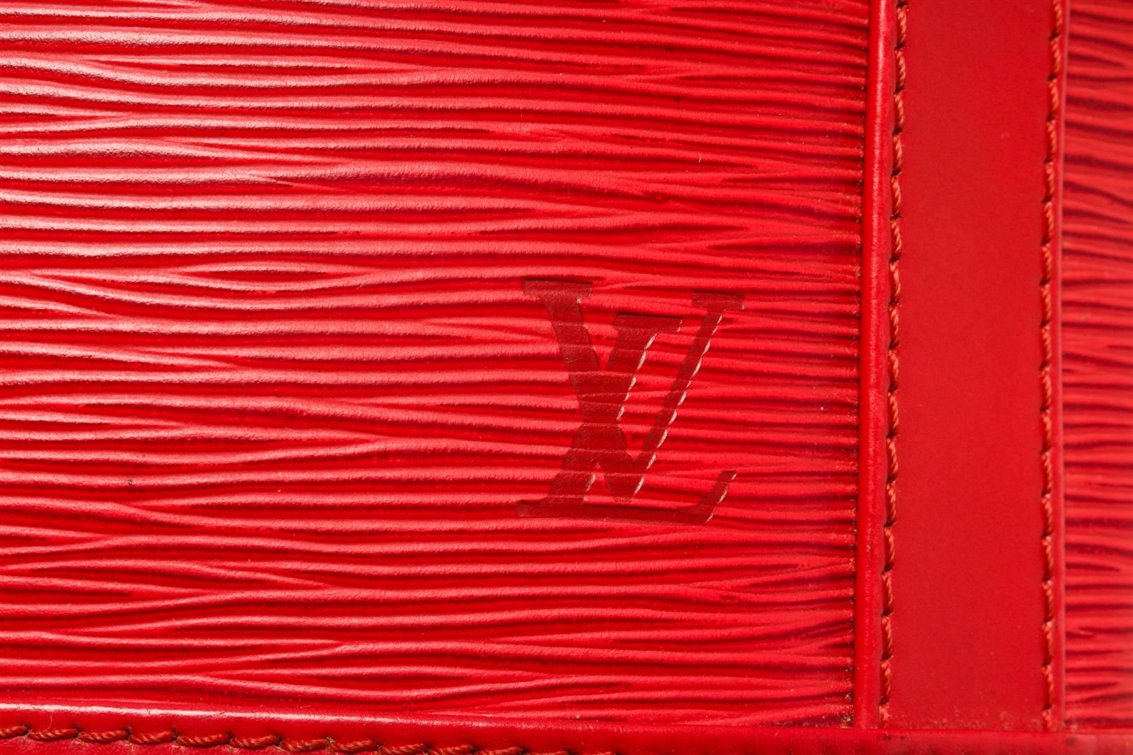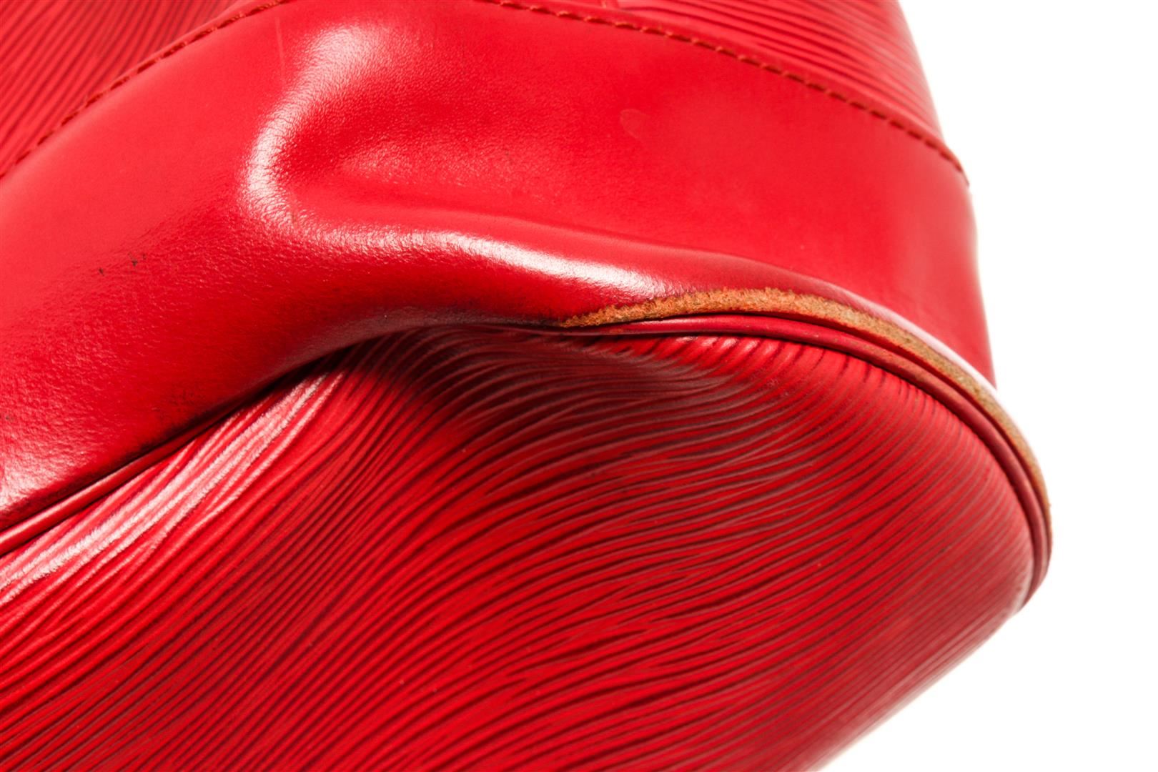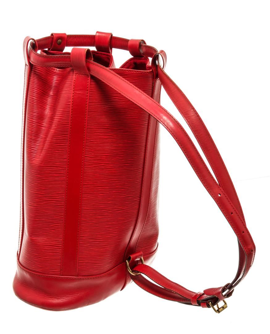 One Louis Vuitton Red Epi Leather Randonnee PM Backpack. Item is sold AS-IS. All available information is listed in the description and shown in the photo. Louis Vuitton Epi Leather Randonnee PM Backpack with gold-tone hardware, leather trim, embossed LV logo at the bottom front, black suede lining, interior zip pocket, adjustable leather strap, and drawstring closure. .
