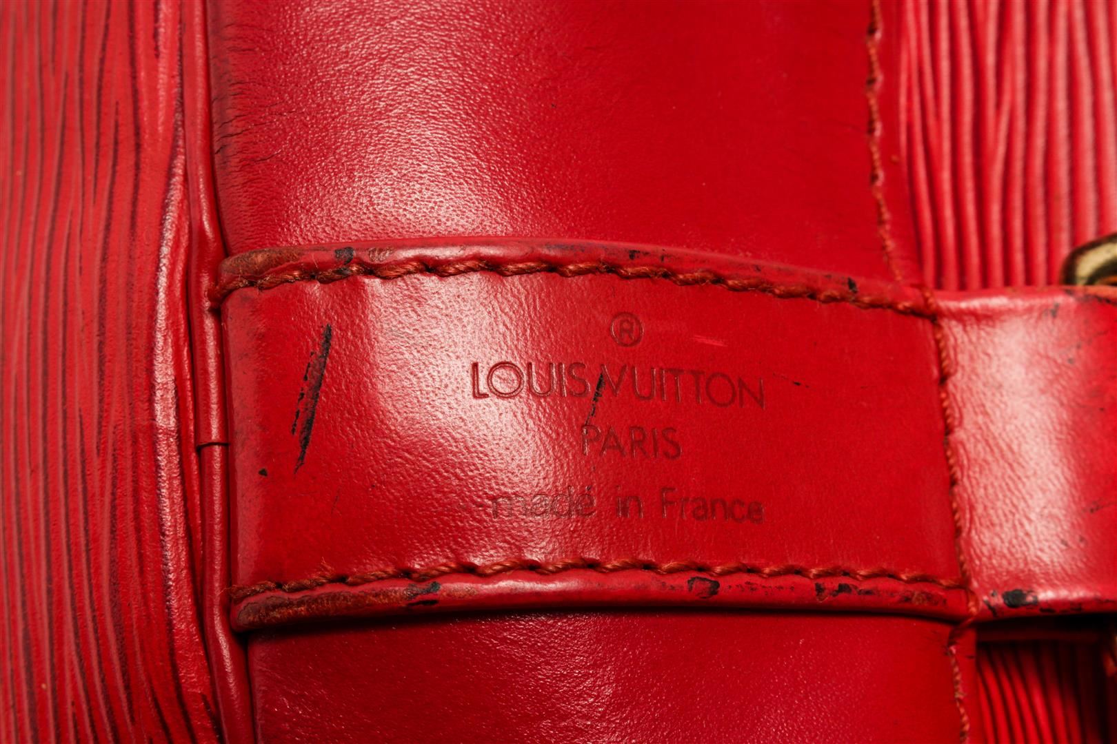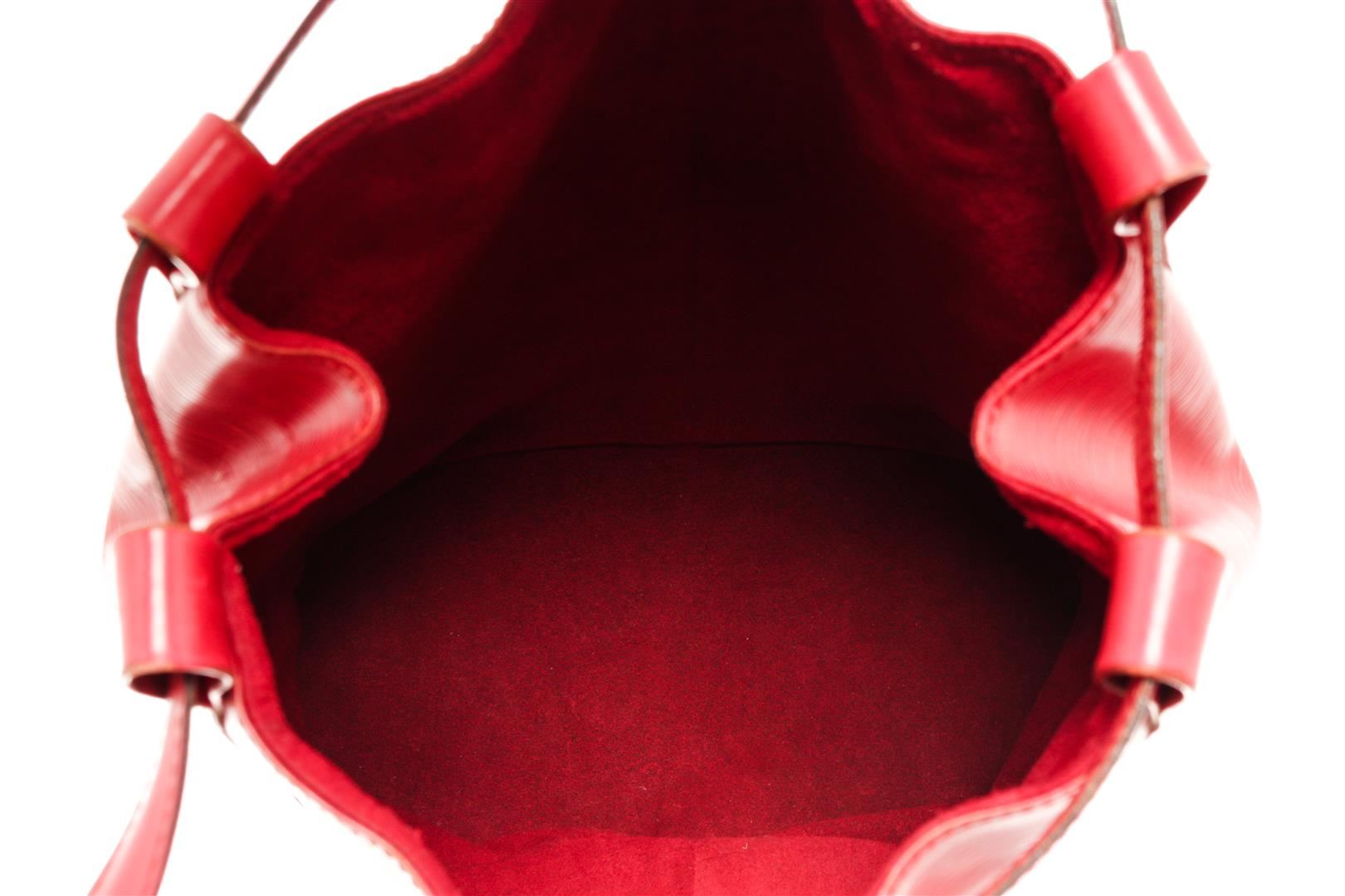 One Louis Vuitton Red Epi Leather Randonnee PM Backpack. Item is sold AS-IS. All available information is listed in the description and shown in the photo. Louis Vuitton Epi Leather Randonnee PM Backpack with gold-tone hardware, leather trim, embossed LV logo at the bottom front, black suede lining, interior zip pocket, adjustable leather strap, and drawstring closure. .