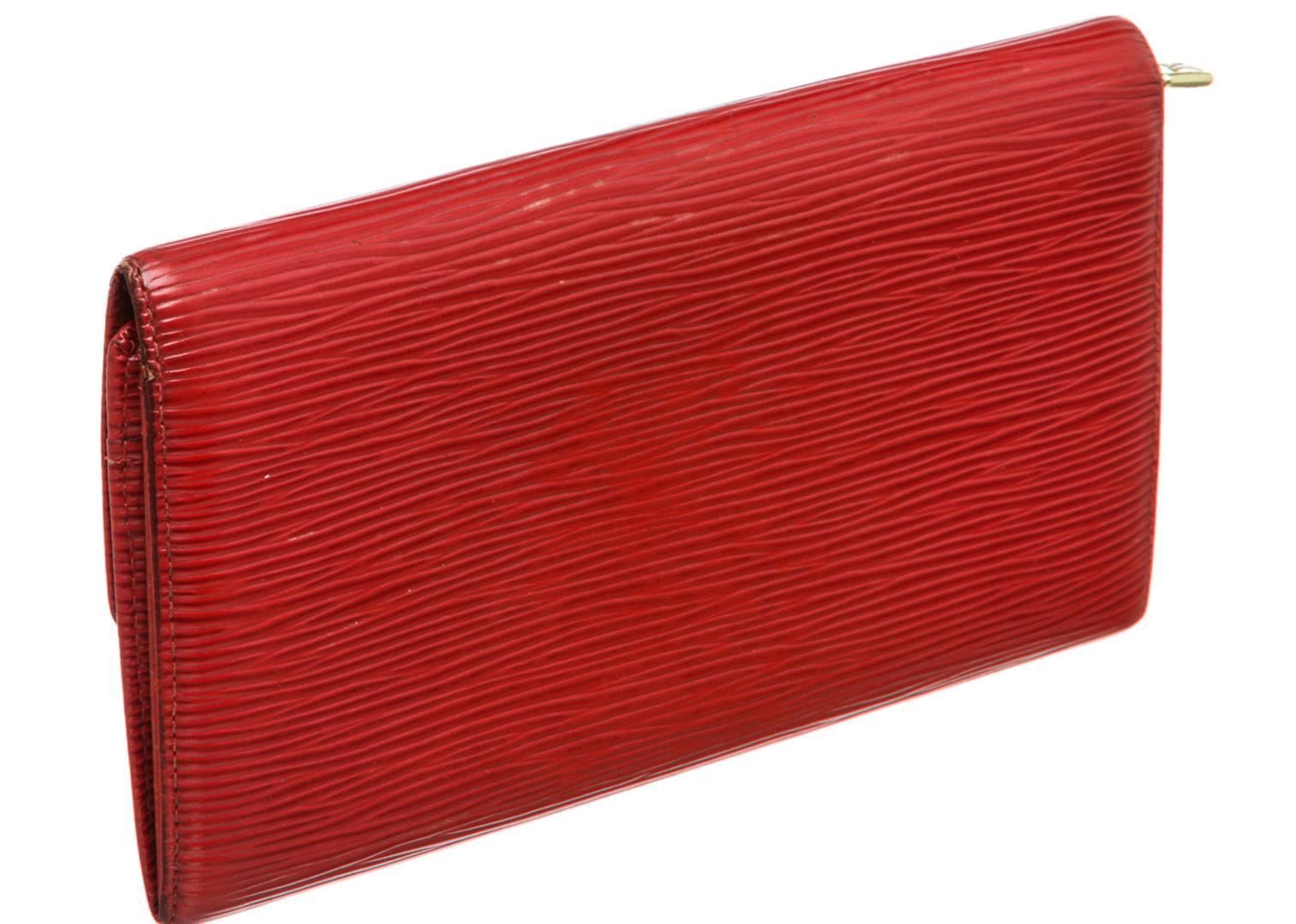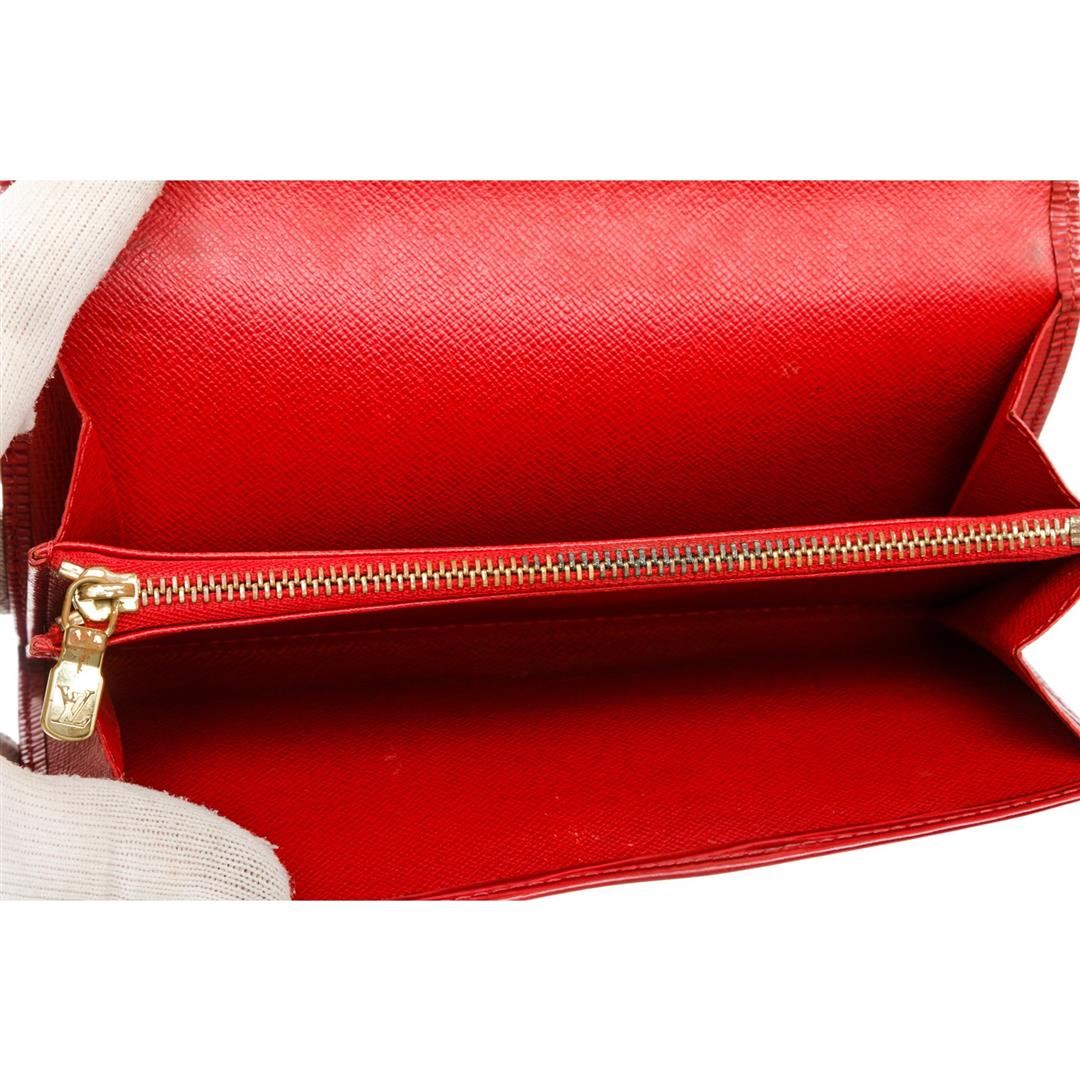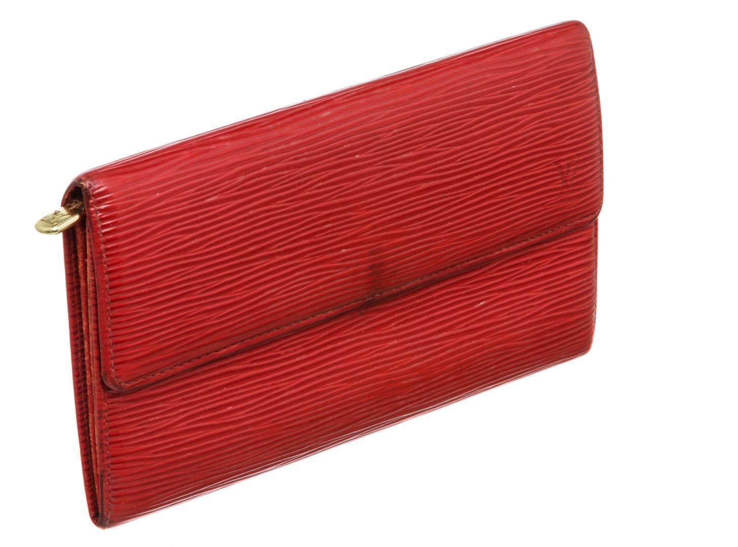Red Epi leather Louis Vuitton Sarah wallet with brass hardware, embossed logo at corner, tonal leather lining, single interior zip pocket, single bill compartment, six card slots and snap closure at front flap. Authentic.