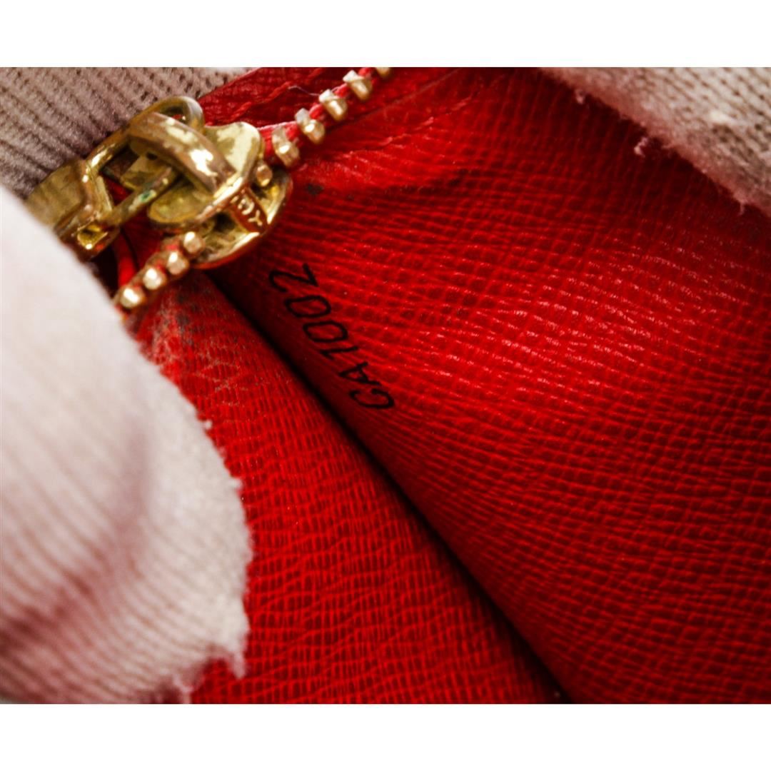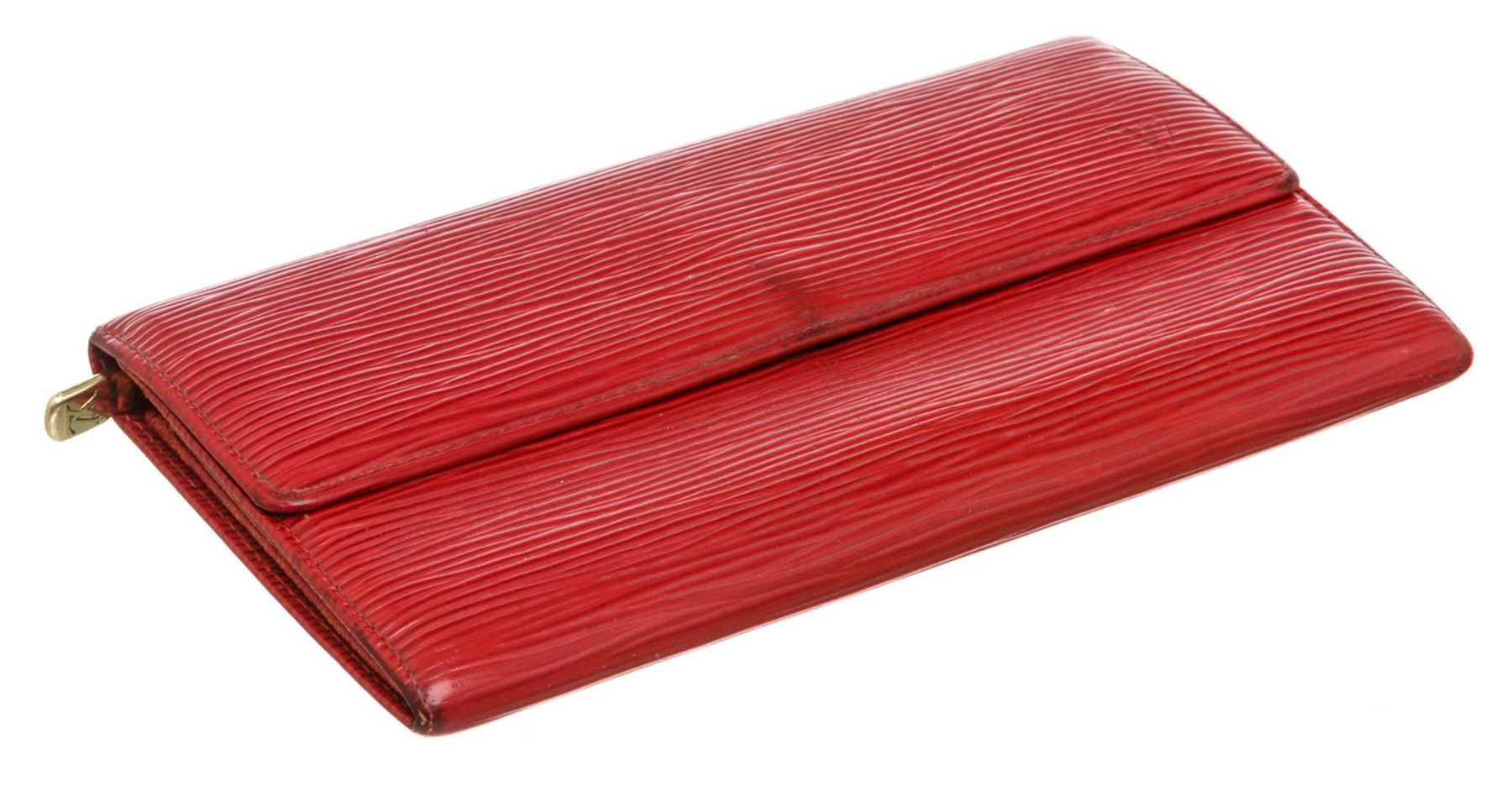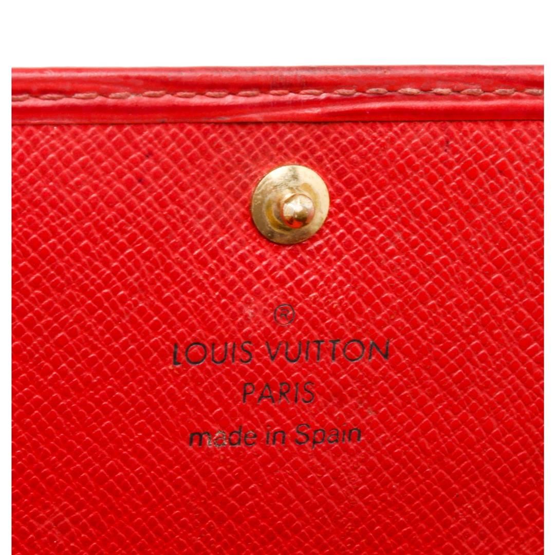 Red Epi leather Louis Vuitton Sarah wallet with brass hardware, embossed logo at corner, tonal leather lining, single interior zip pocket, single bill compartment, six card slots and snap closure at front flap. Authentic.