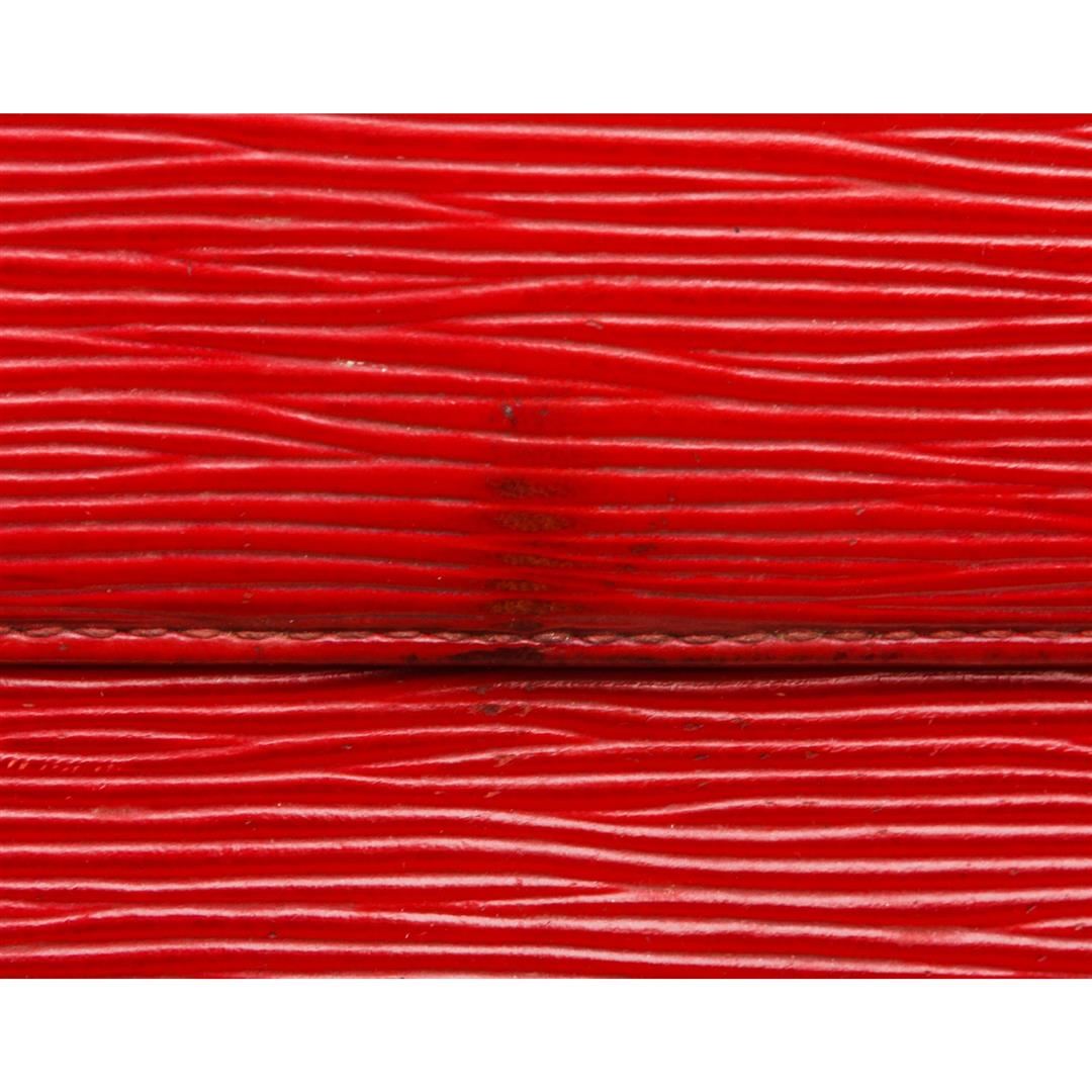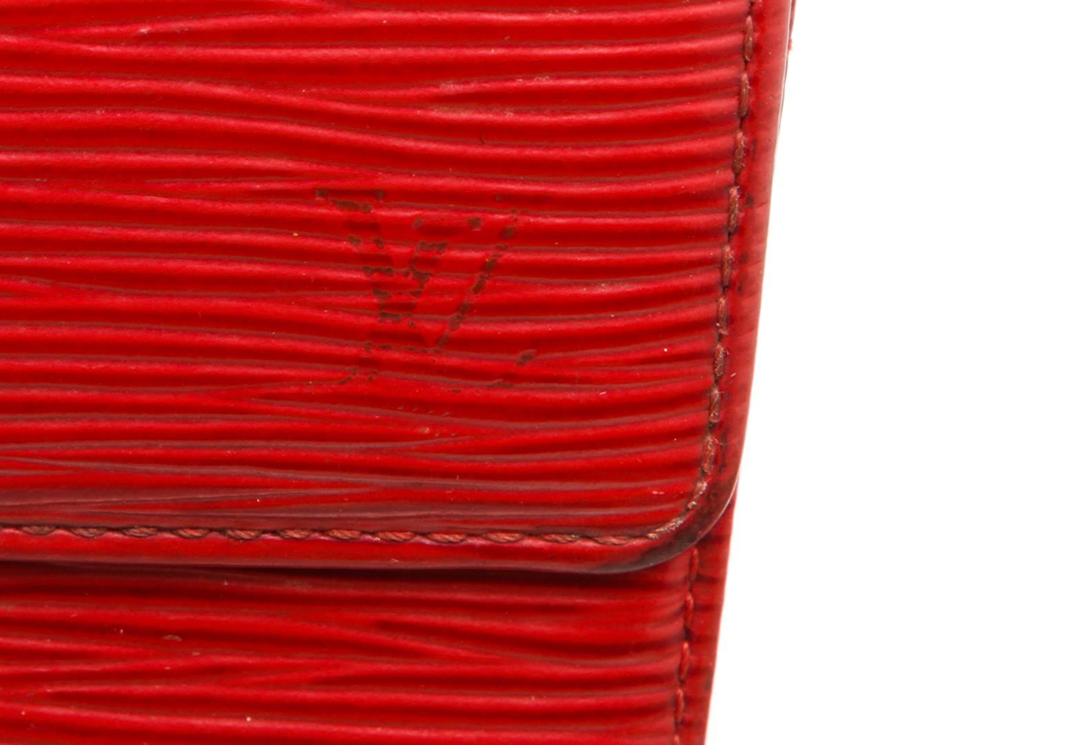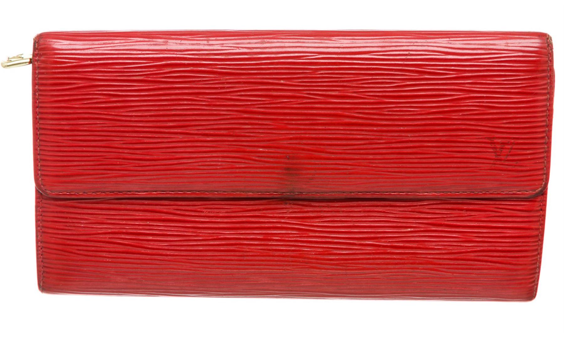 Red Epi leather Louis Vuitton Sarah wallet with brass hardware, embossed logo at corner, tonal leather lining, single interior zip pocket, single bill compartment, six card slots and snap closure at front flap. Authentic.