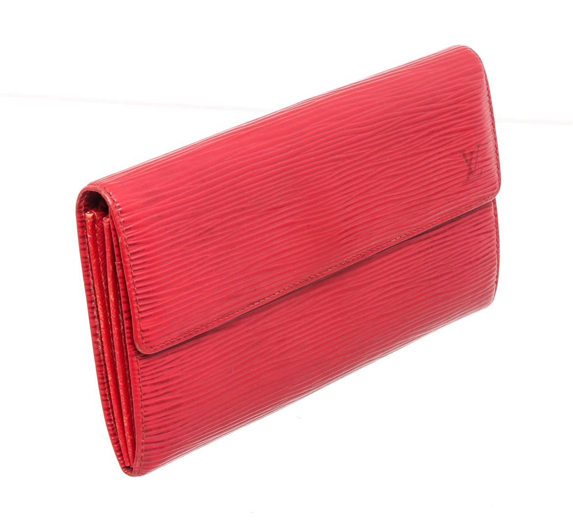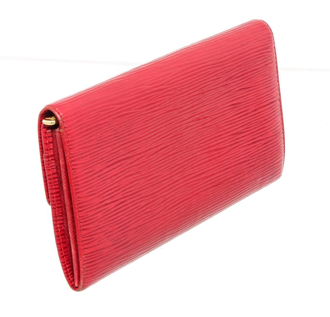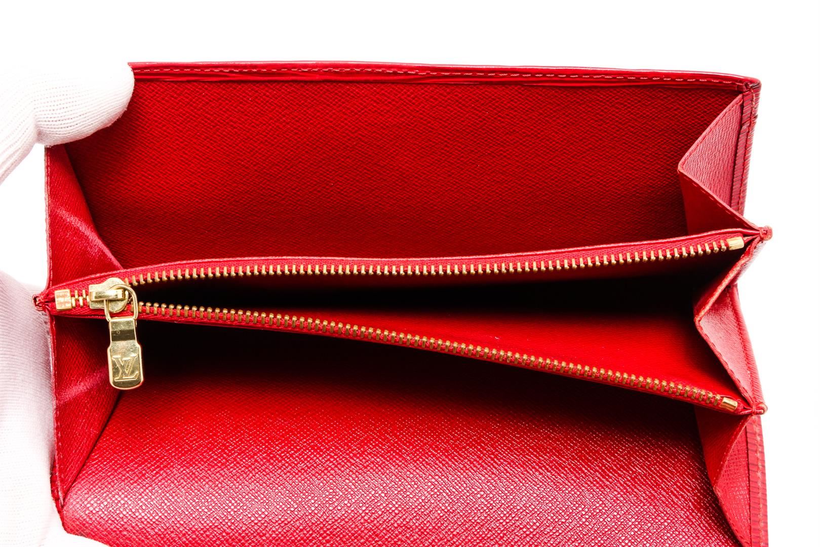 Red Epi leather Louis Vuitton Sarah wallet with brass hardware, embossed logo at corner, tonal leather lining, single interior zip pocket, single bill compartment, six card slots and snap closure at front flap.