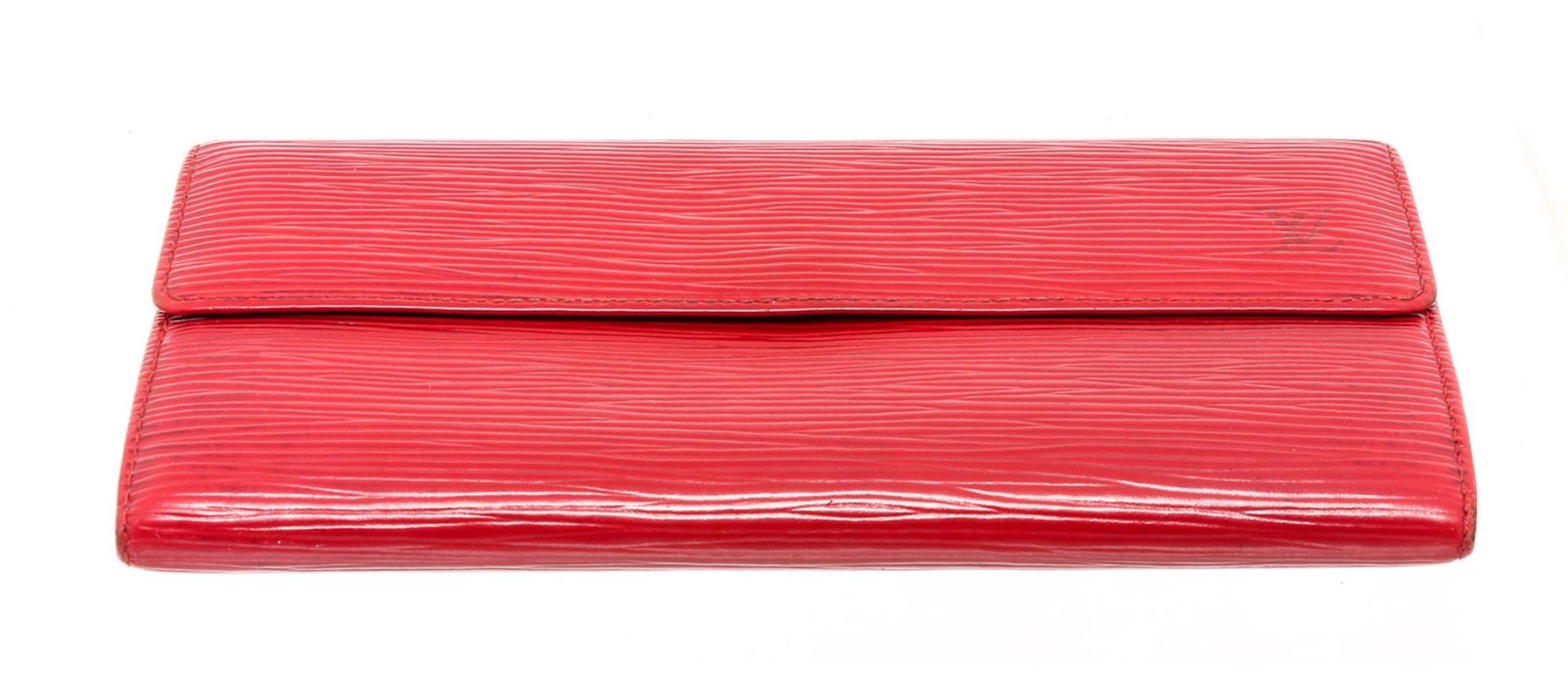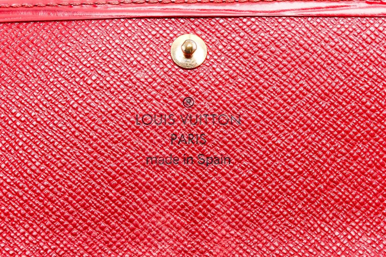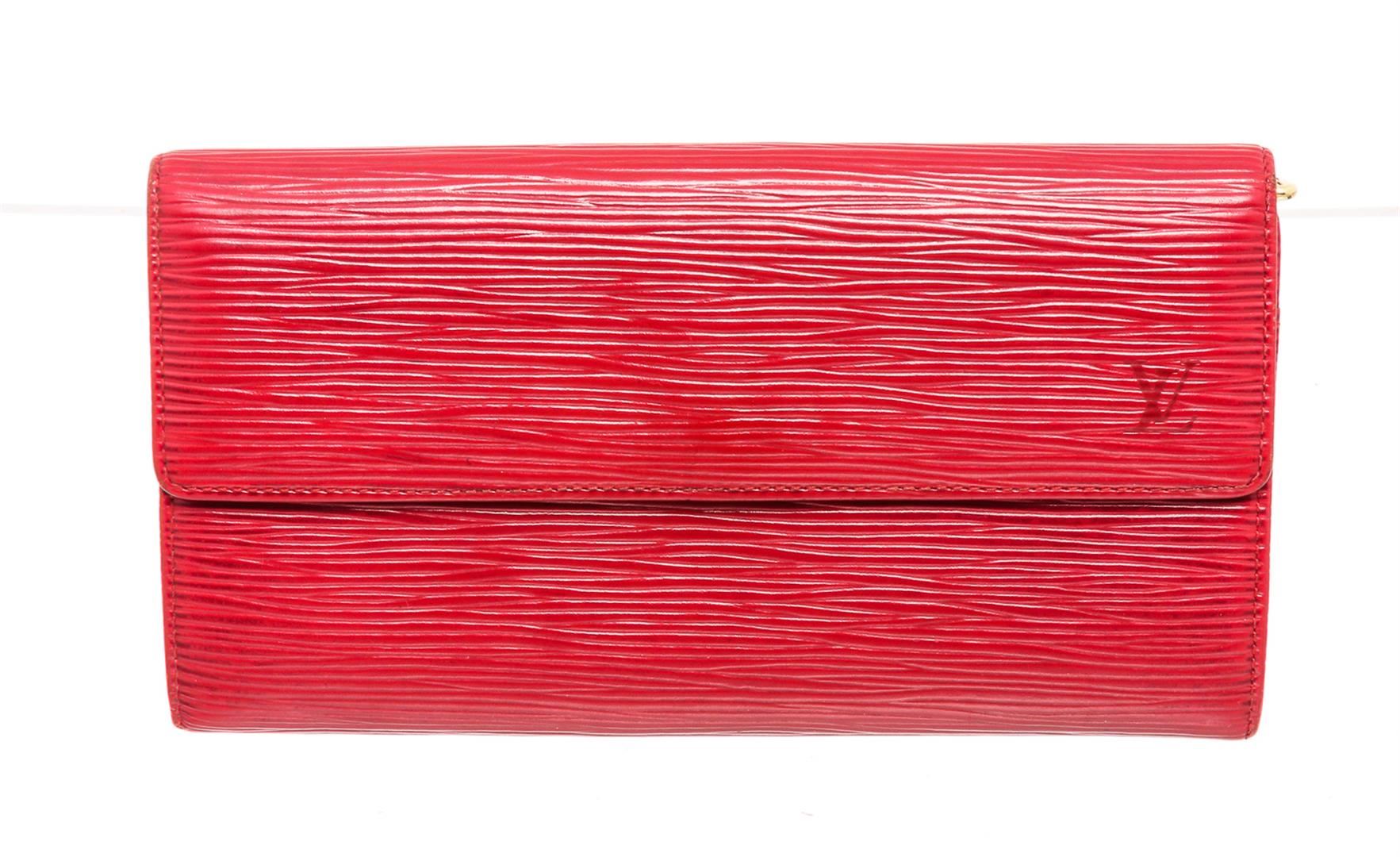 Red Epi leather Louis Vuitton Sarah wallet with brass hardware, embossed logo at corner, tonal leather lining, single interior zip pocket, single bill compartment, six card slots and snap closure at front flap.