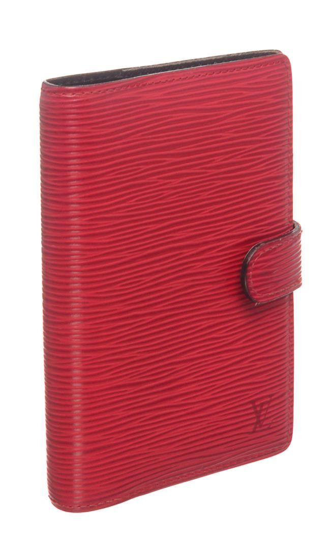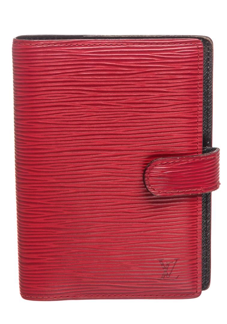 Red epi leather Louis Vuitton small ring agenda cover with brand logo at front, dual slit pockets, 3 card slots, 6 ring gold-tone hardware accents, brand stamp at interior and snap closure at front.