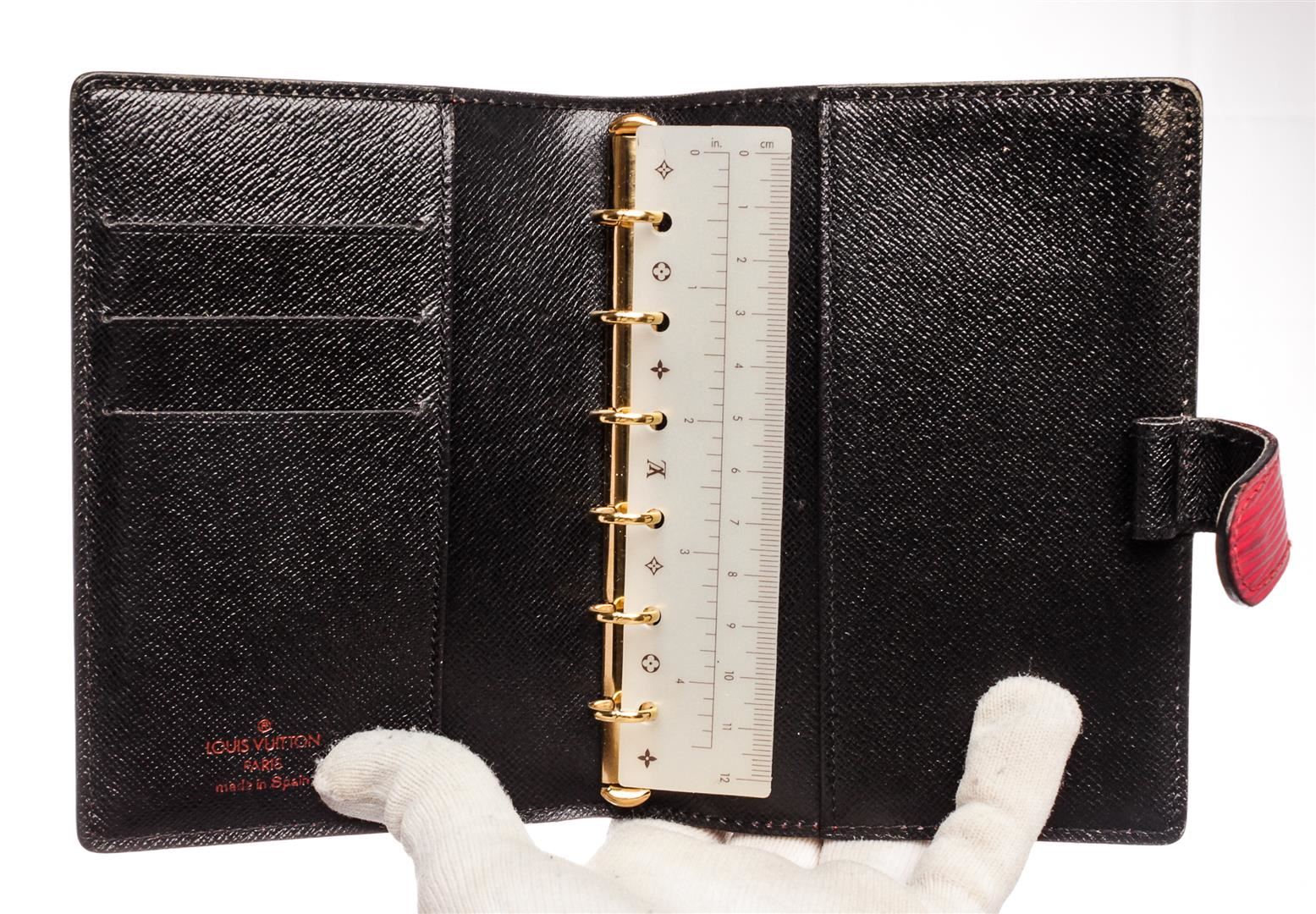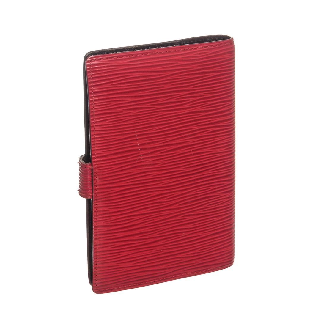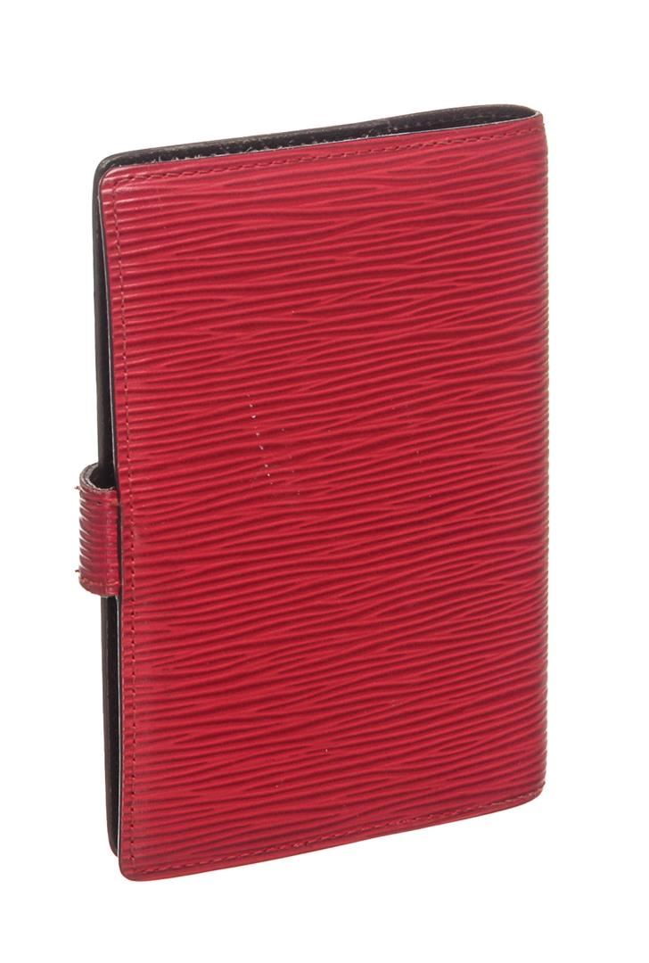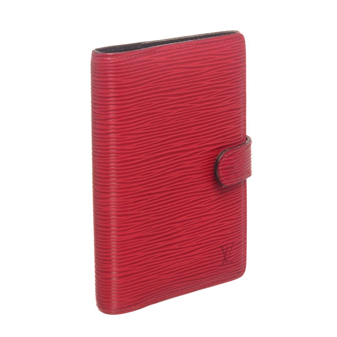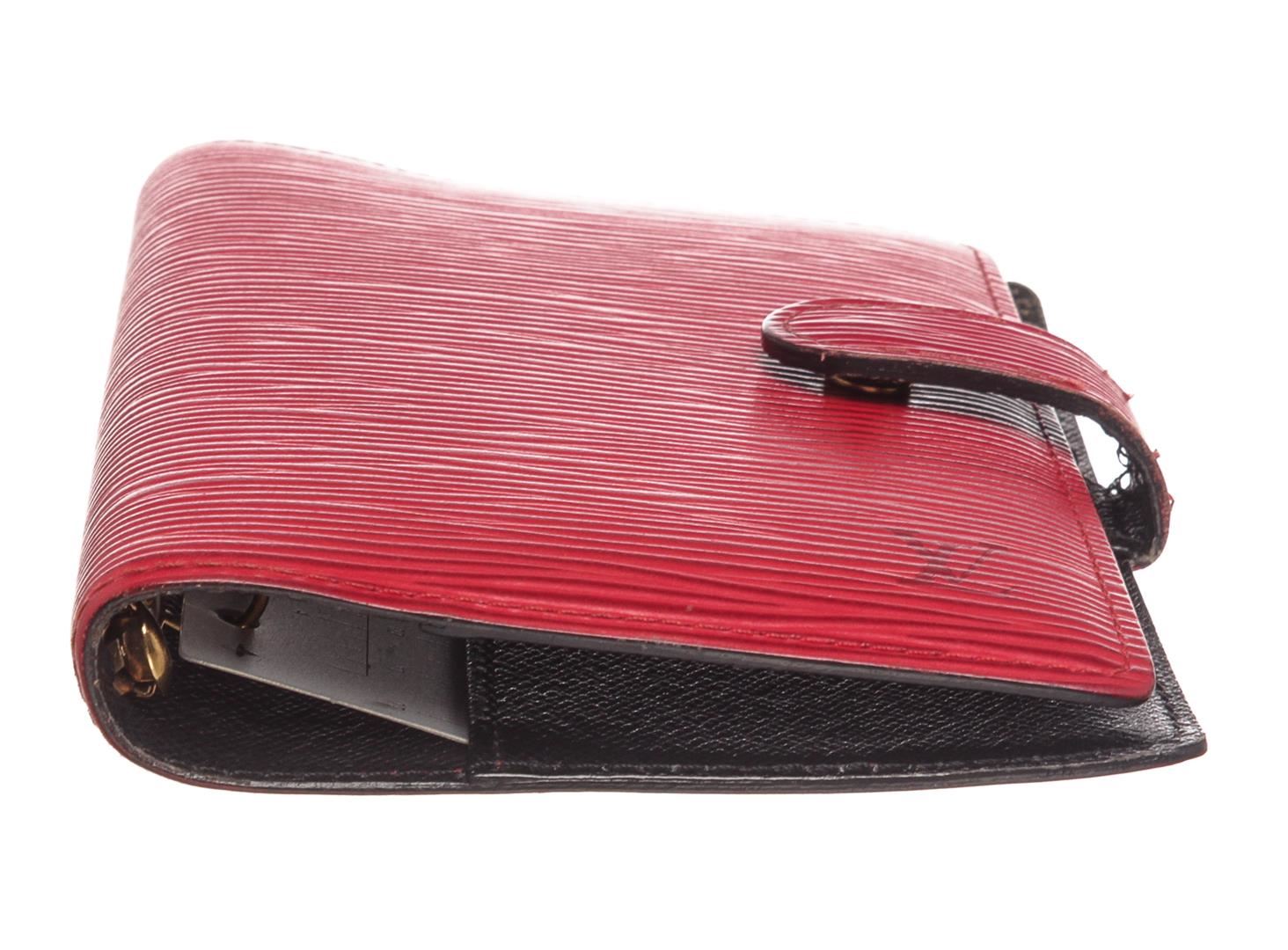 Red epi leather Louis Vuitton small ring agenda cover with brand logo at front, dual slit pockets, 3 card slots, 6 ring gold-tone hardware accents, brand stamp at interior and snap closure at front.