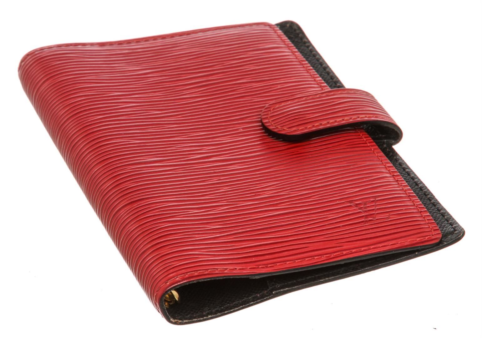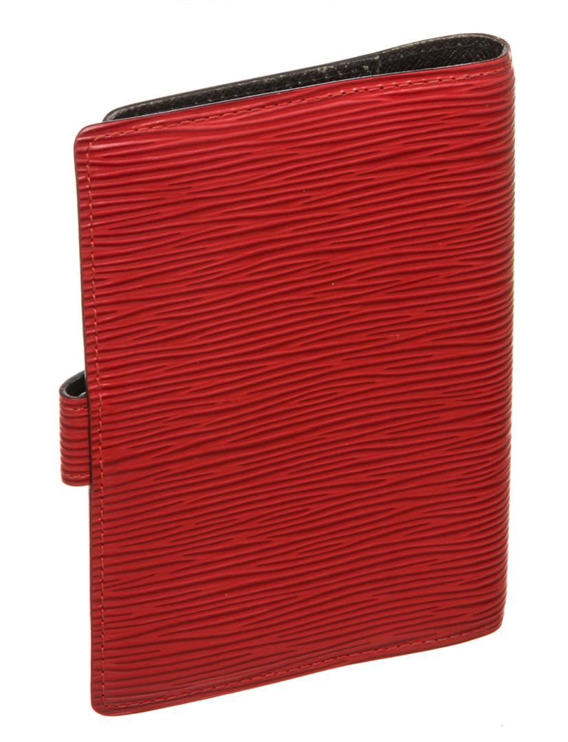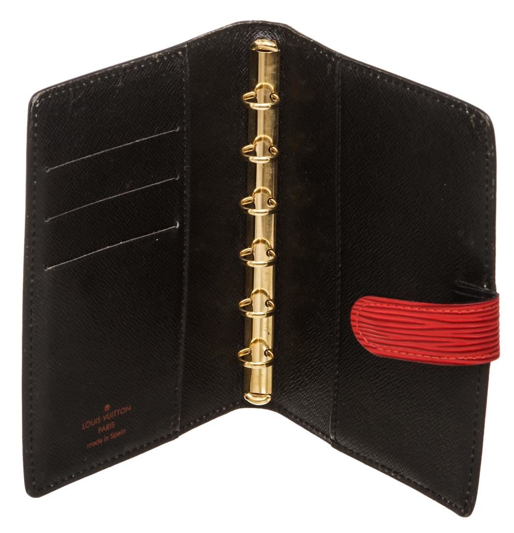 Epi leather Louis Vuitton small ring agenda cover with brand logo at front, dual slit pockets, 3 card slots, 6 ring gold-tone hardware accents, brand stamp at interior and snap closure at front. Authentic.