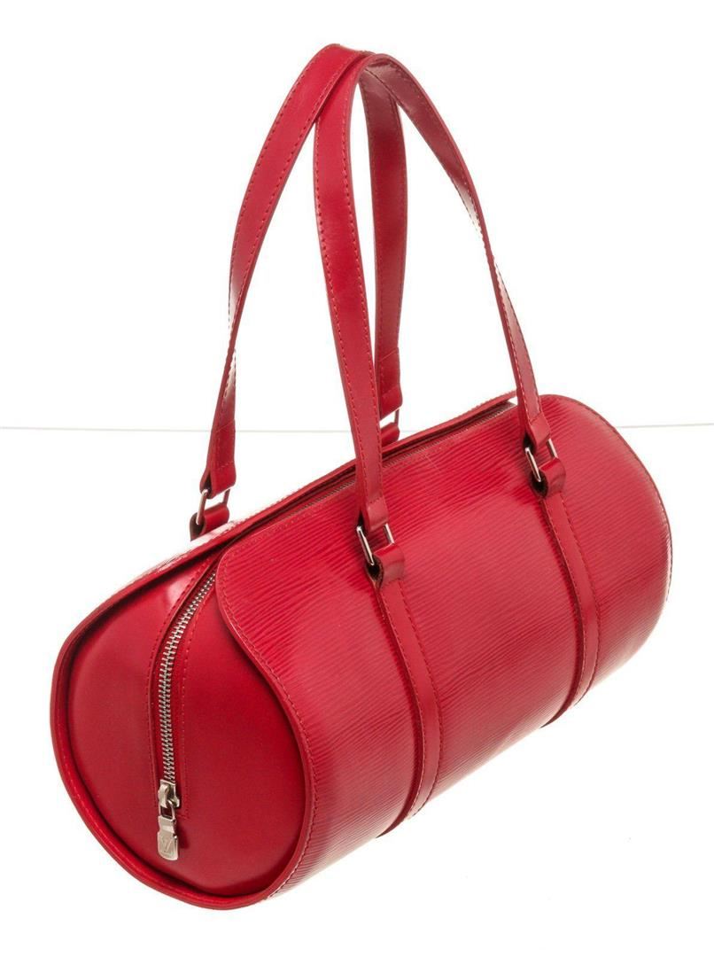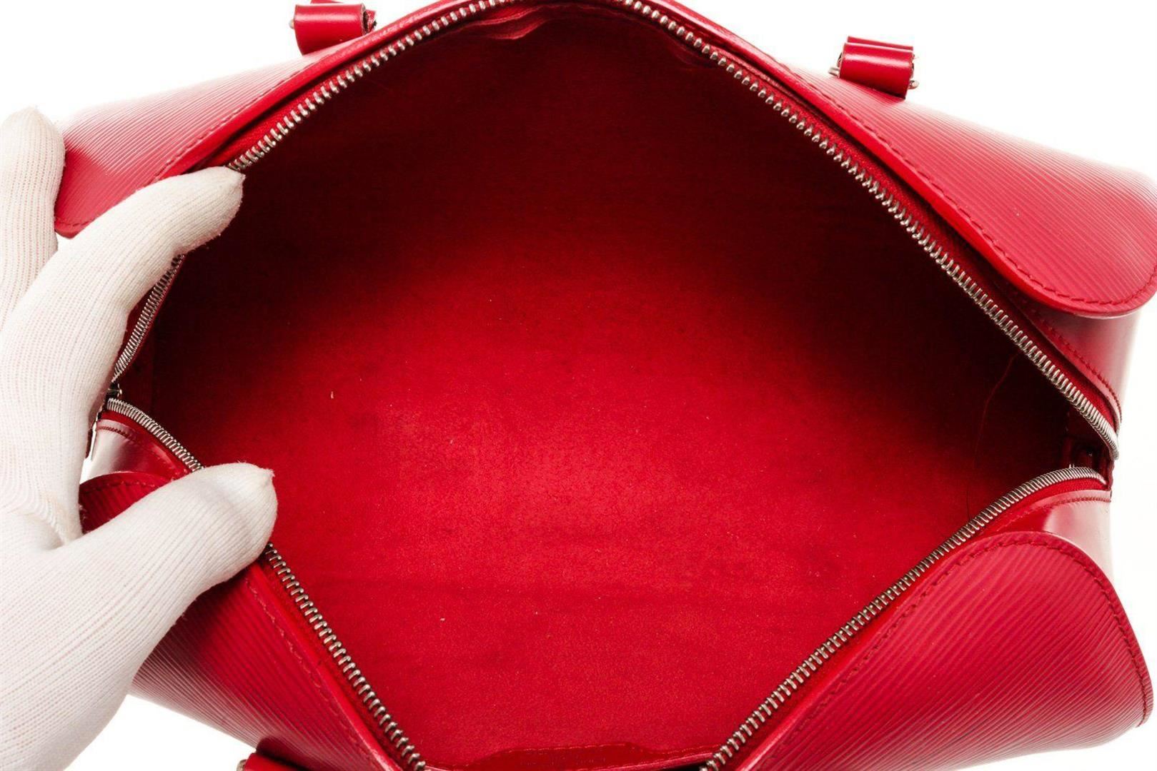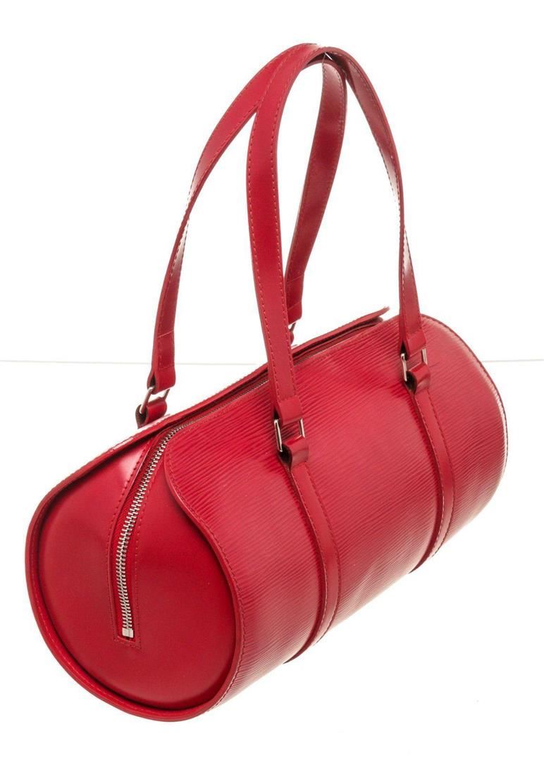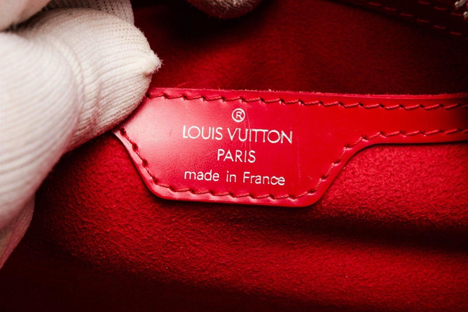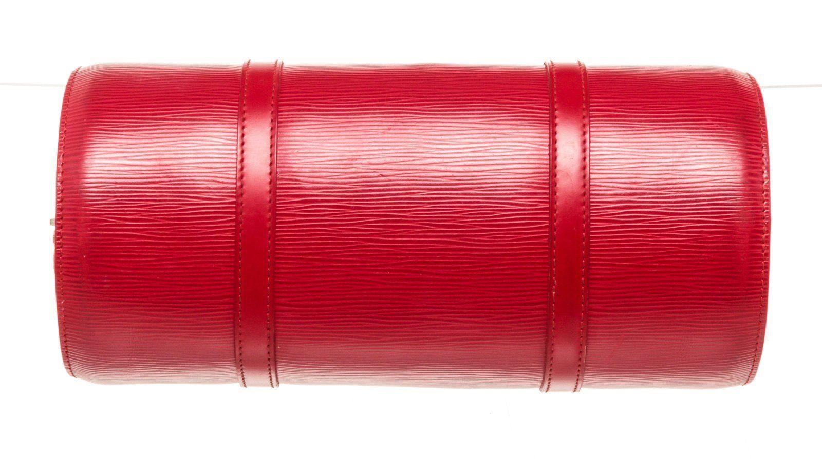Louis Vuitton Red Epi Leather Soufflot Shoulder Bag with material epi leather, gold-tone hardware, trim tan vachetta leather, interior slip pocket, shoulder strap and zipper closure.