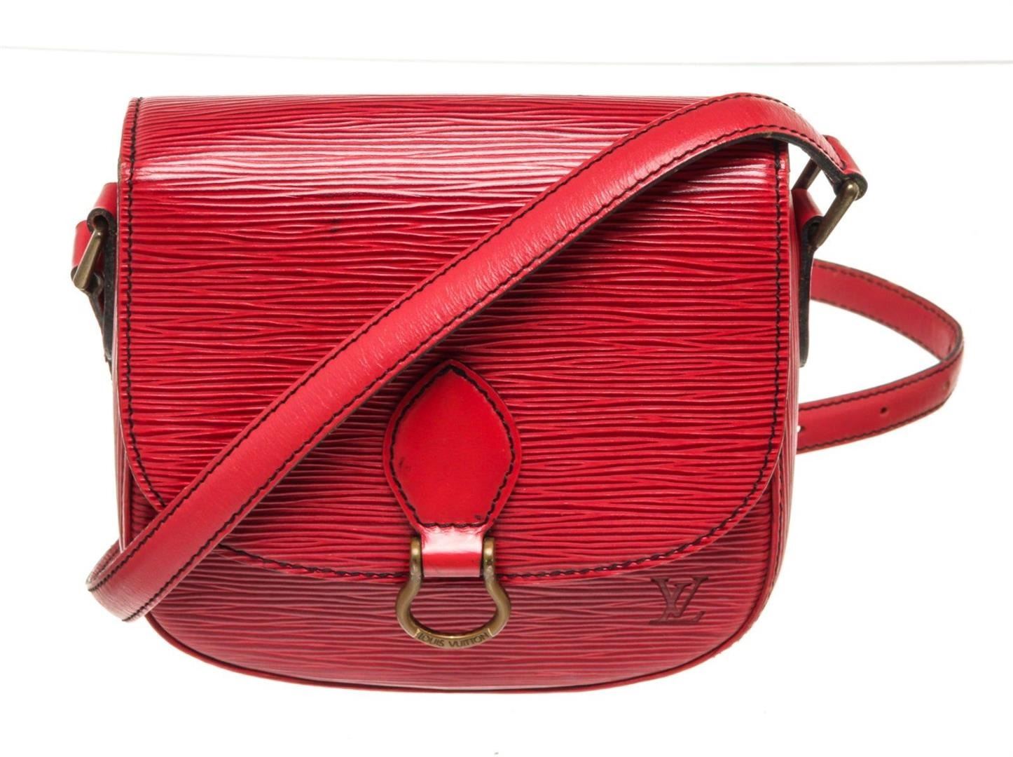 Louis Vuitton Red Epi Leather St. Cloud PM Crossbody Bag with epi leather, gold-tone hardware, trim tan vachetta leather, interior zip pocket, adjustable shoulder strap and push-lock closure.