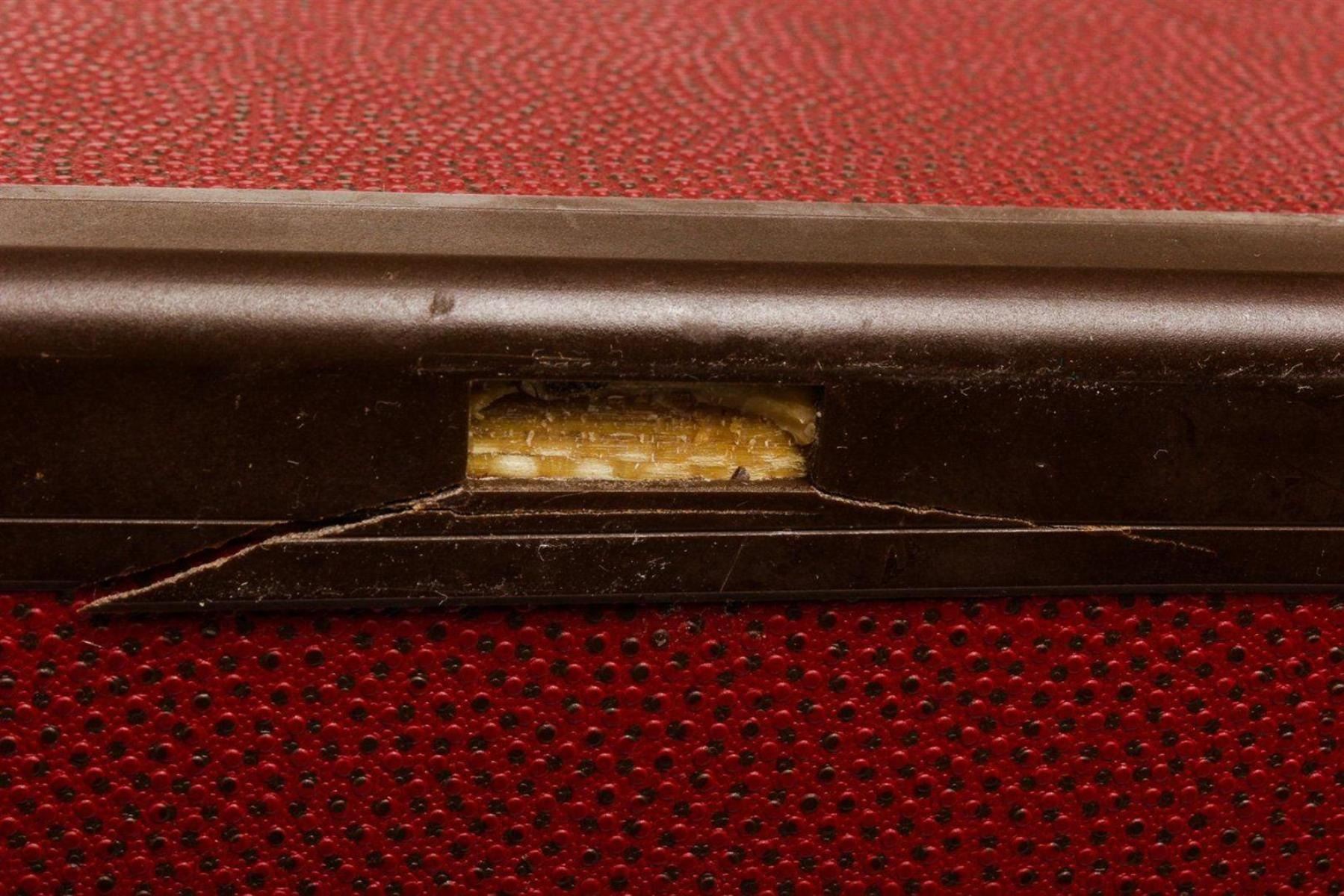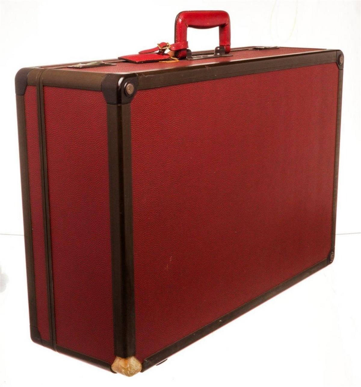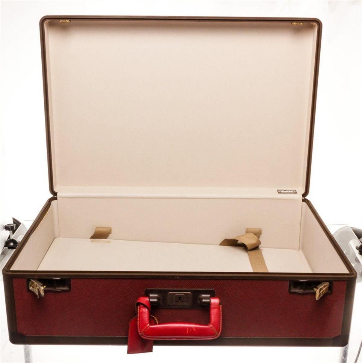 Louis Vuitton Red Leather 1887 Cup Trunk with leather trim and hardware, black and orange resin chains, black fabric interior lining, one slip pocket at interior wall and overall double zipper closure.